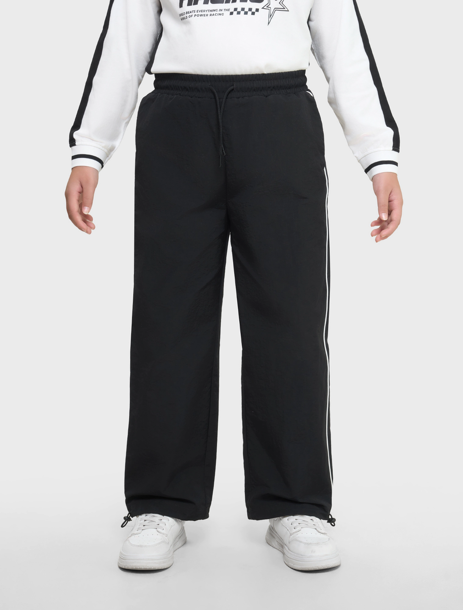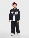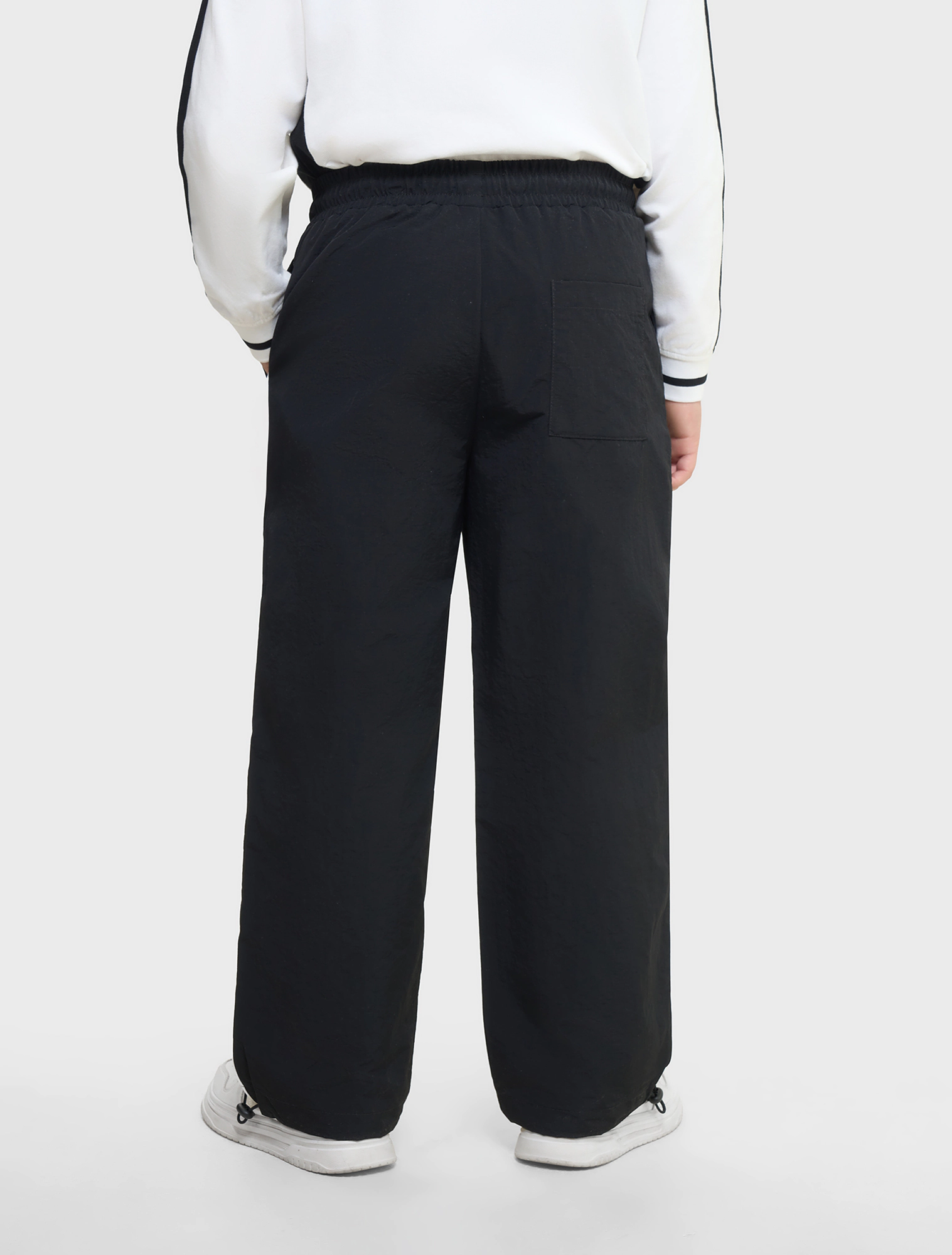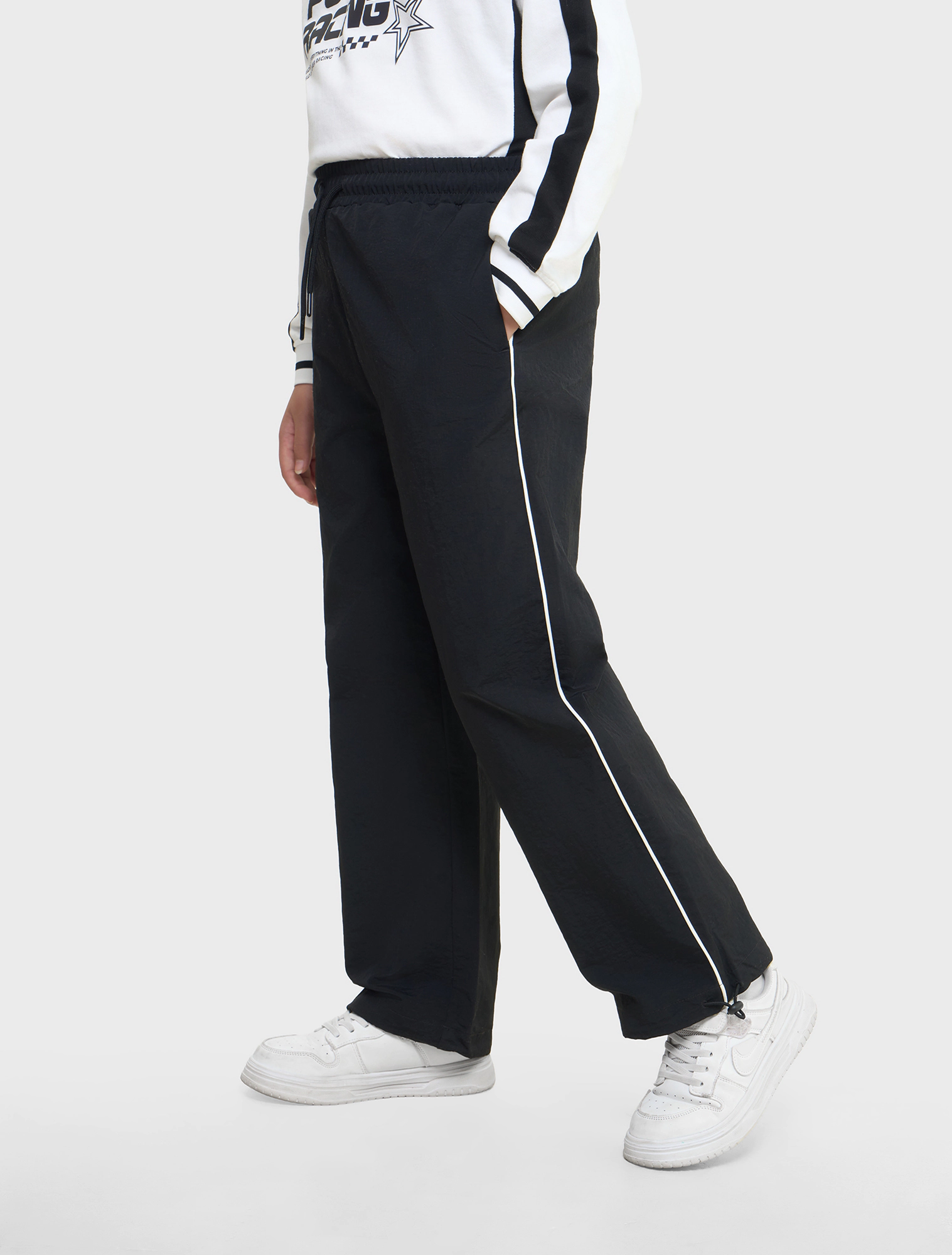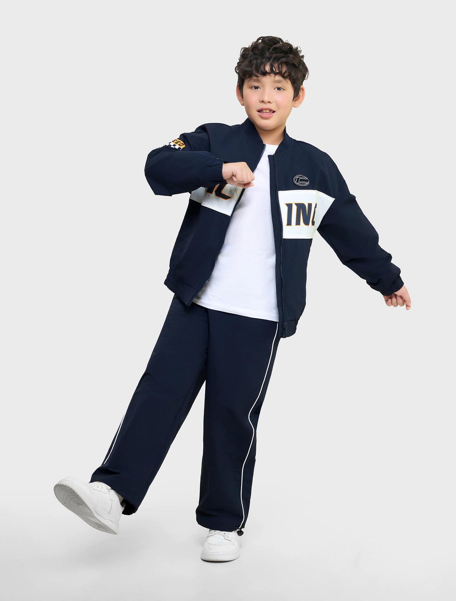 Quần gió jogger bé trai cạp chun. Túi phía trước và gấu rút chun. Chi tiết thêu ở ống quần, lé màu dọc quần.
