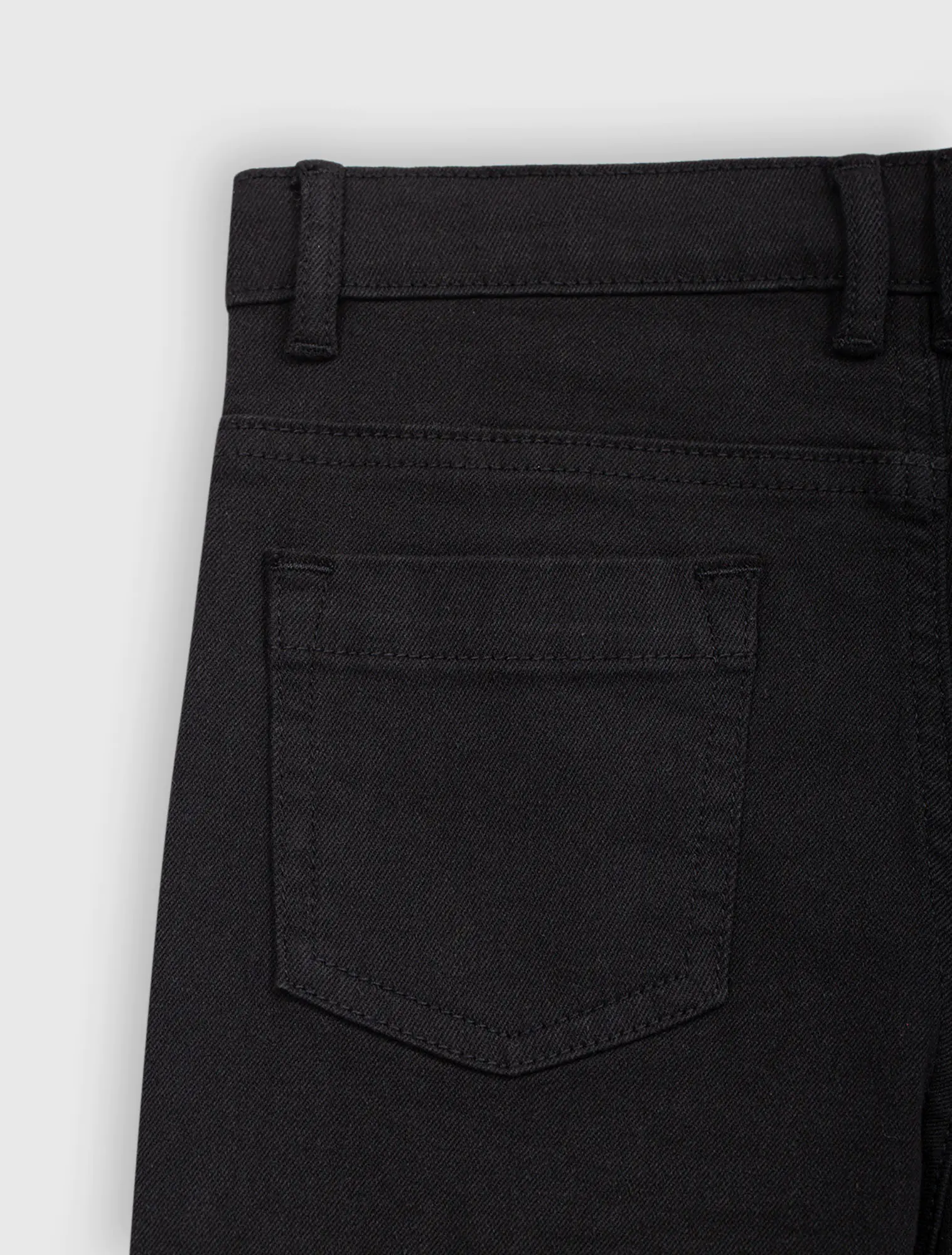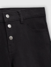 Quần jeans ống loe, cạp luồn thun bên trong, có thể tăng giảm, cài khuy phía trước. Có 5 túi với 2 gốc màu đen và xanh.
