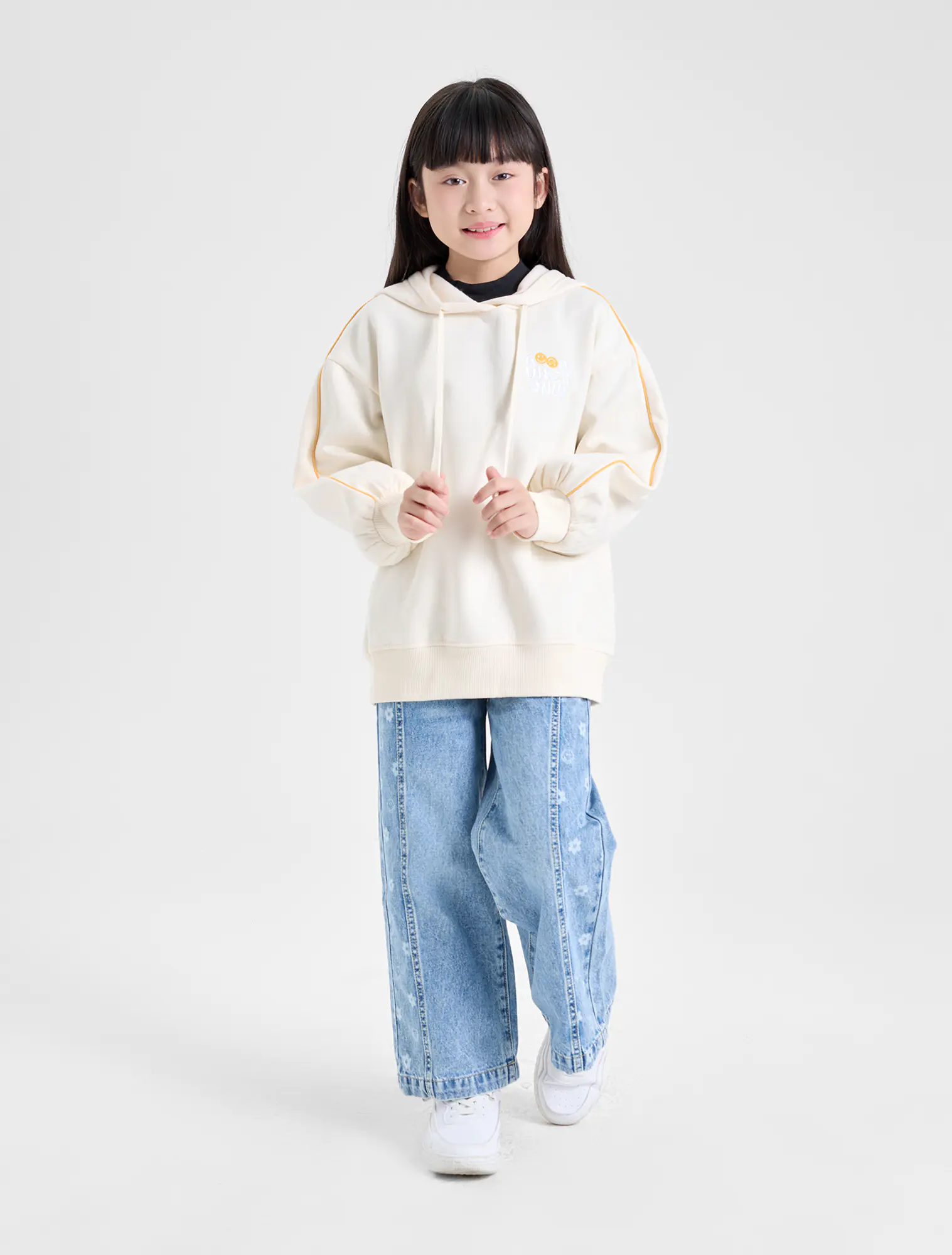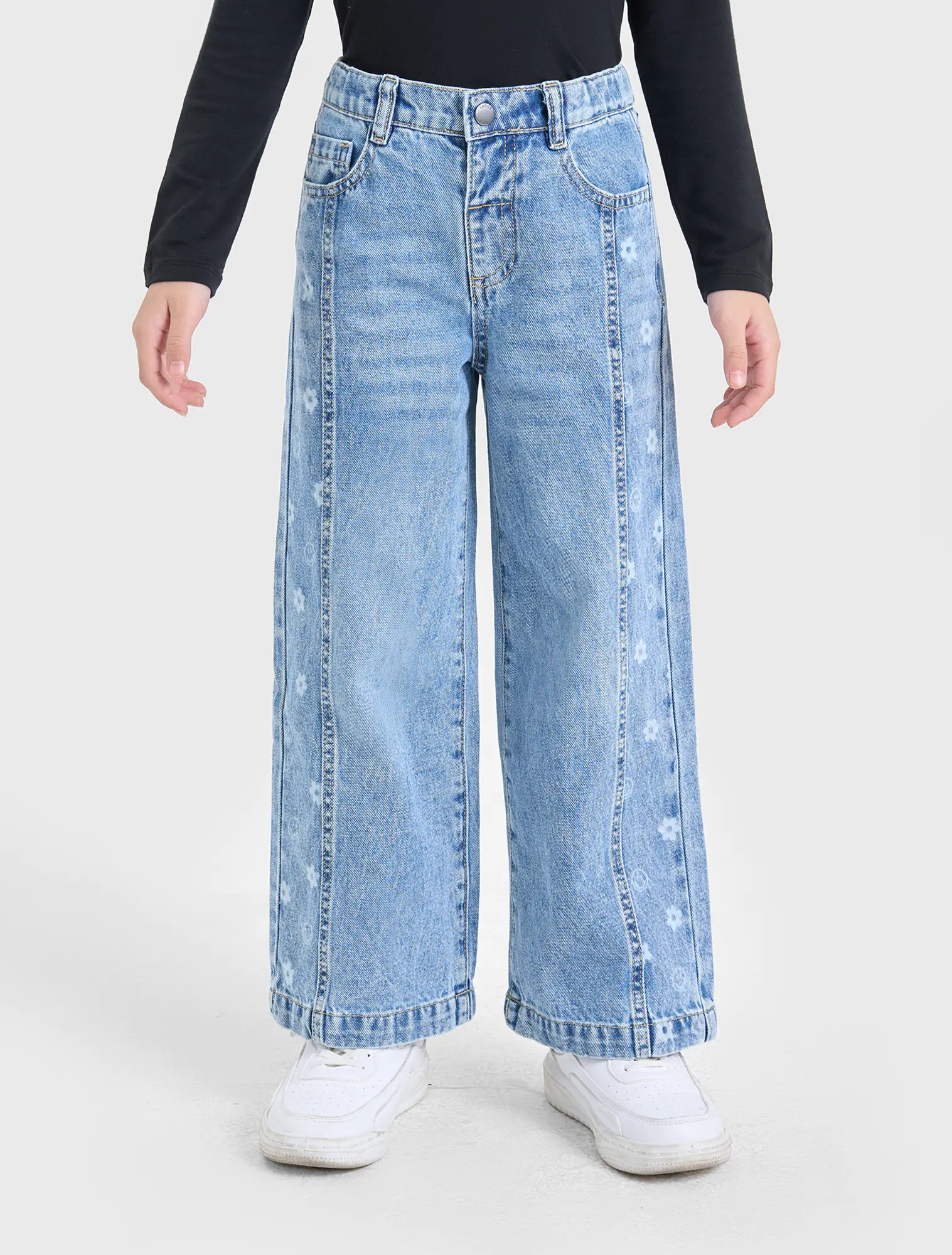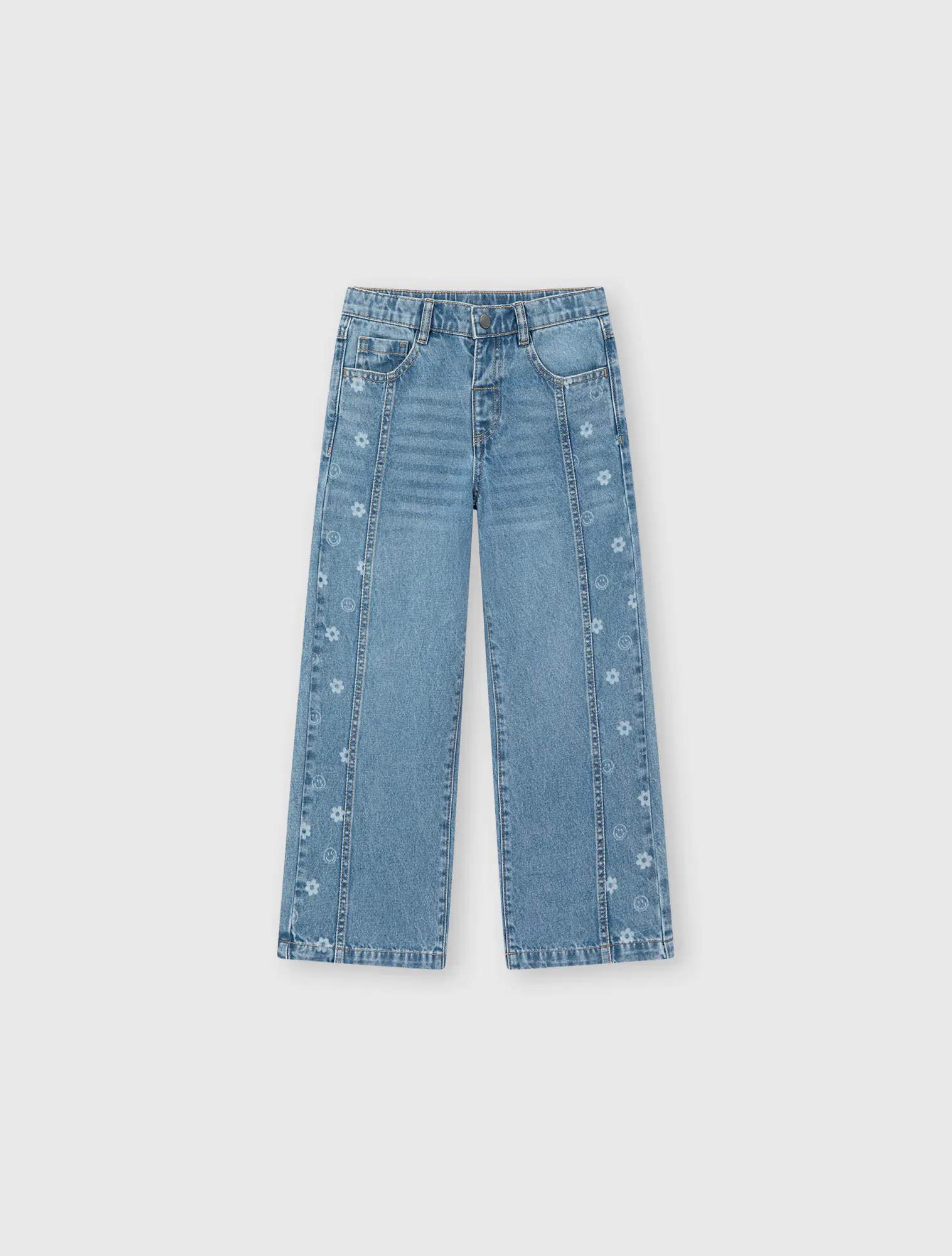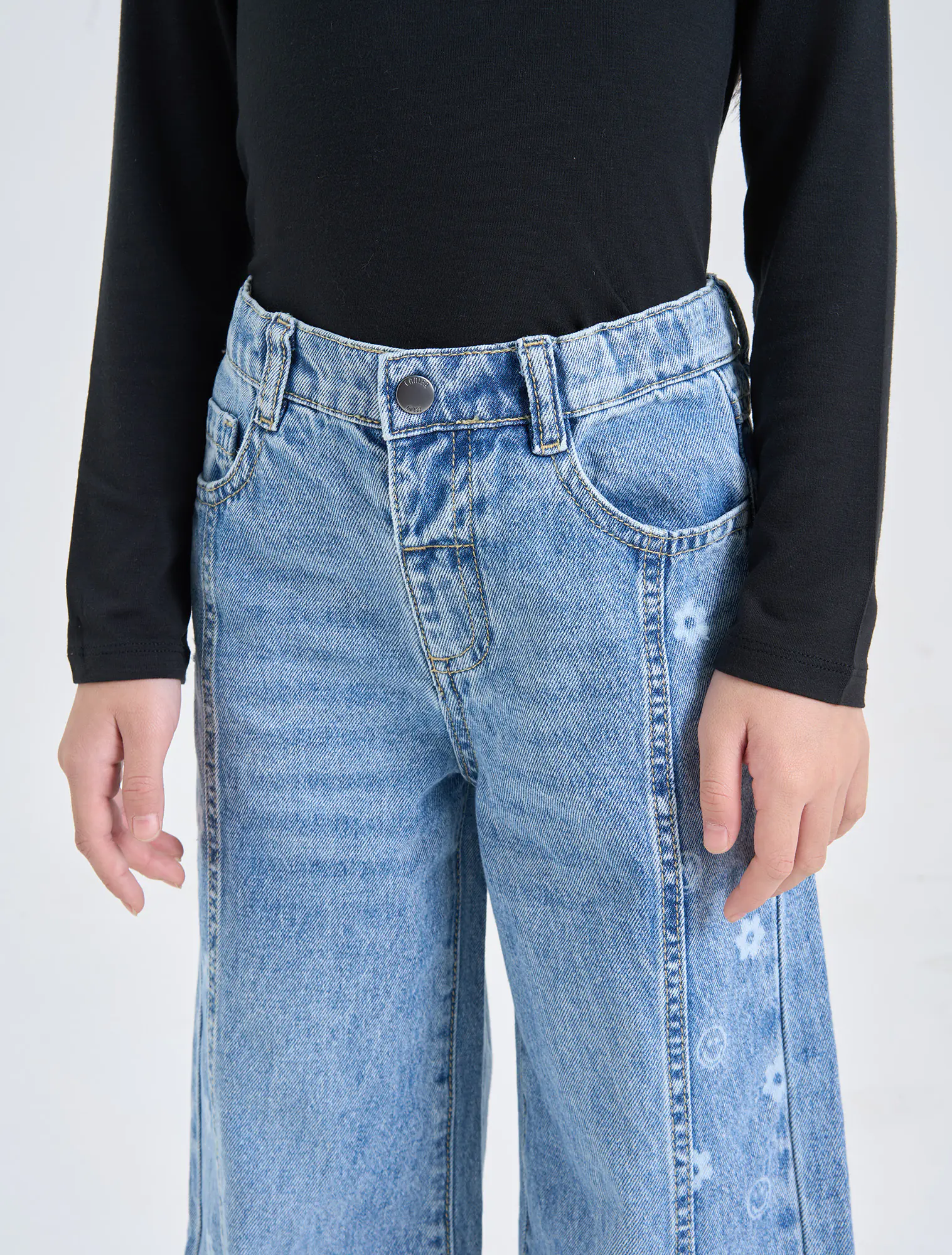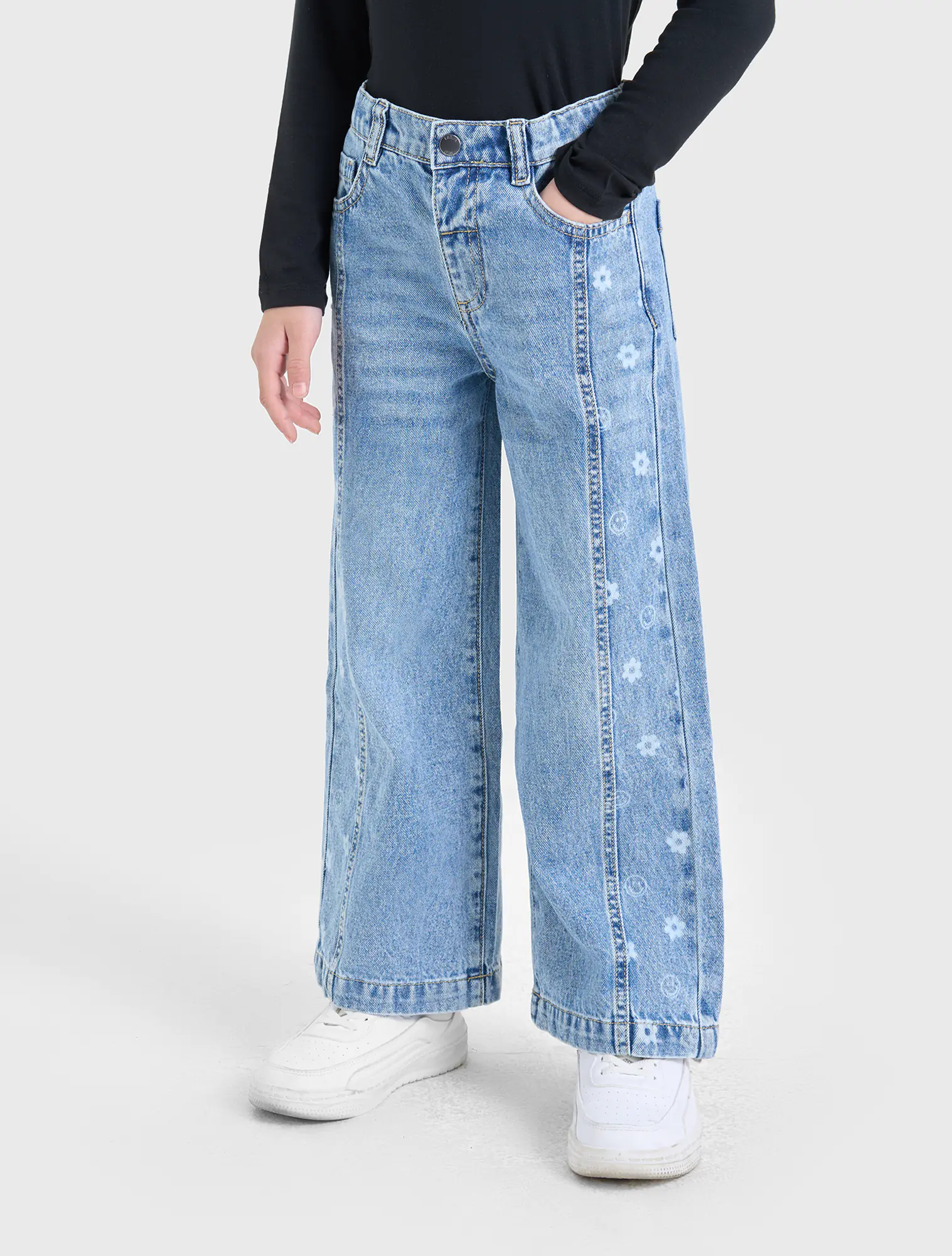Quần jeans dáng suông, chất liệu cotton, có hình in dọc 2 bên quần. Phù hợp phối với nhiều loại trang phục cho bé gái.