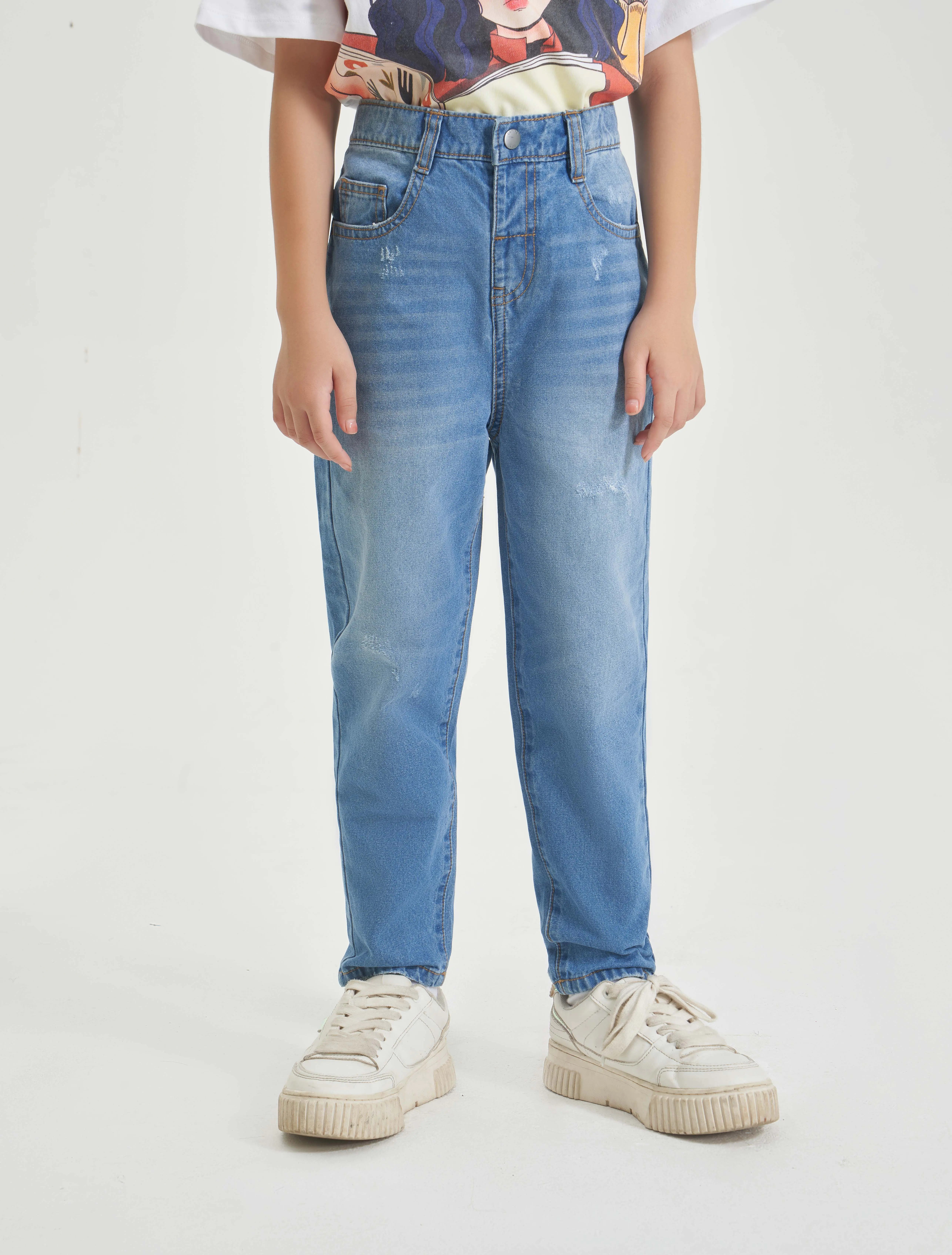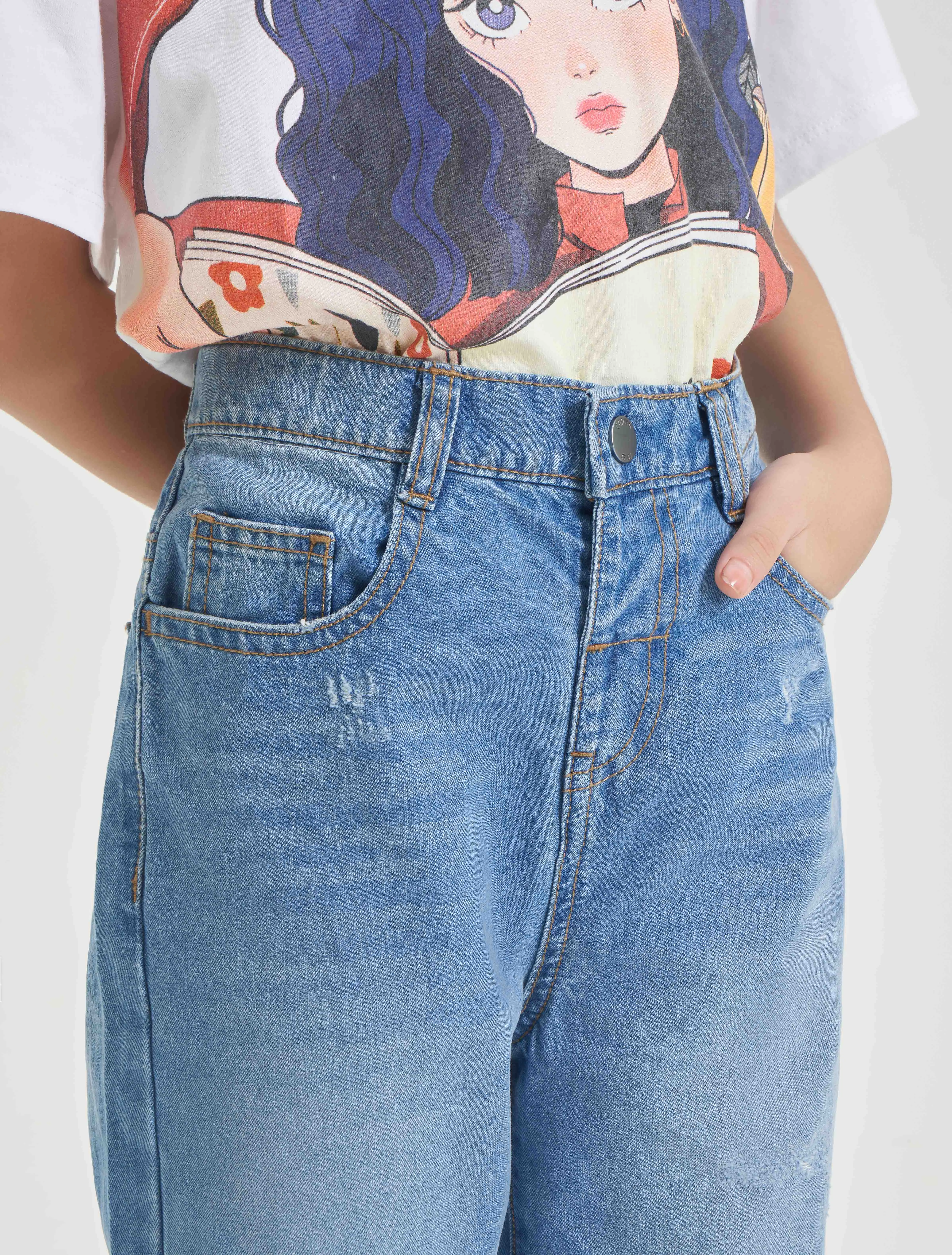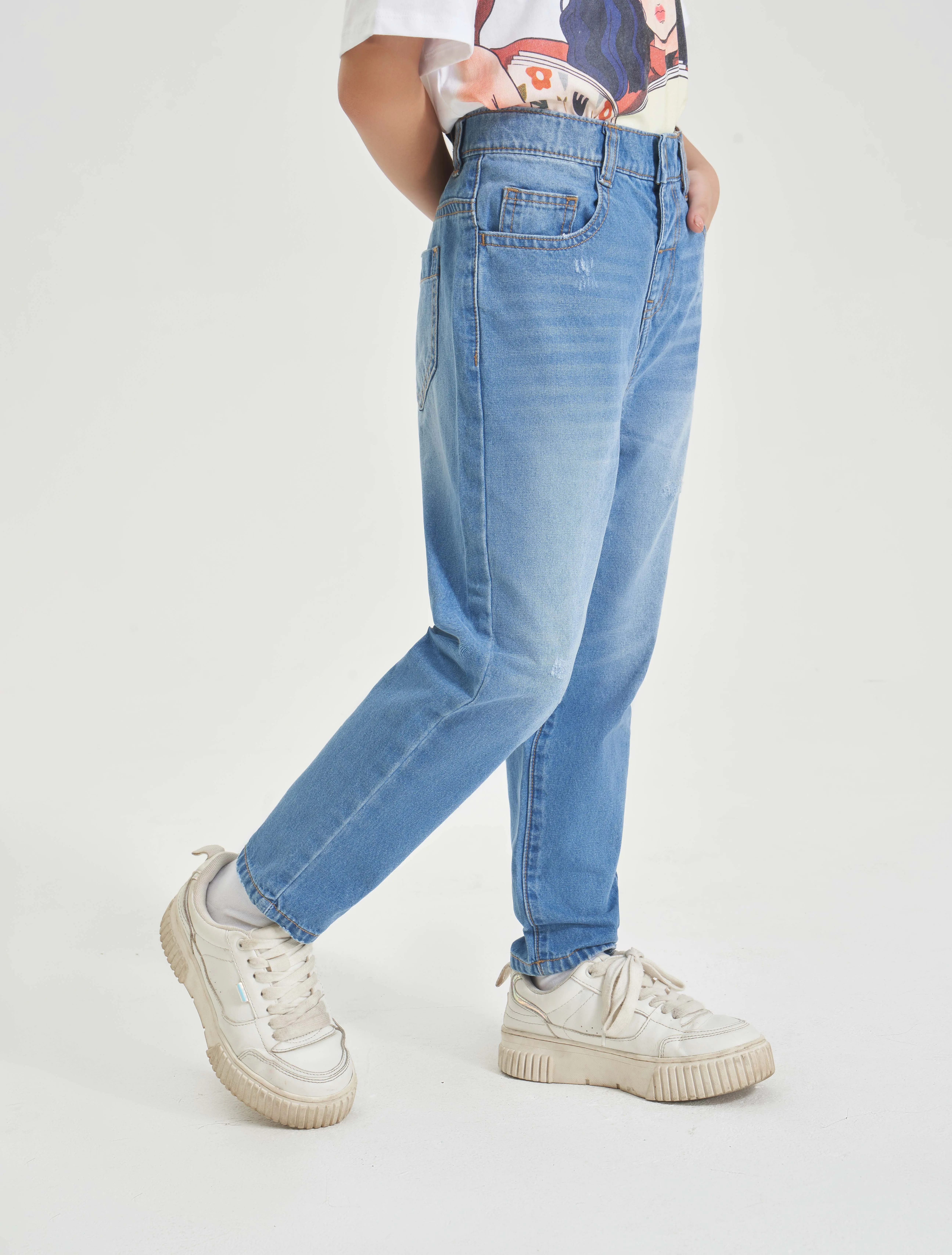 Quần jeans 5 túi chất liệu cotton, dài ngang mắt cá bằng denim. Dáng rộng với cạp cao, nẹp khoá kéo và khuy và ống hơi côn.