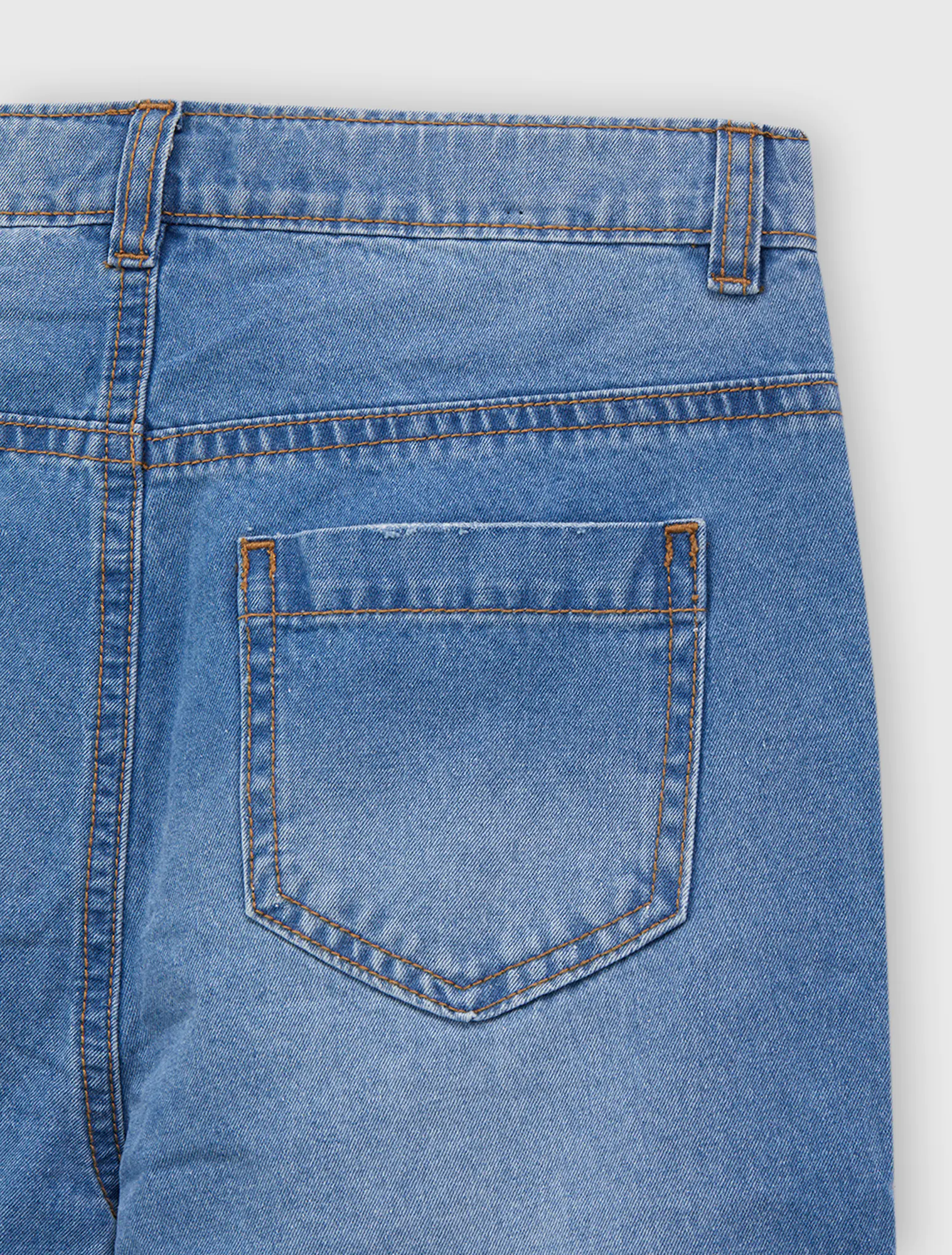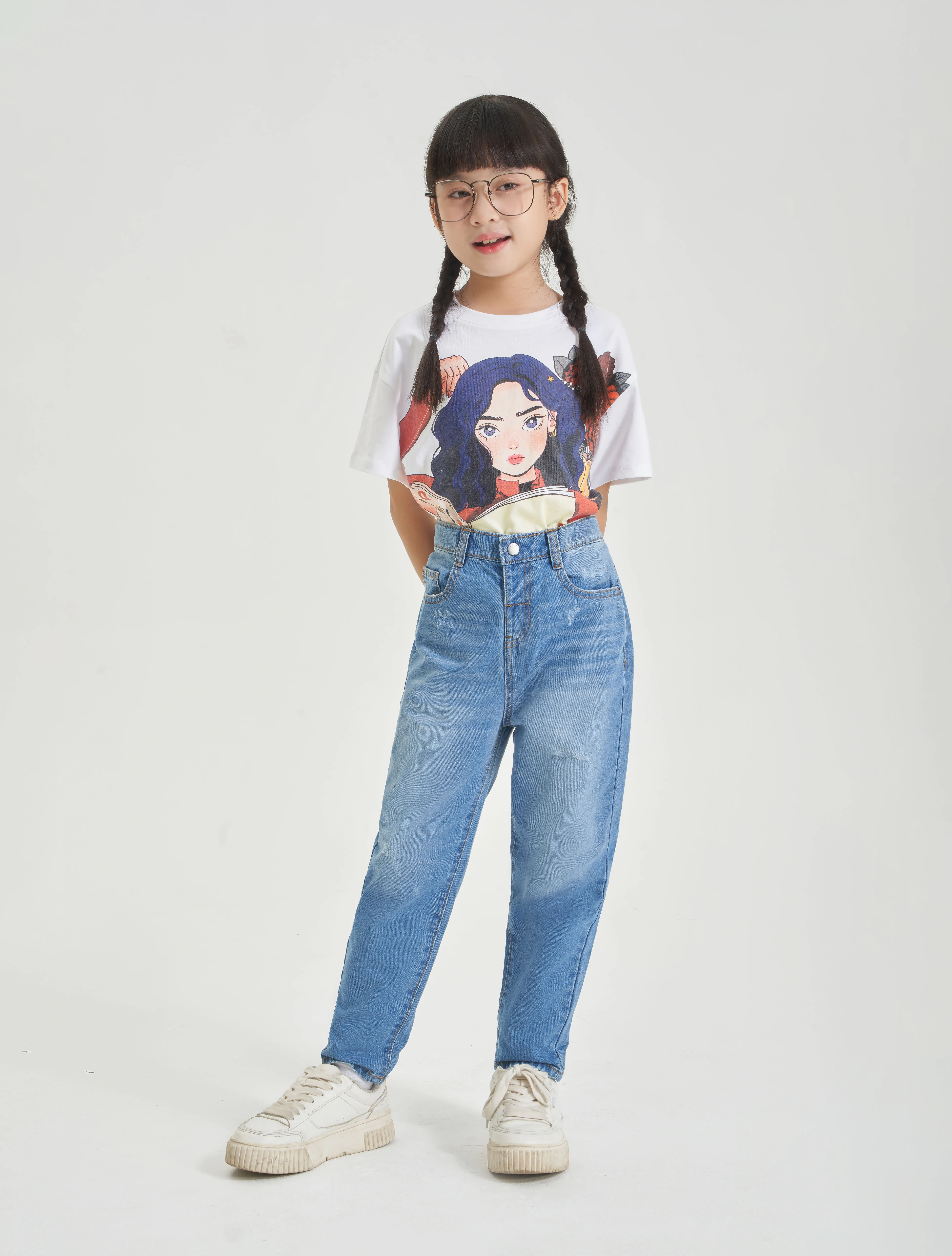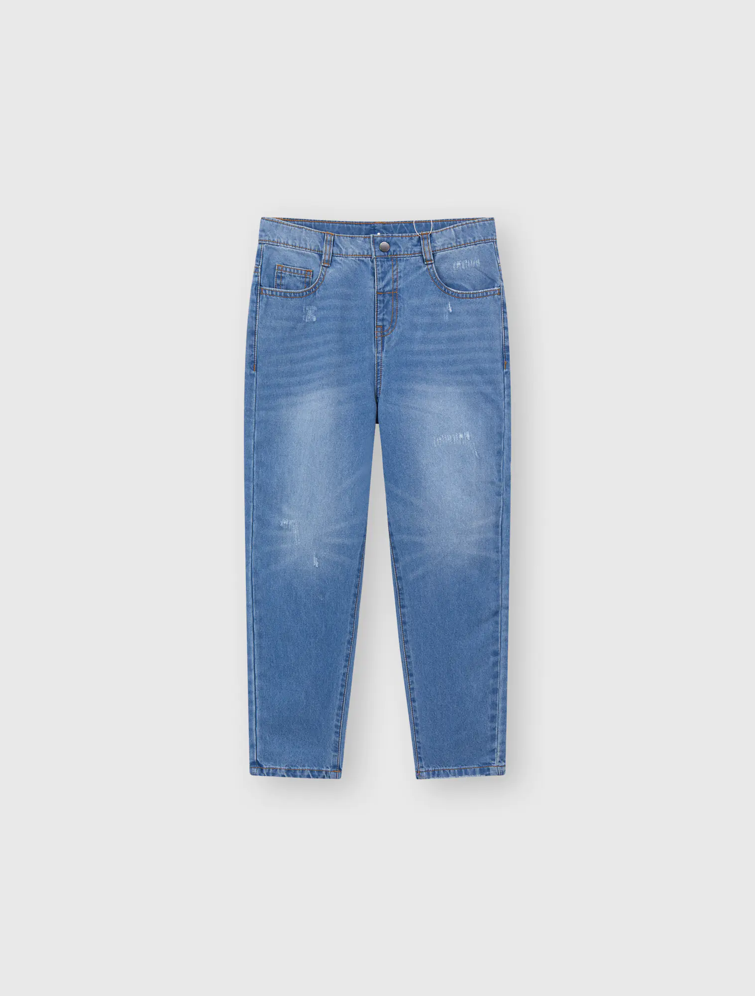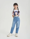 Quần jeans 5 túi chất liệu cotton, dài ngang mắt cá bằng denim. Dáng rộng với cạp cao, nẹp khoá kéo và khuy và ống hơi côn.