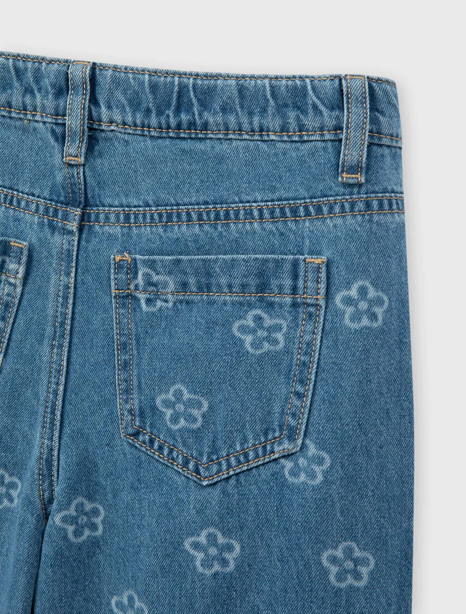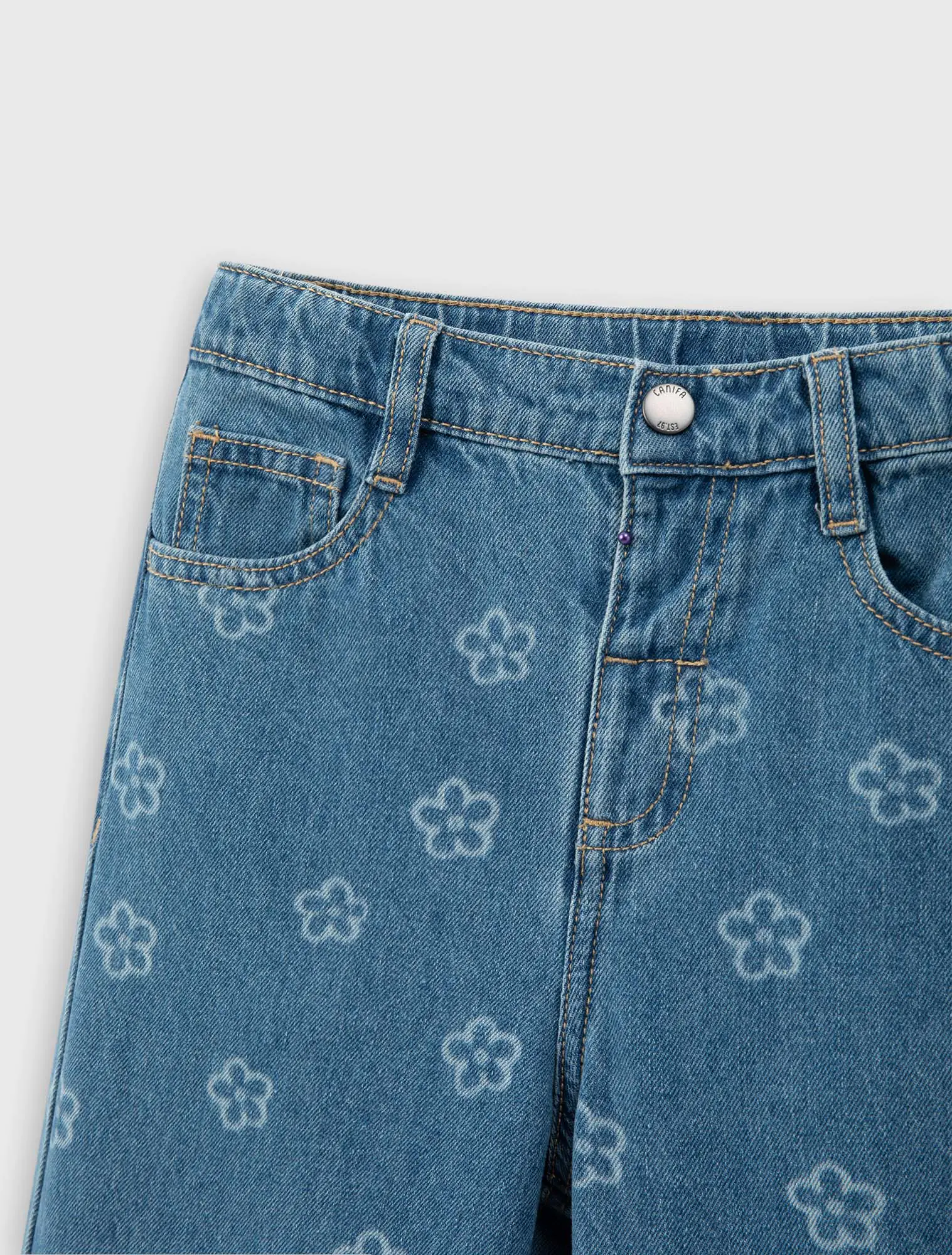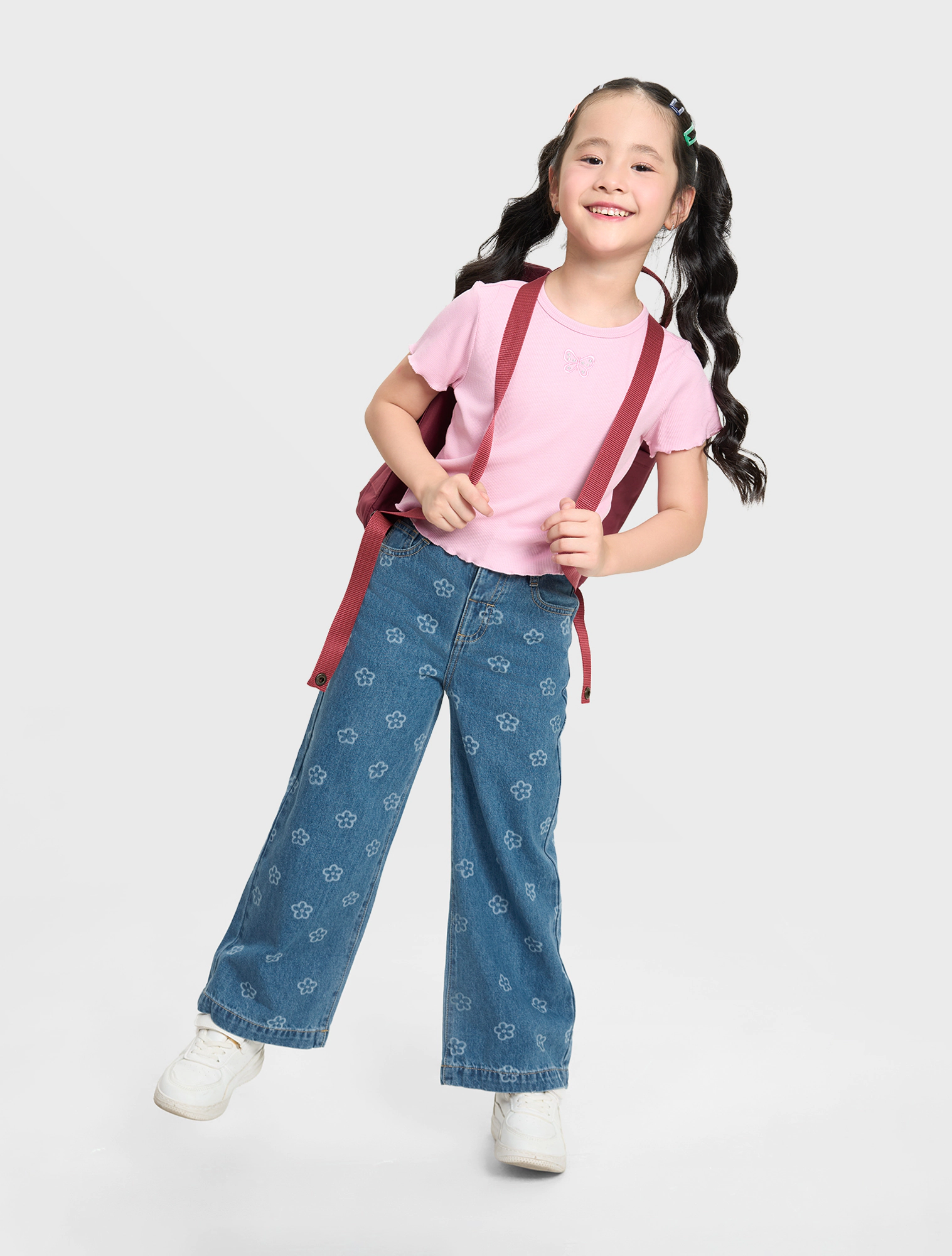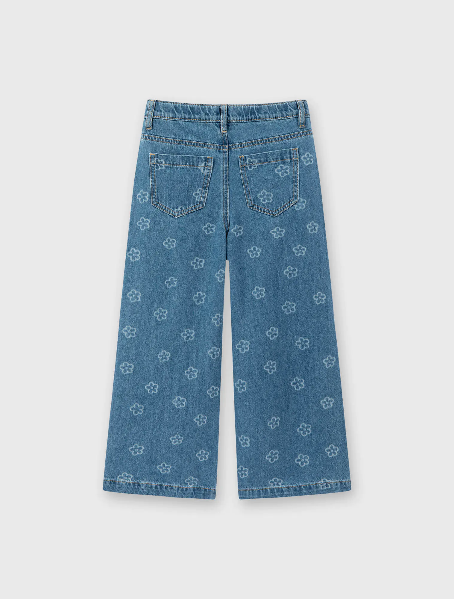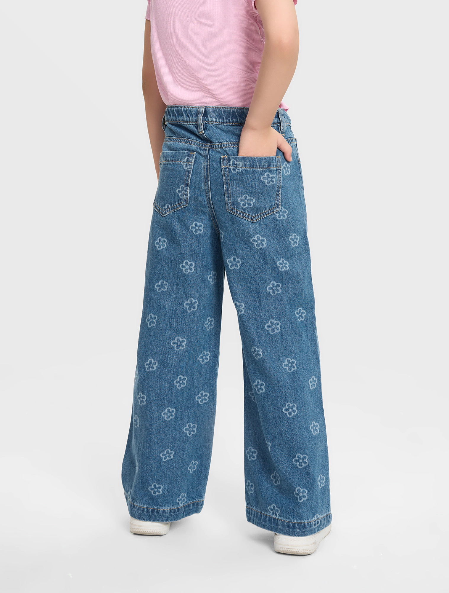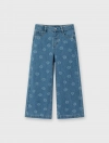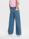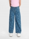 Quần jeans bé gái 5 túi, ống rộng, có họa tiết in tràn. Cạp cao với chun co giãn điều chỉnh được. Ống quần dáng xuông rộng. Phù hợp với nhiều hoàn cảnh sử dụng.