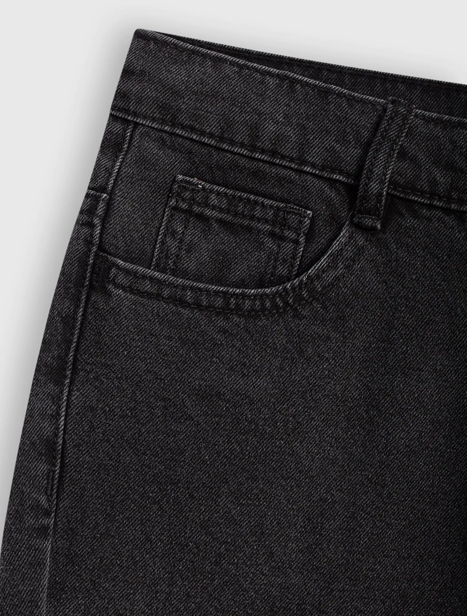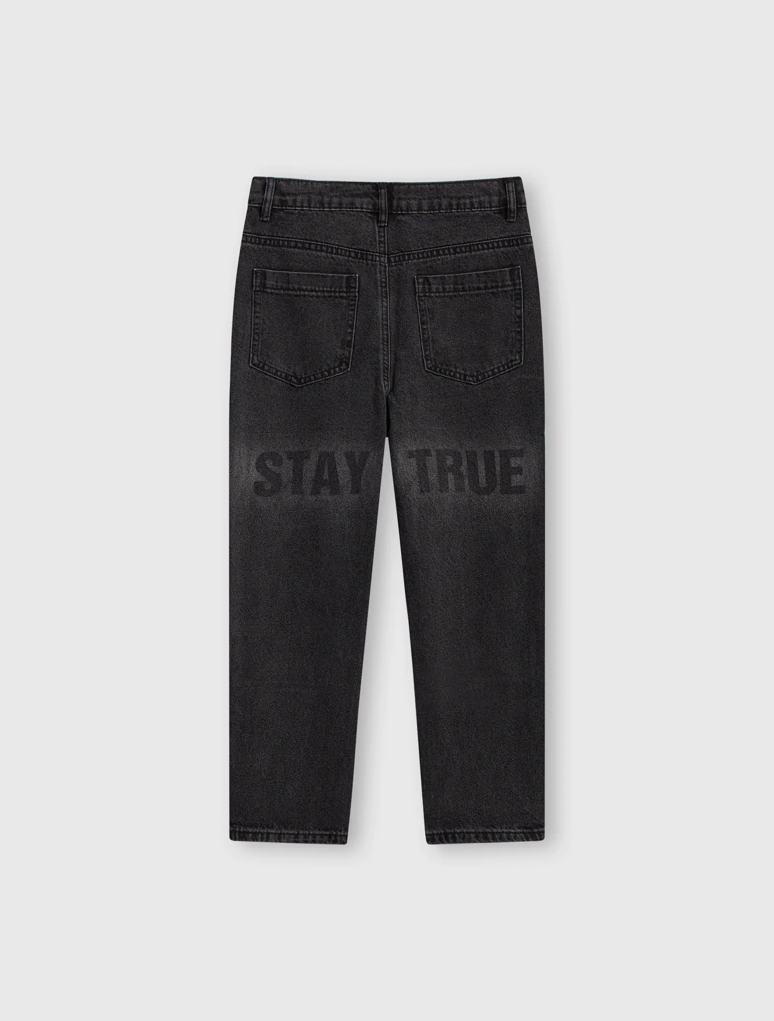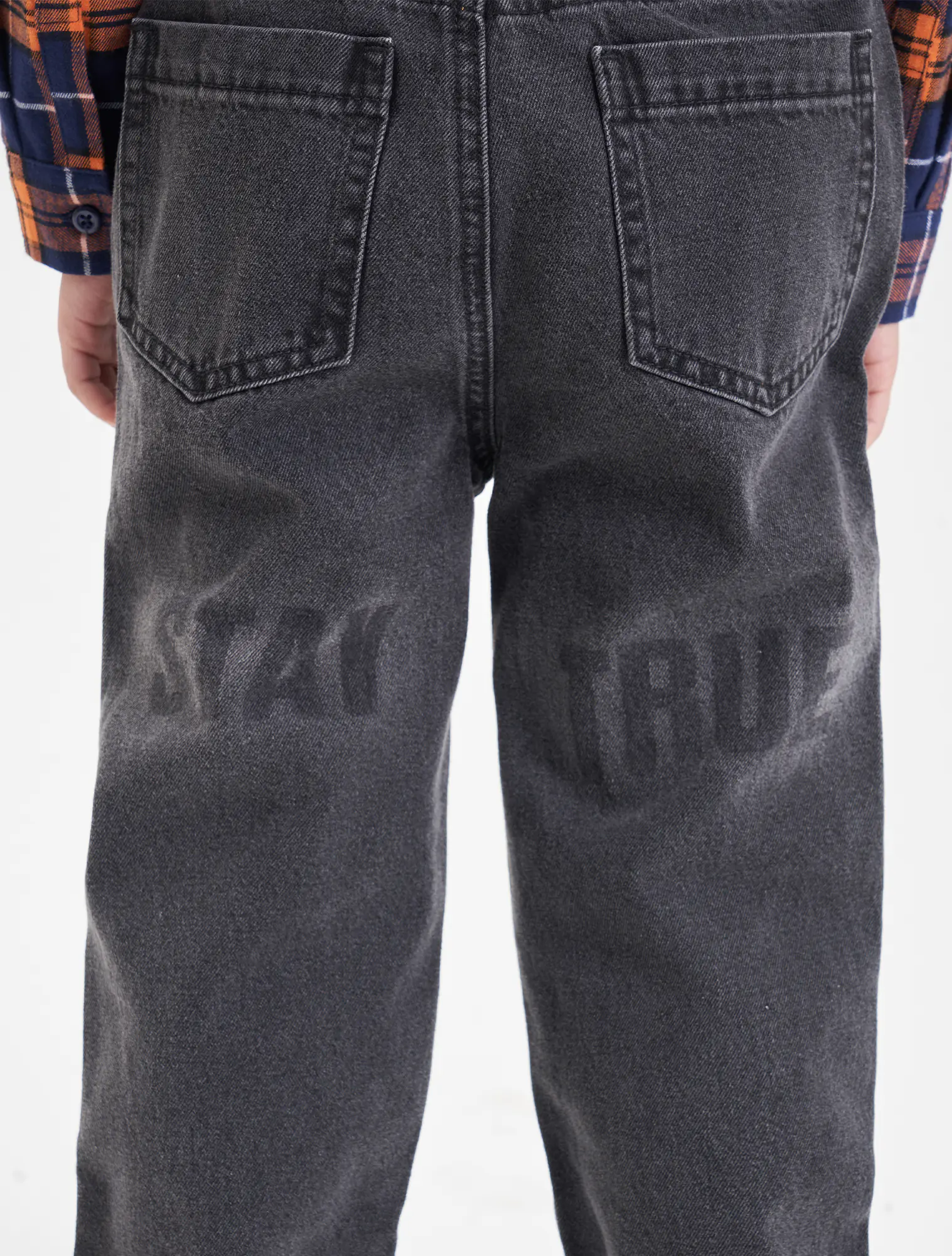 Quần jeans dáng balloon fit, co giãn, cạp co giãn, cài khuy bấm phía trước, thân sau in lazer thười trang.