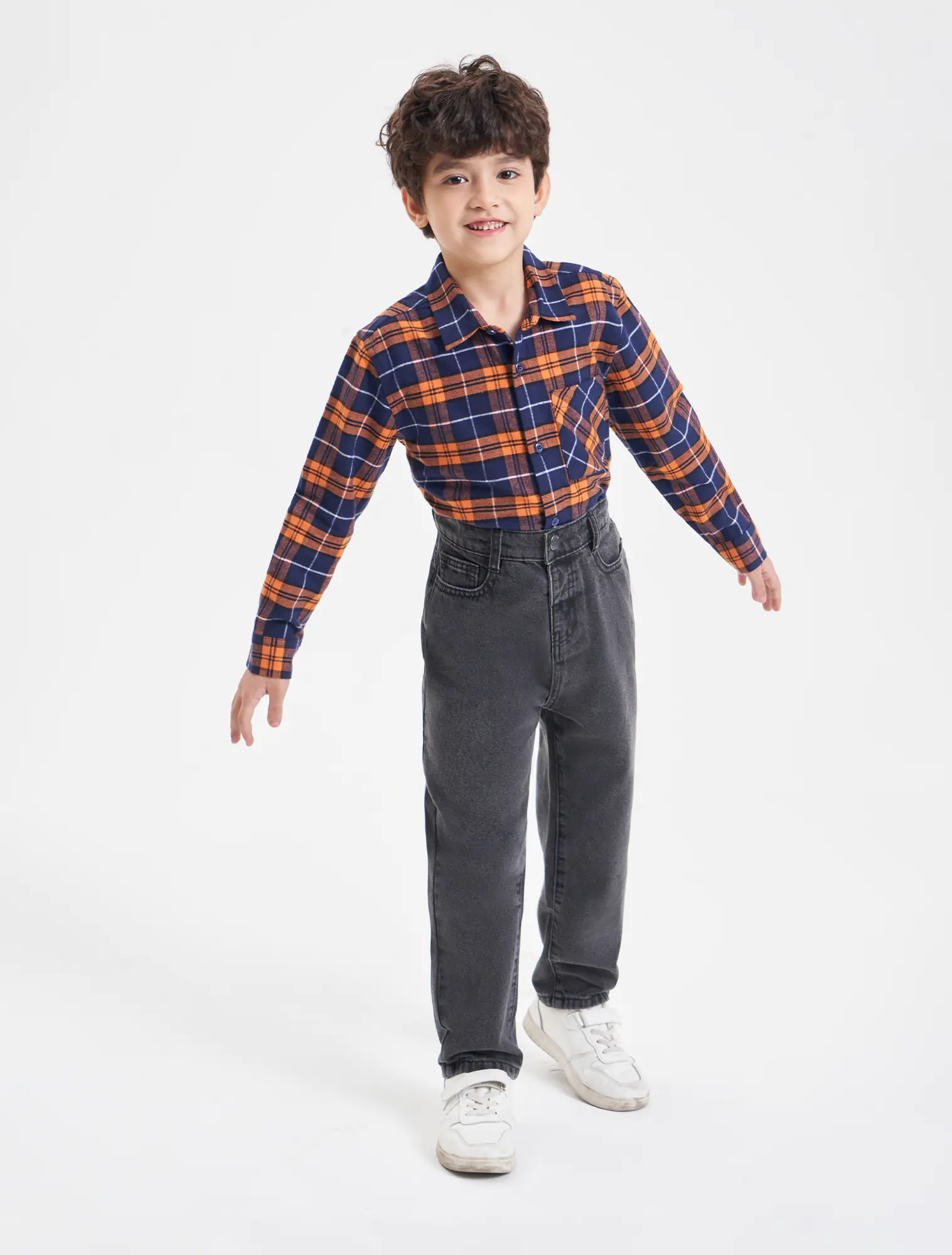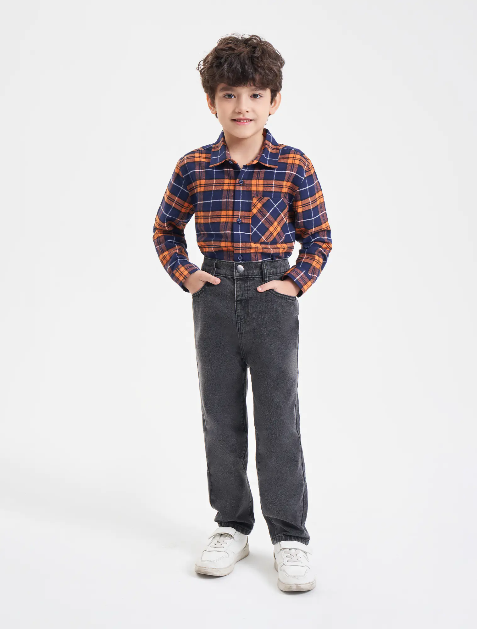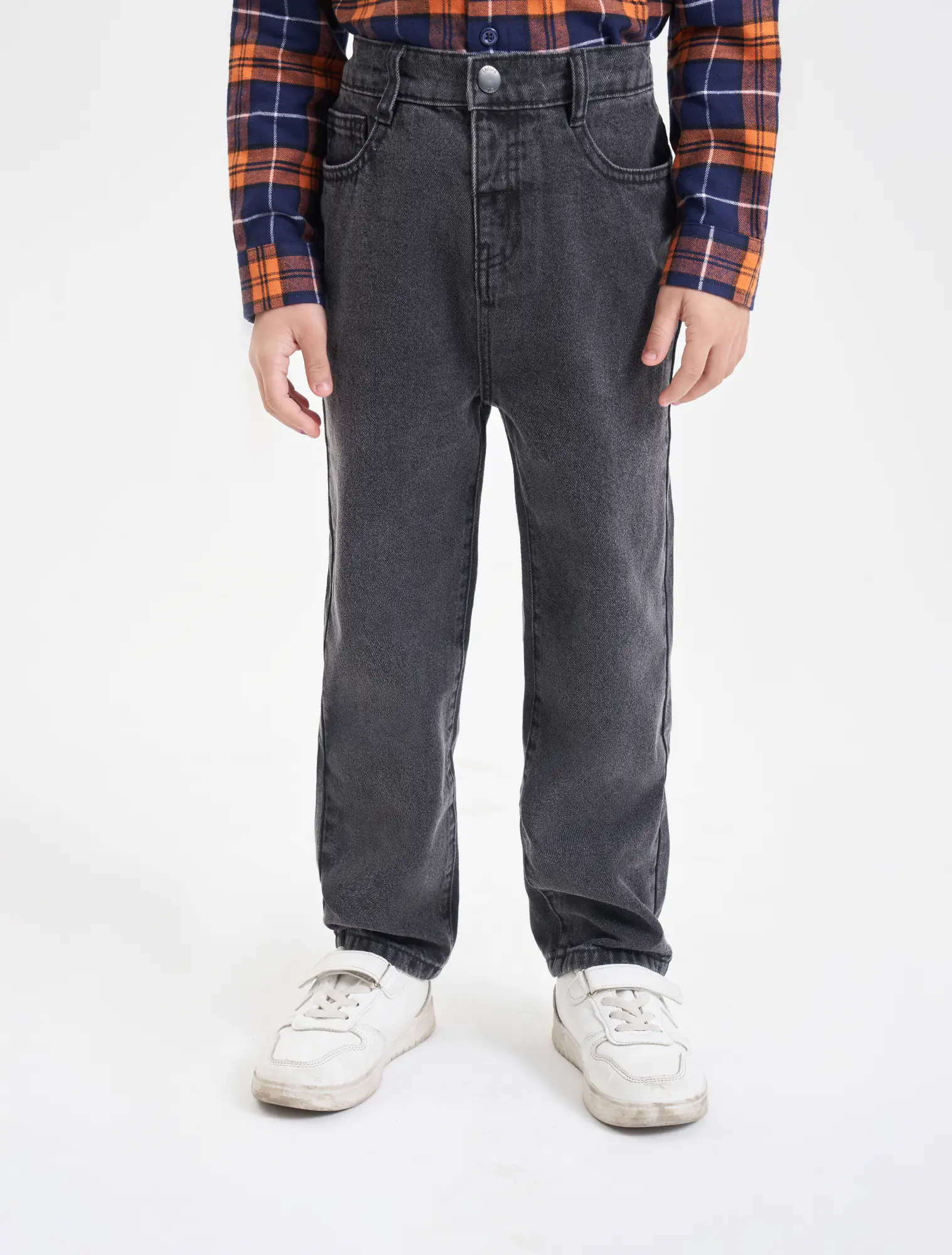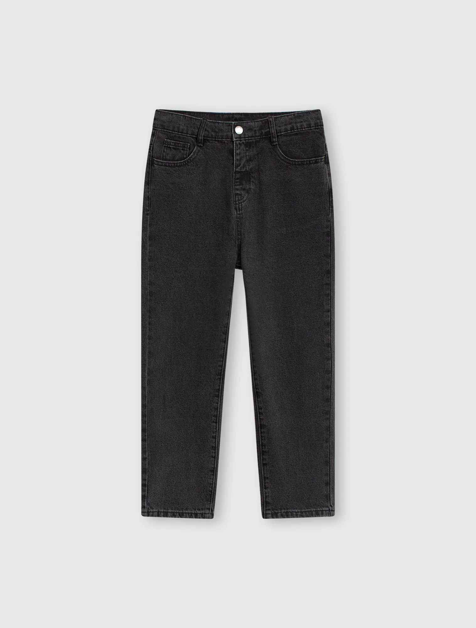 Quần jeans dáng balloon fit, co giãn, cạp co giãn, cài khuy bấm phía trước, thân sau in lazer thười trang.