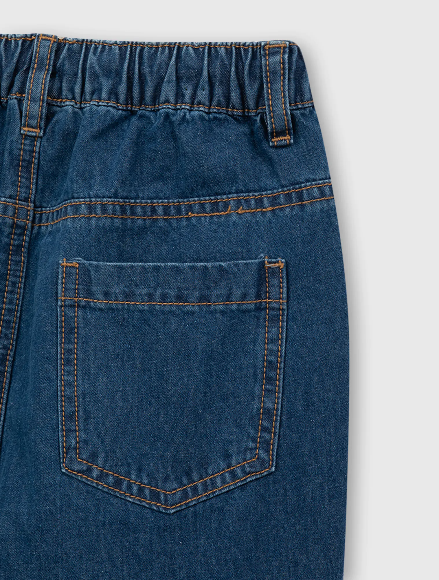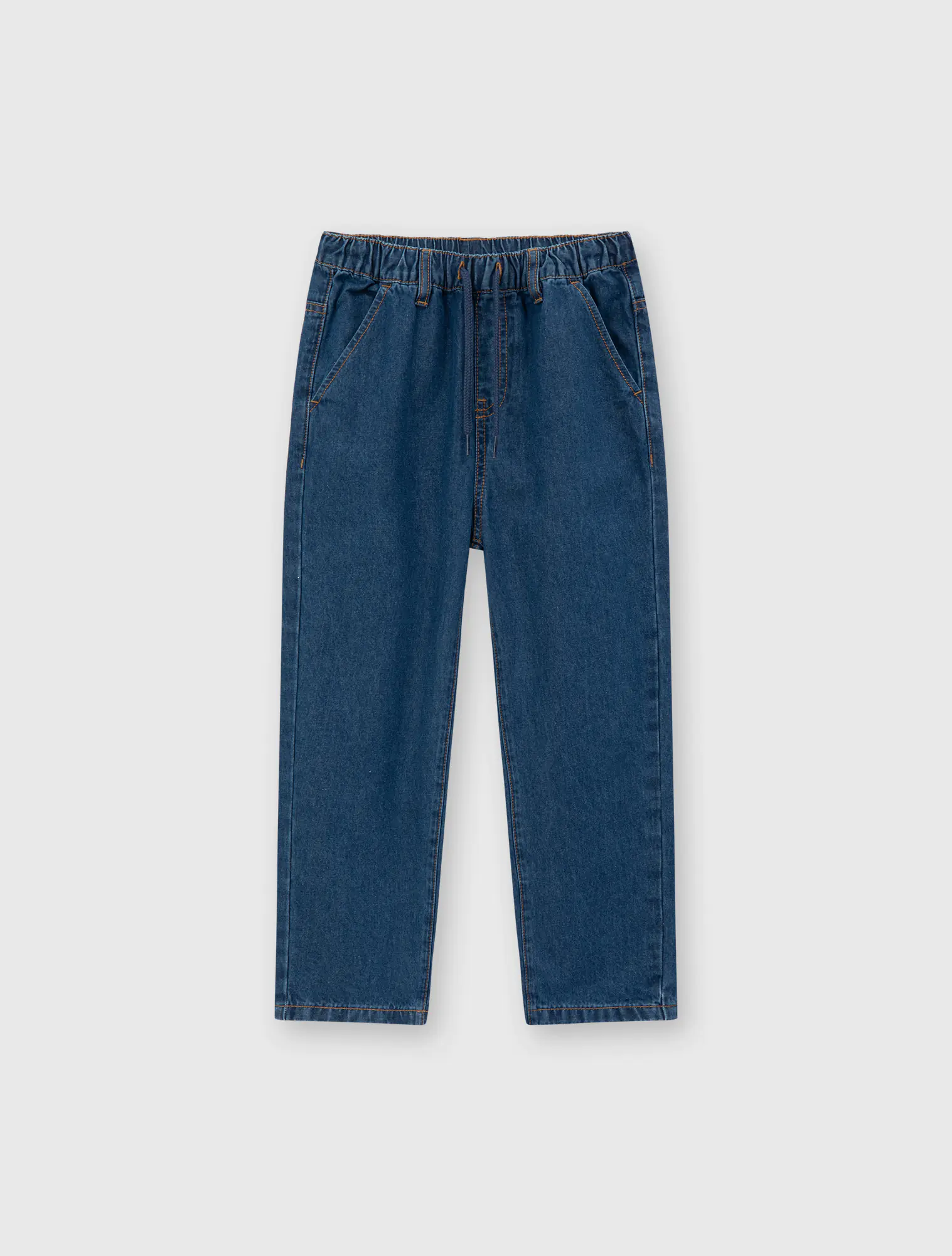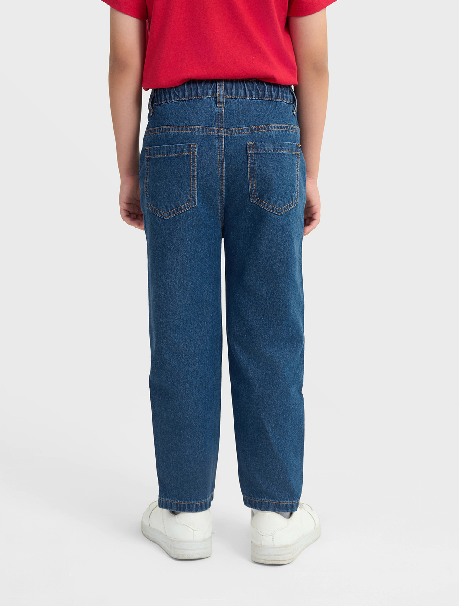 Quần jeans jogger bé trai kiểu dáng rộng rãi, thoải mái. Phần eo co giãn và bên trong cạp có dây rút để điều chỉnh độ vừa vặn theo dáng người.