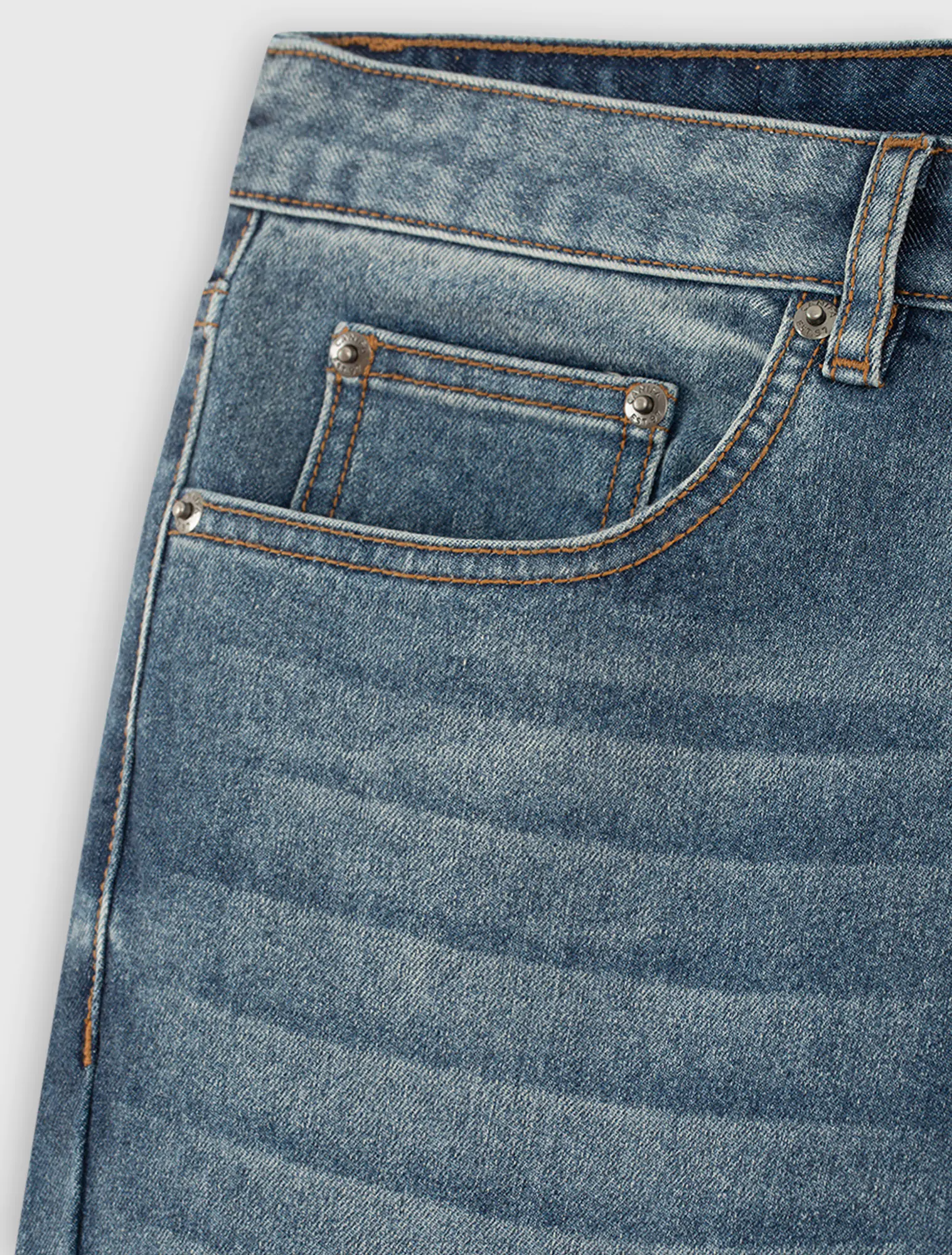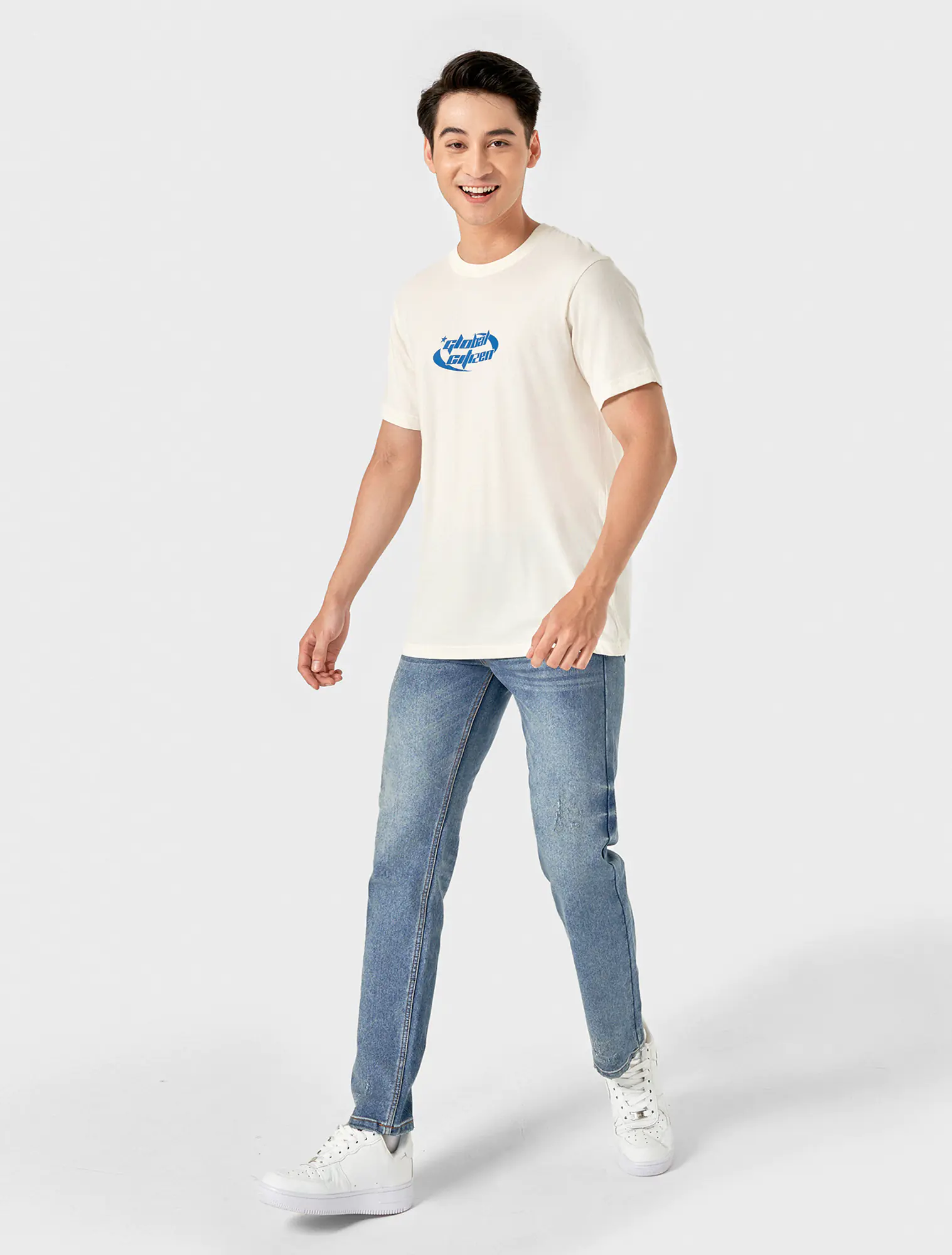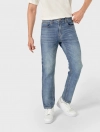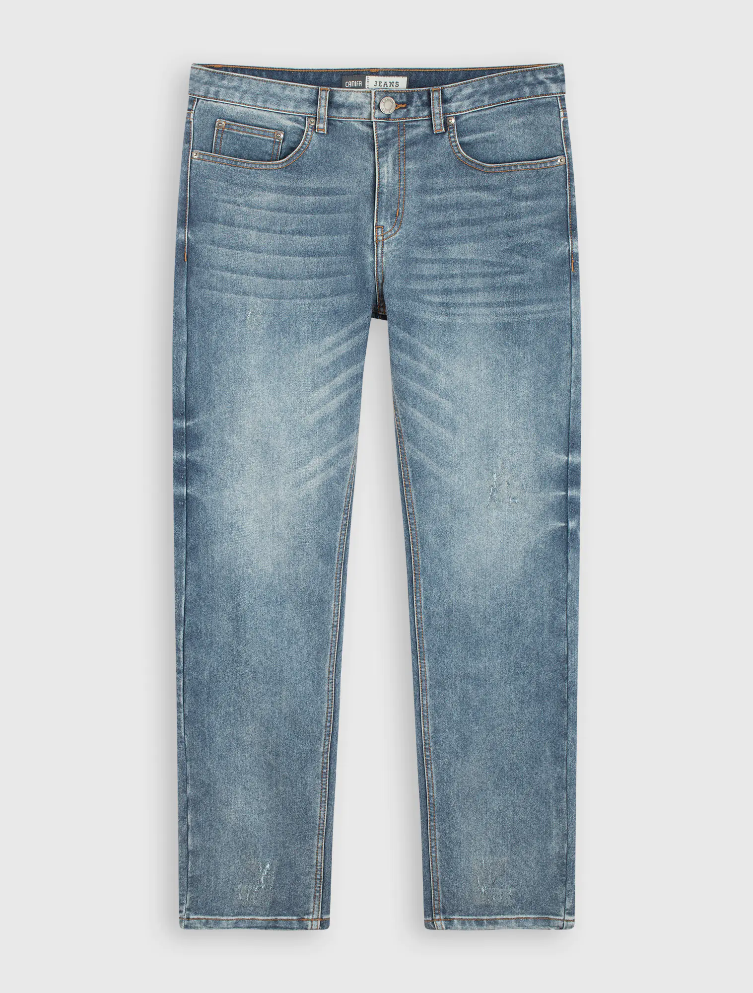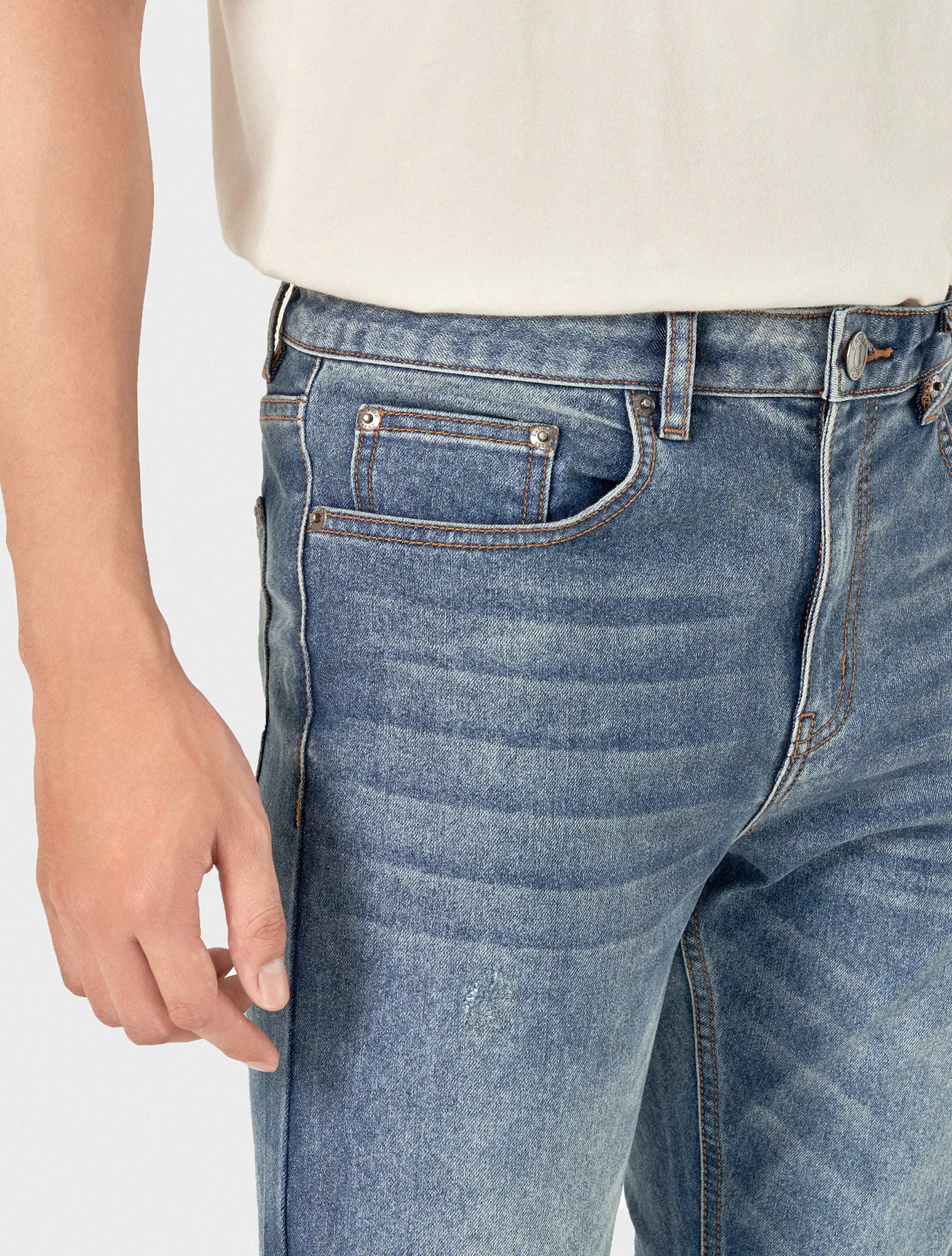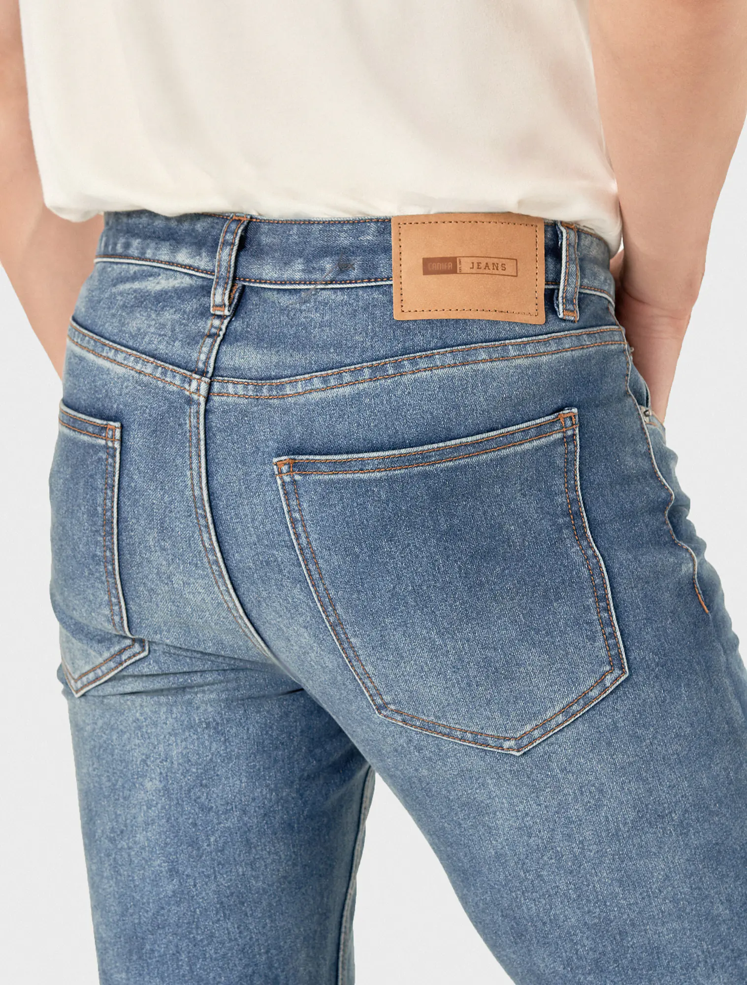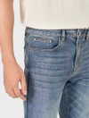 Quần jeans chất liệu cotton pha, cạp thường mở cúc, có khoá, phom ôm.
