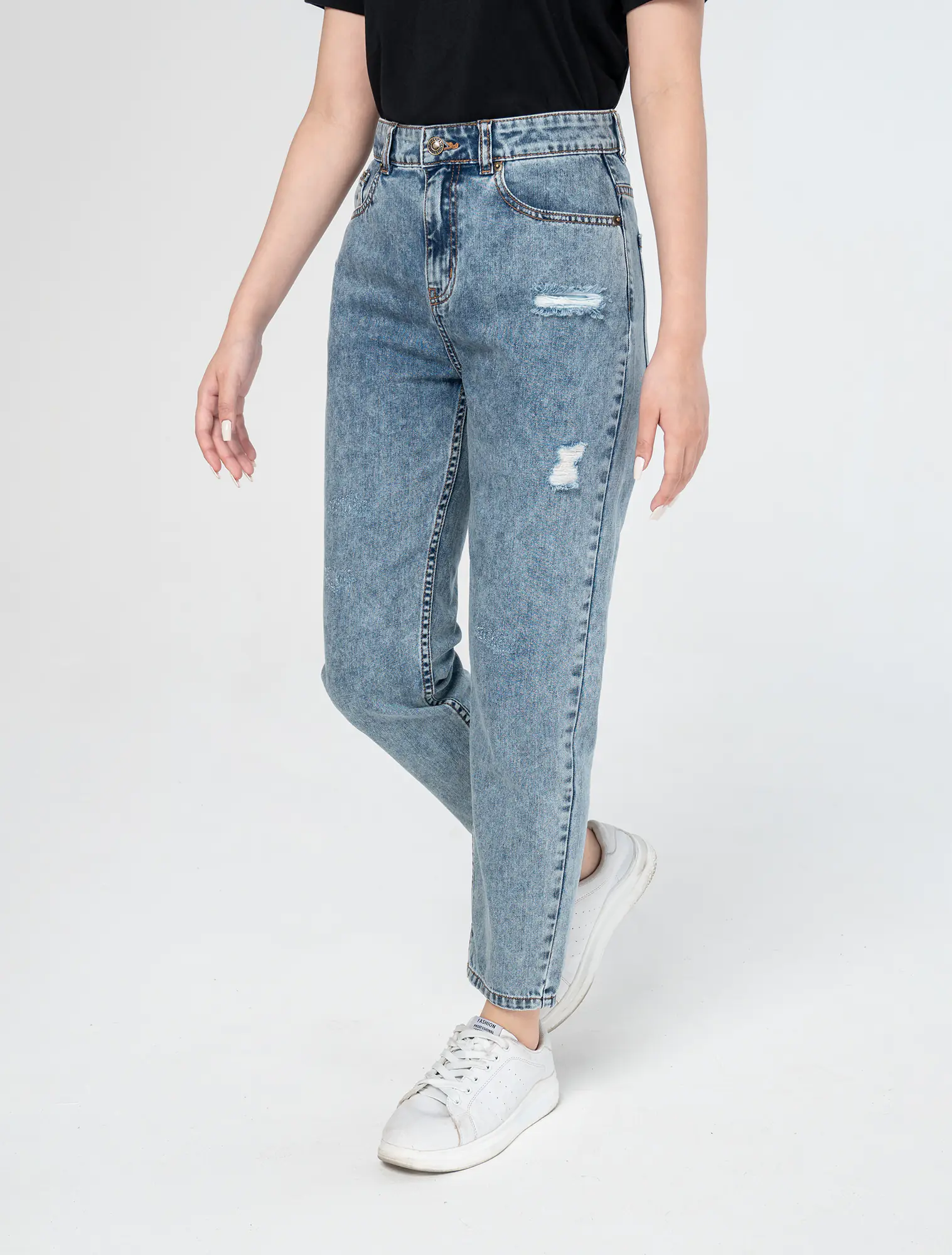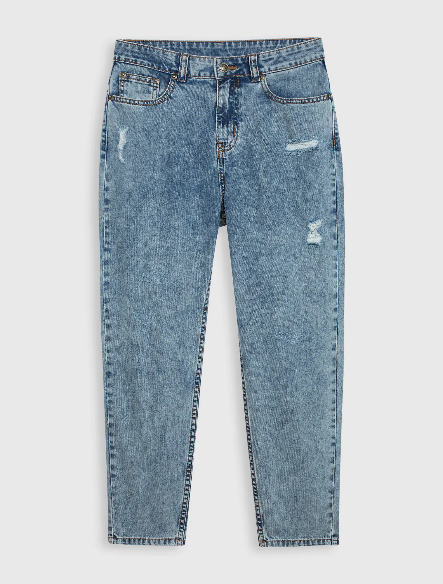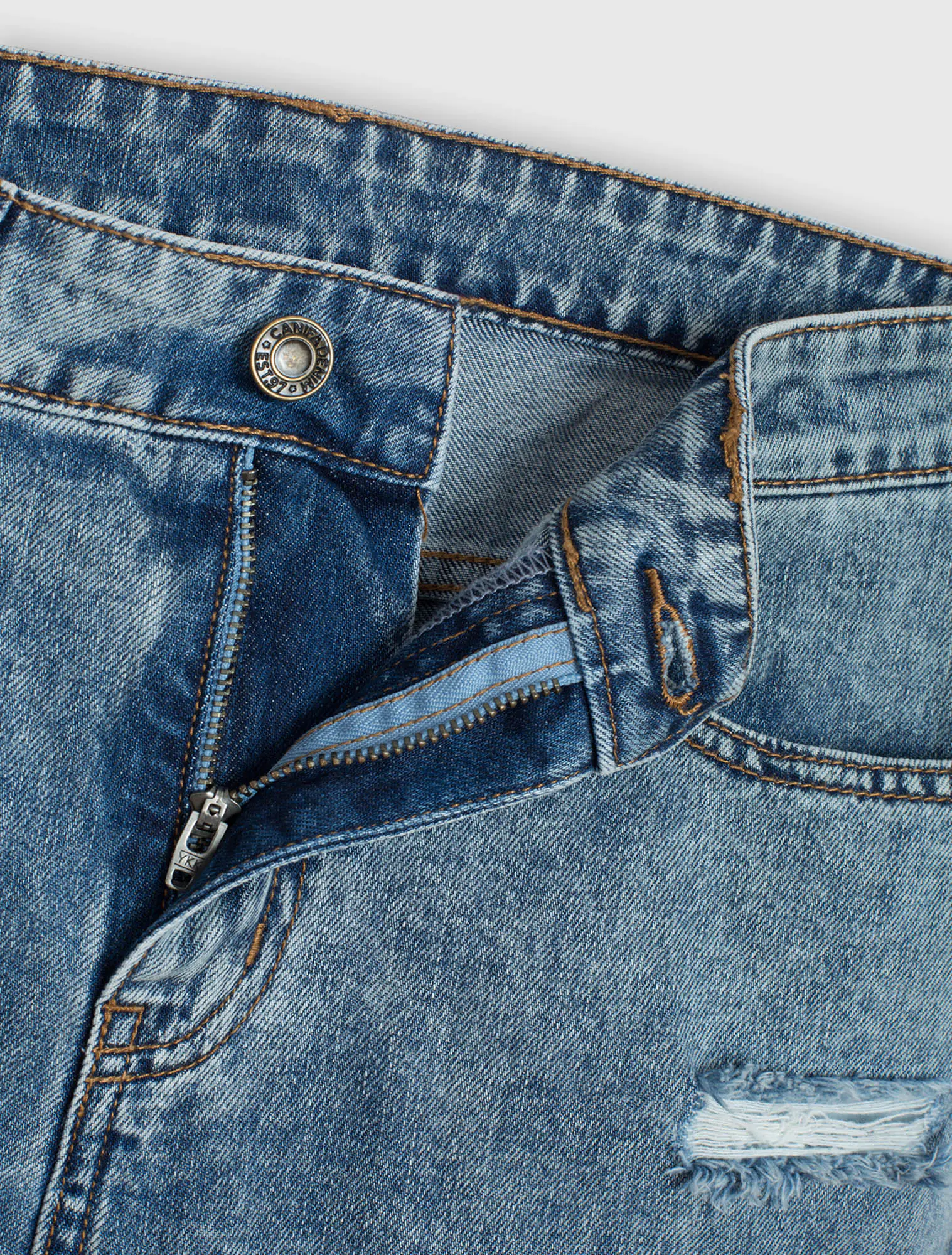 Dáng cạp vừa, ống sườn rộng, cài cúc, khoá kim loại, có mài.