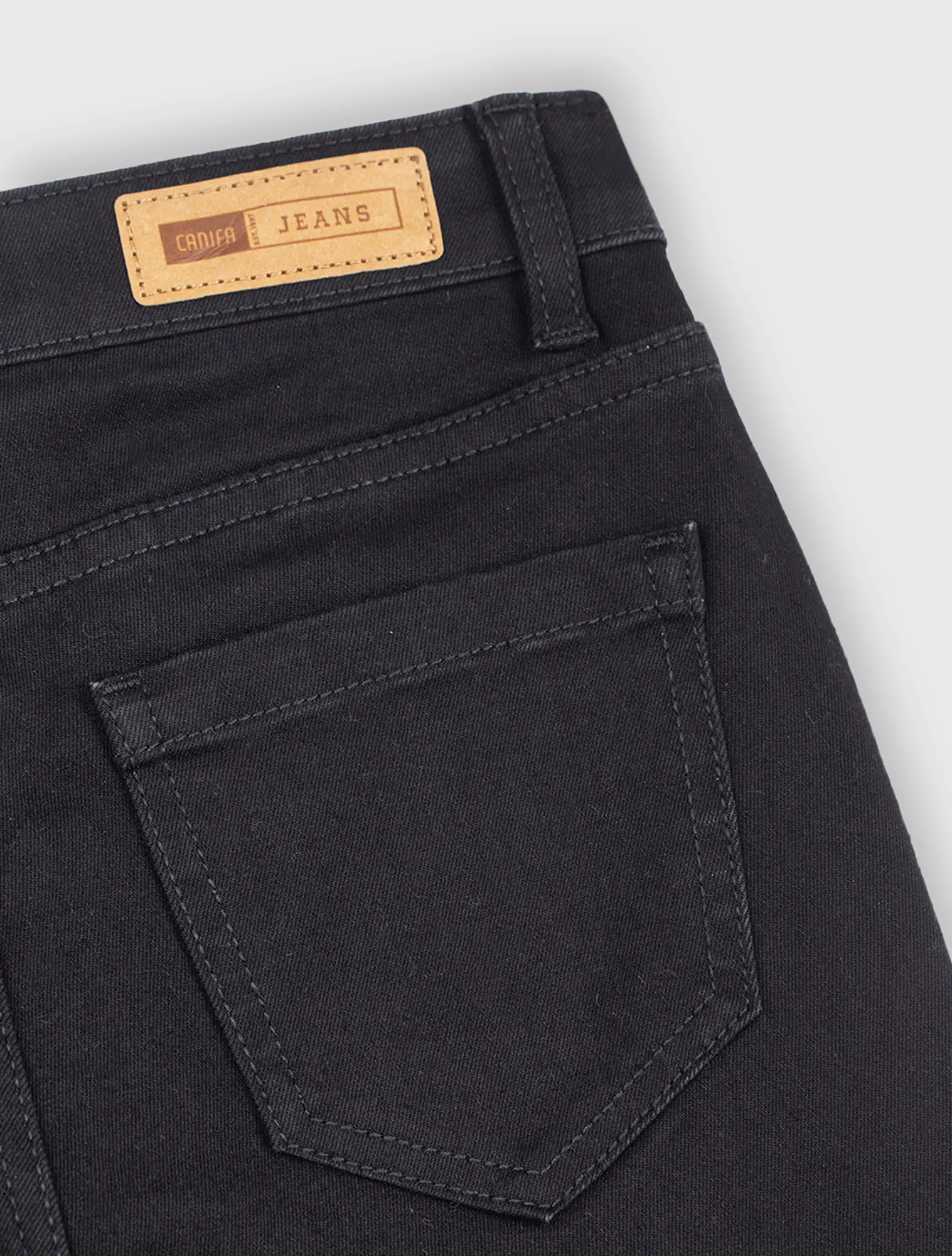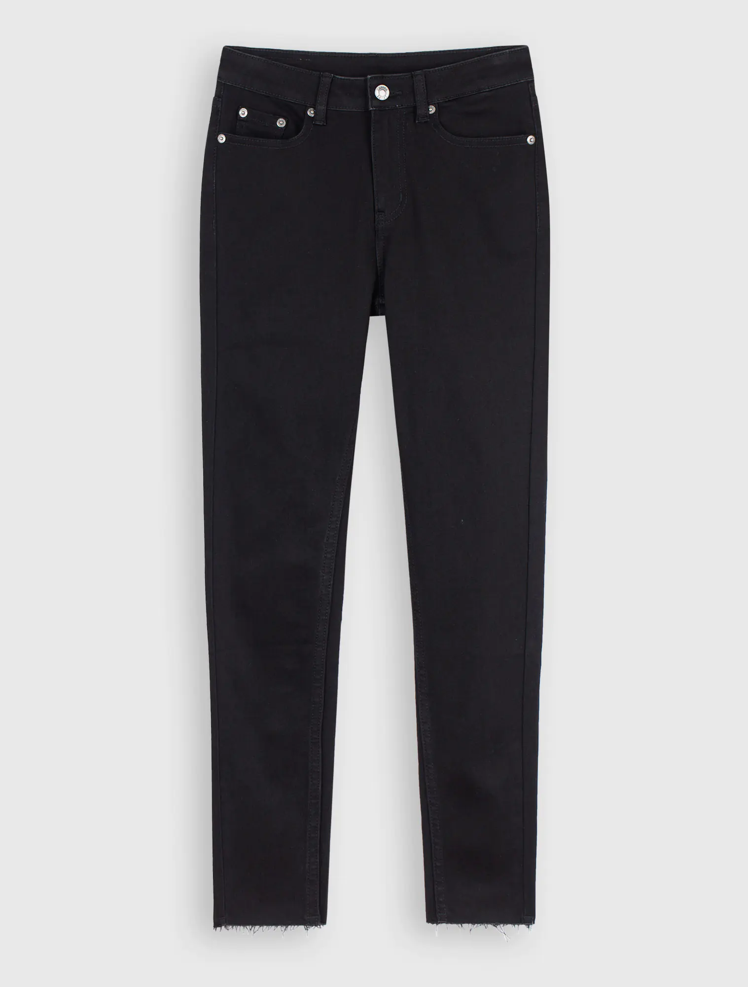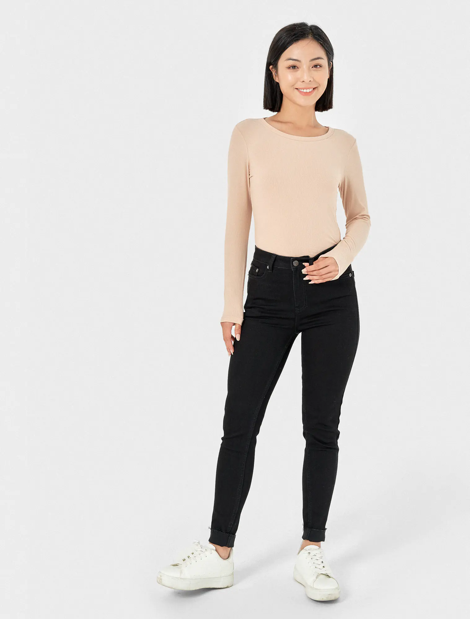 Quần jeans chất liệu cotton pha, cạp thường cài cúc, có khoá, dáng skinny.
