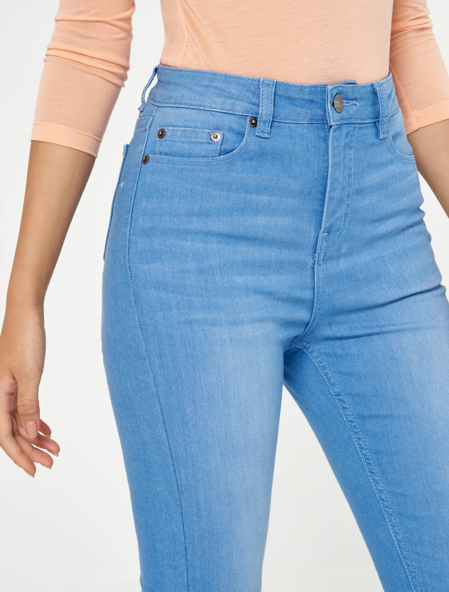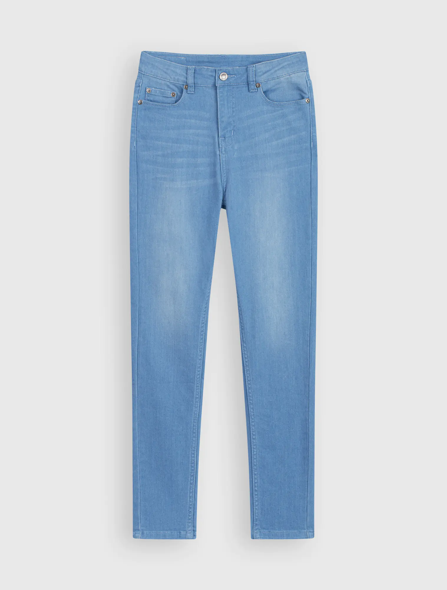Quần jeans chất liệu cotton pha, cạp thường cài cúc, có khoá, dáng slimfit.