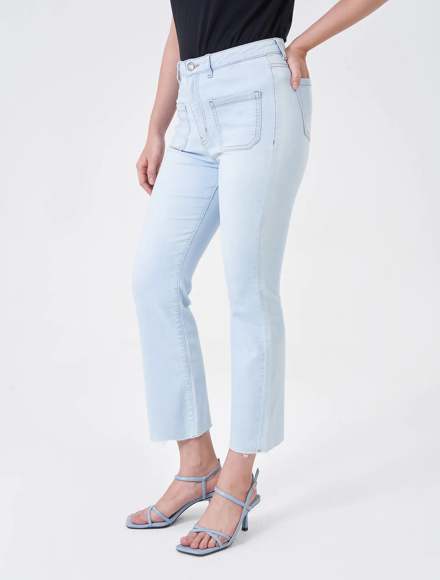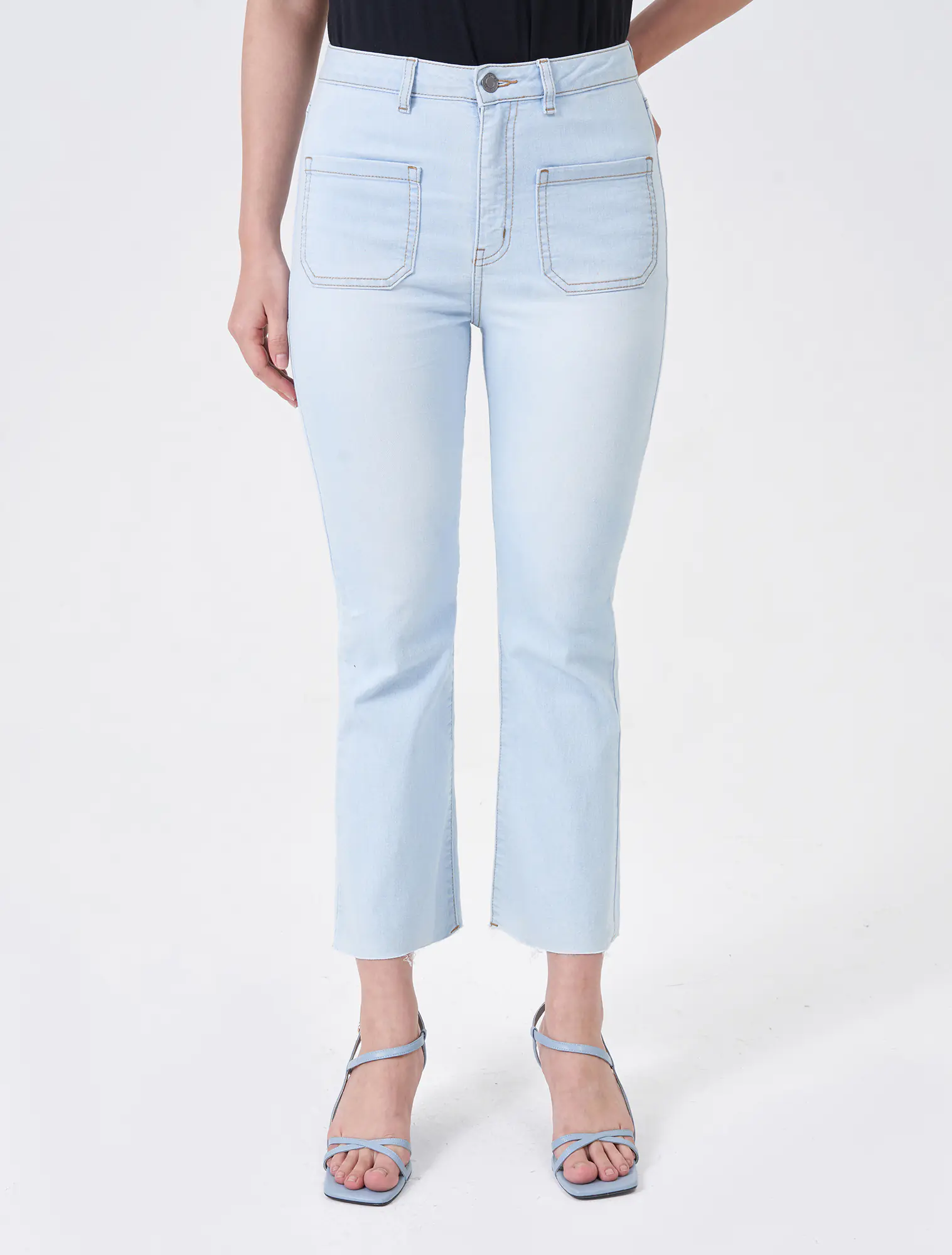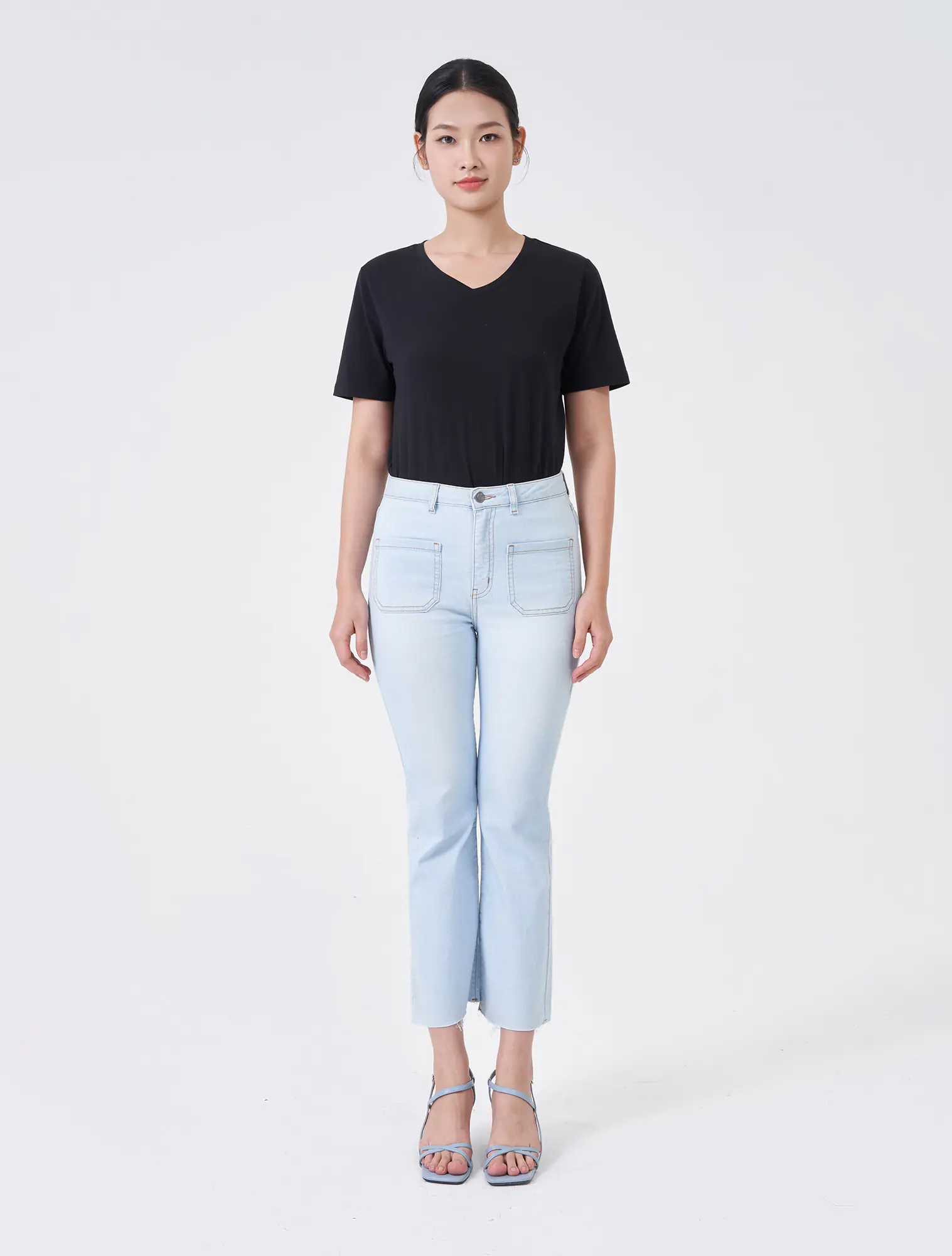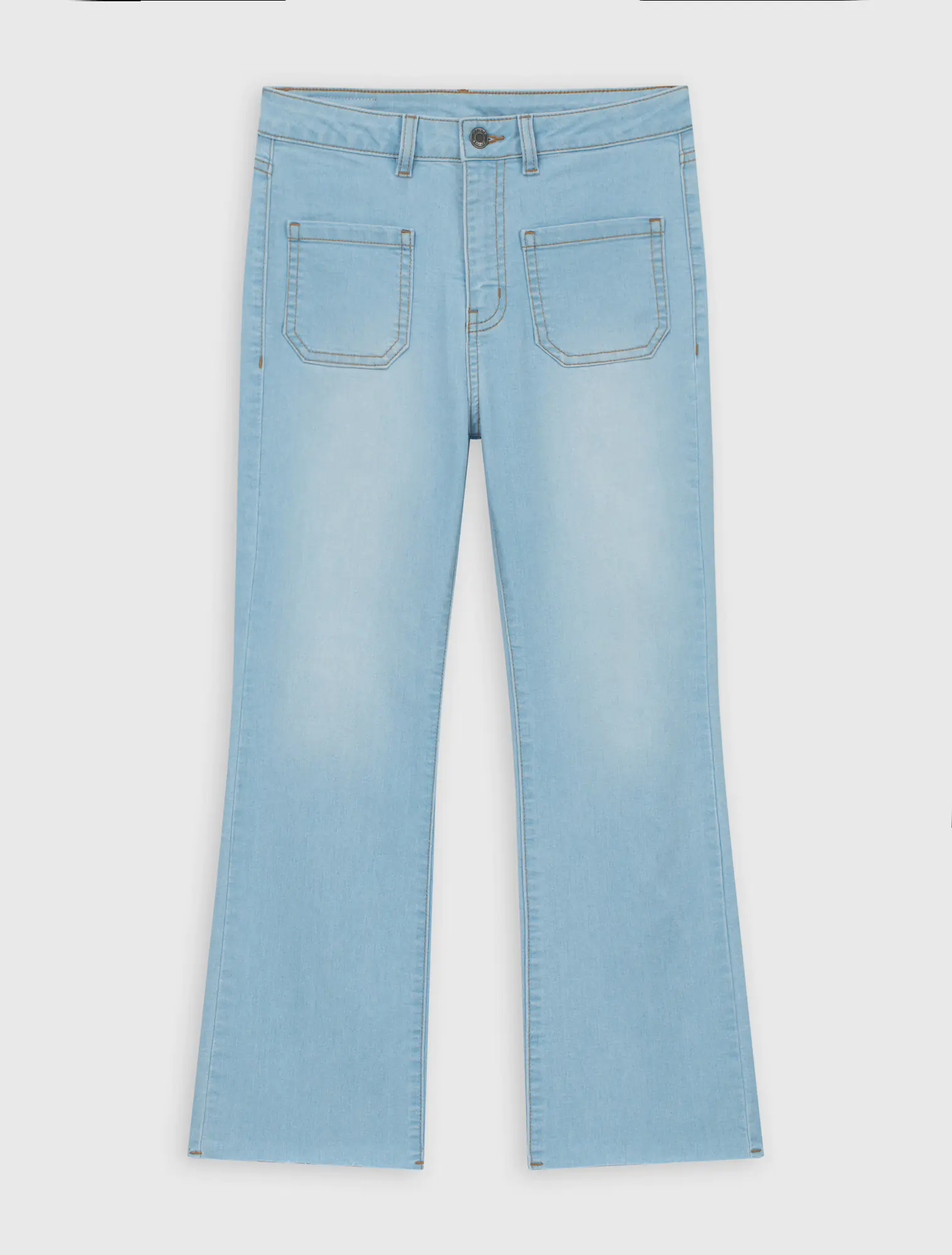 Quần jeans chất liệu cotton pha, cạp thường cài cúc, dáng flare.