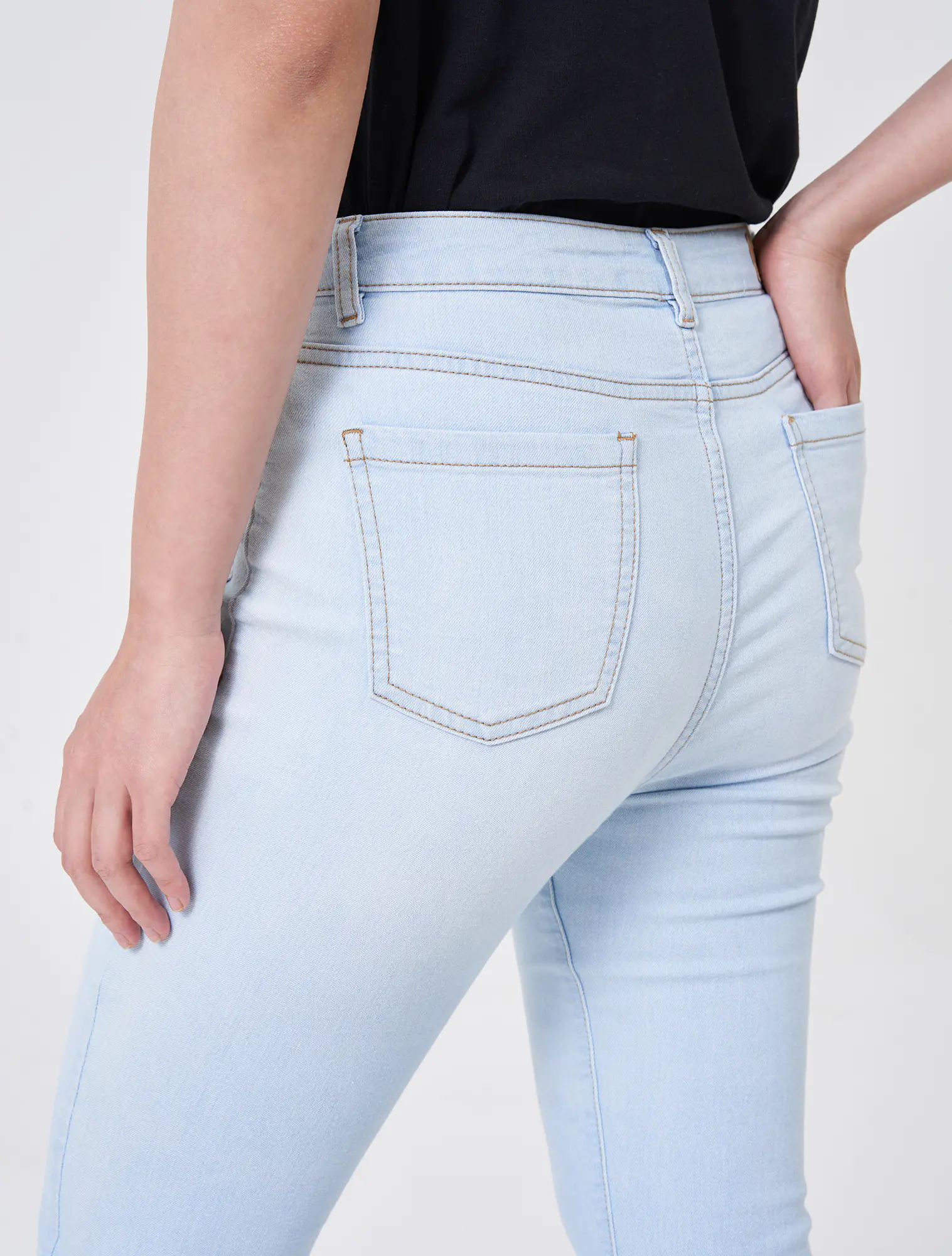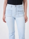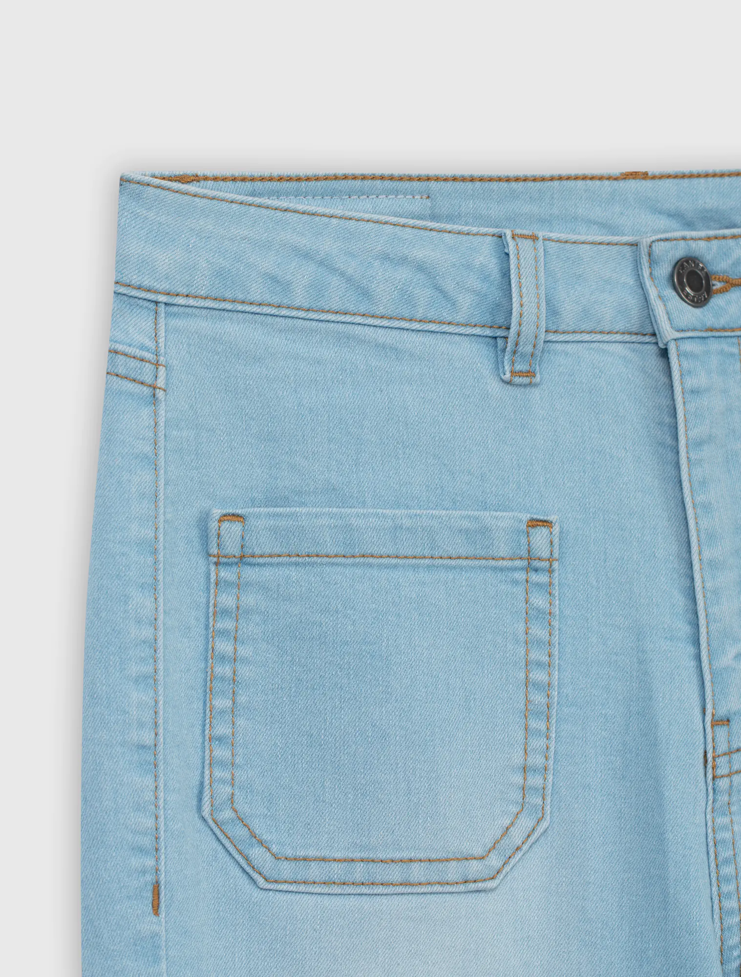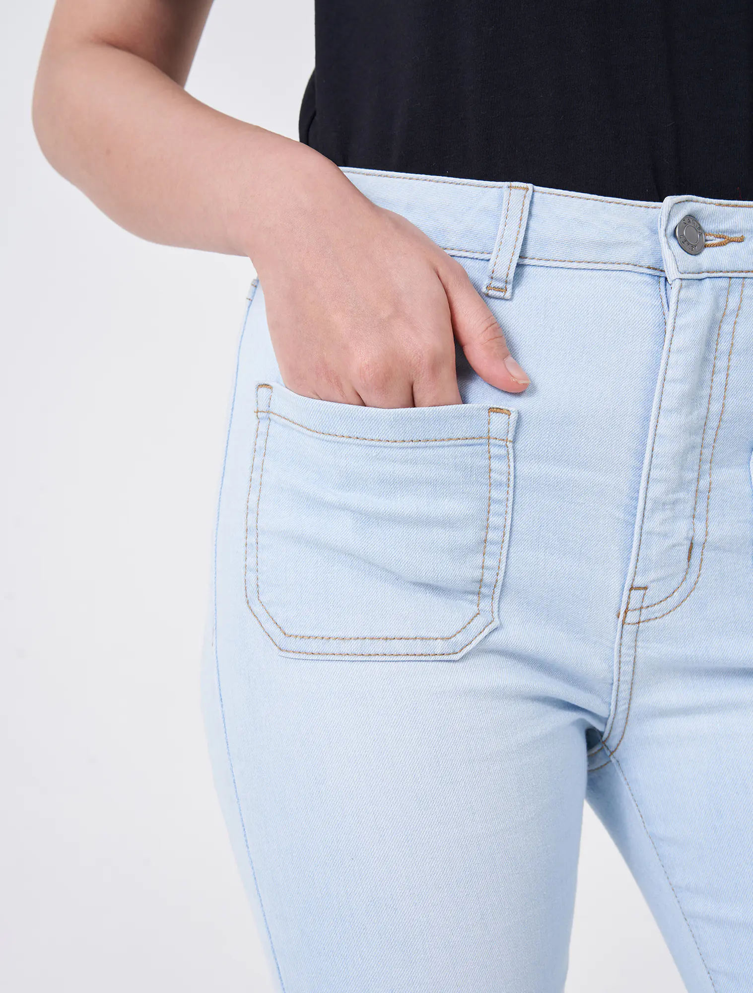 Quần jeans chất liệu cotton pha, cạp thường cài cúc, dáng flare.