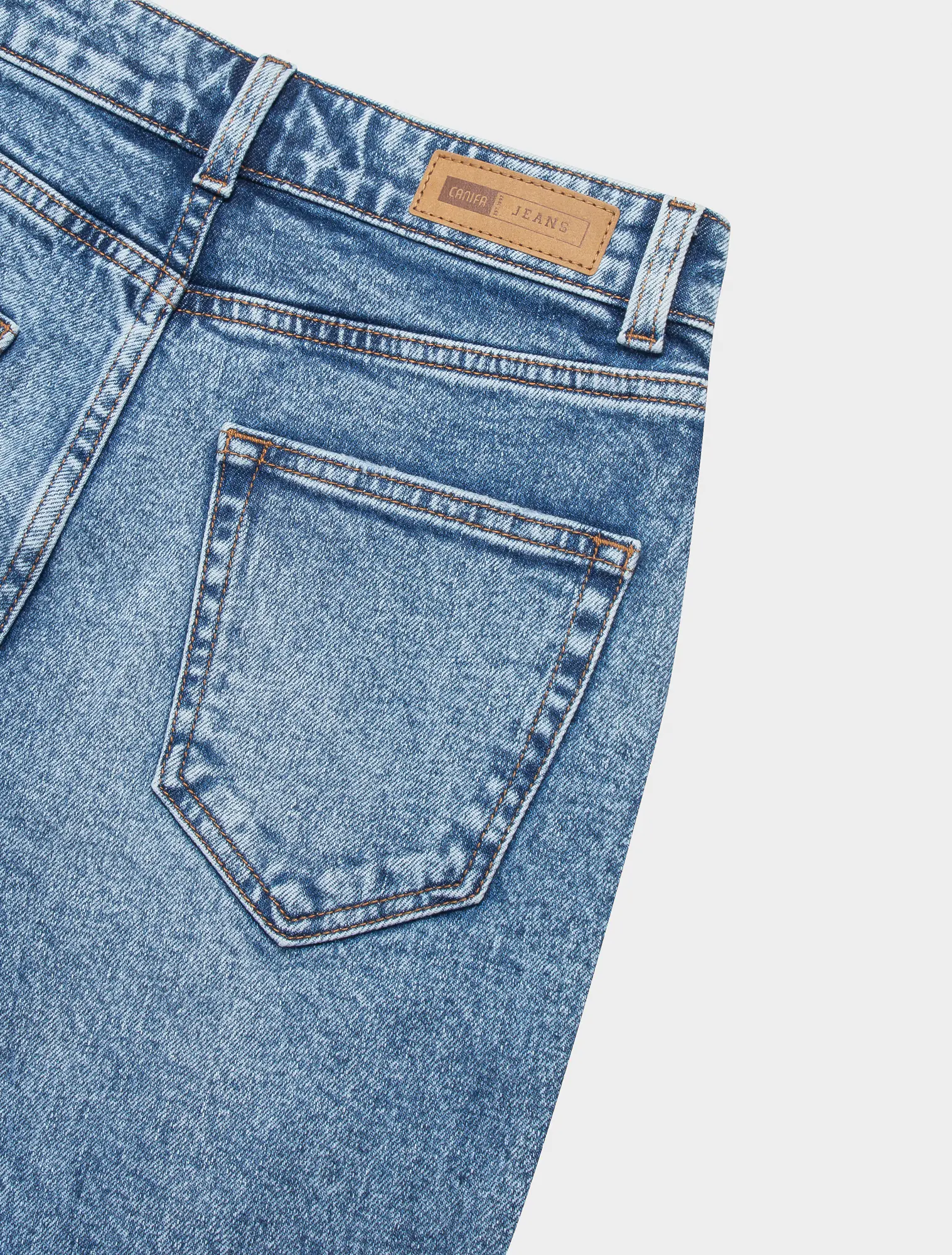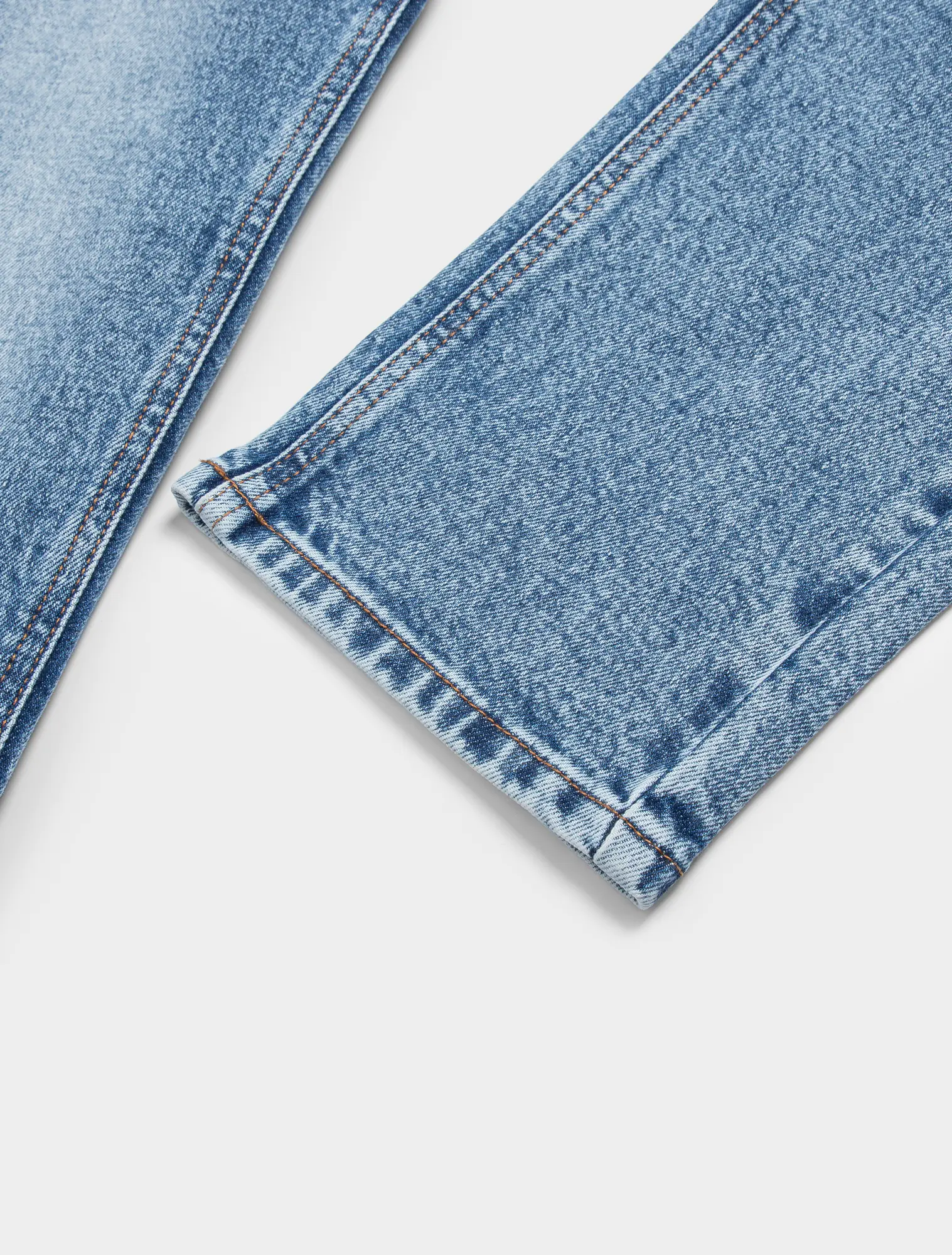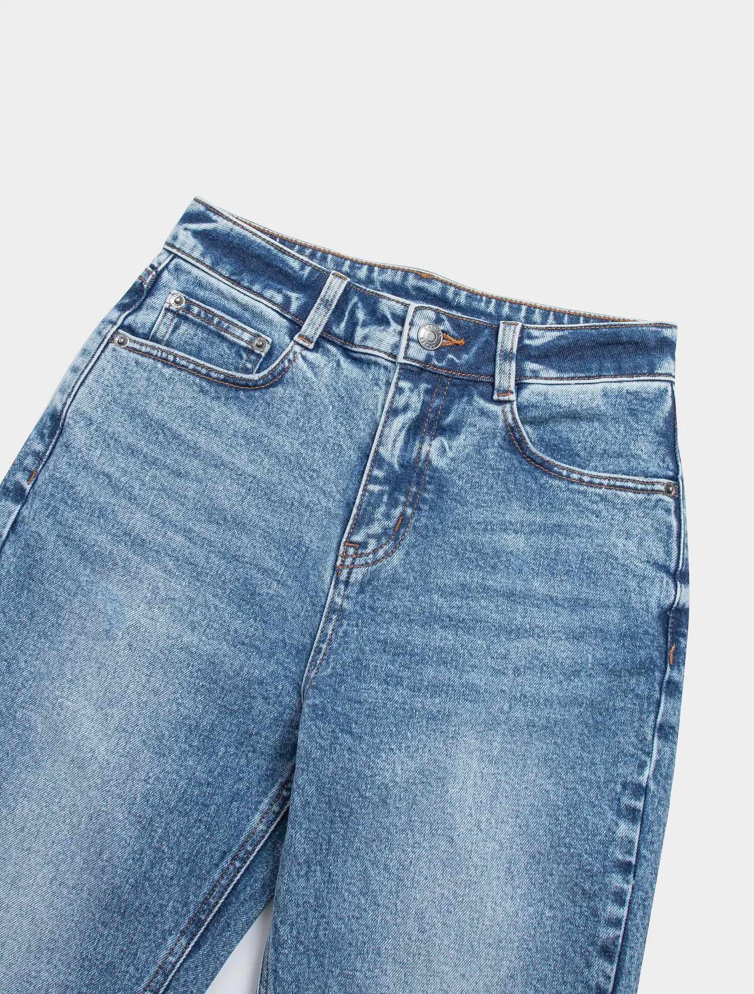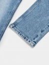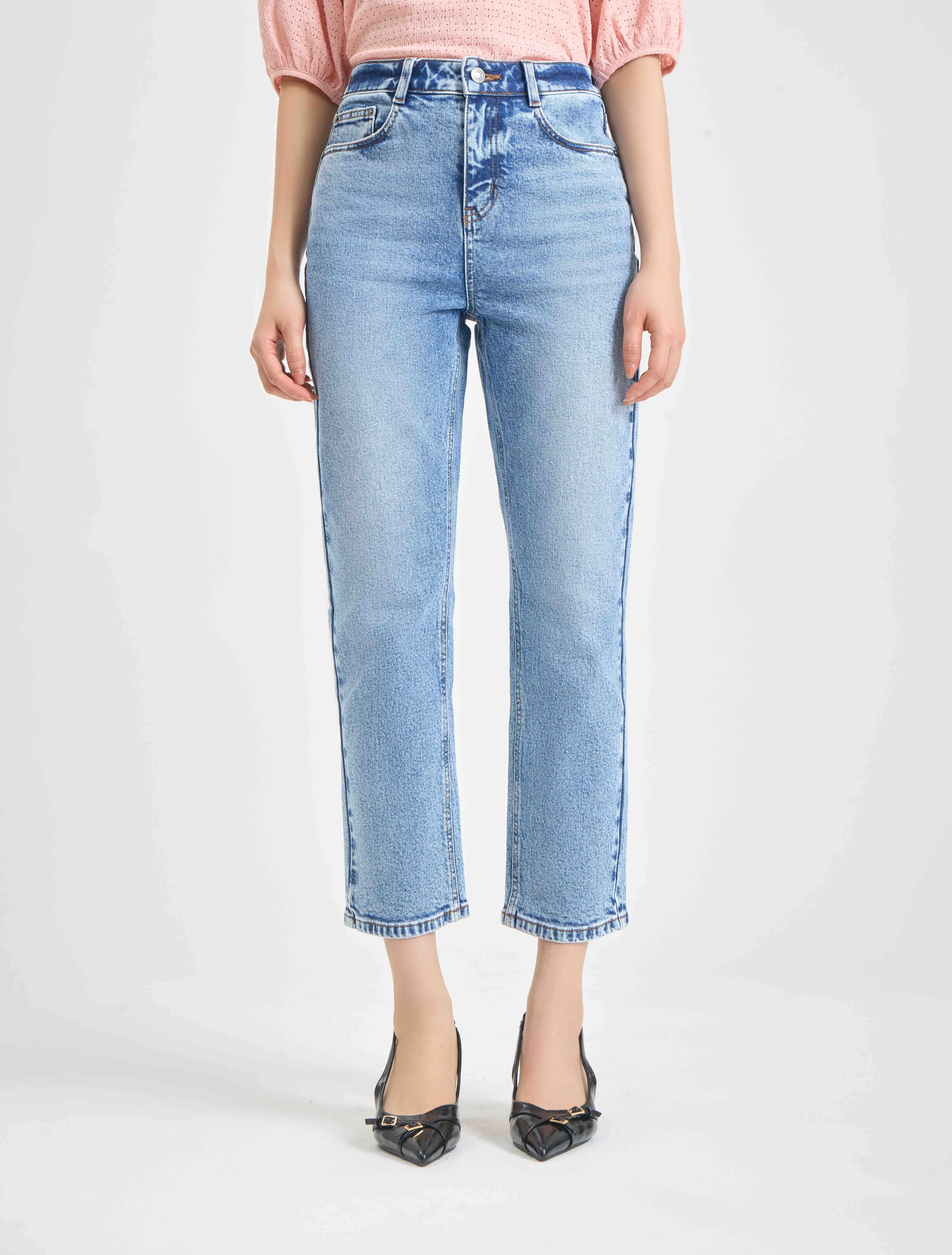 Quần jeans 5 túi chất liệu denim cotton spandex hơi co giãn mang lại cảm giác thoải mái. Quần dáng suông, eo và mông hơi ôm, phần ống xòe nhẹ. Cạp cao với nẹp khoá kéo và khuy. Chiều dài quần được thiết kế vừa chạm tới bàn chân và không bị chùng.