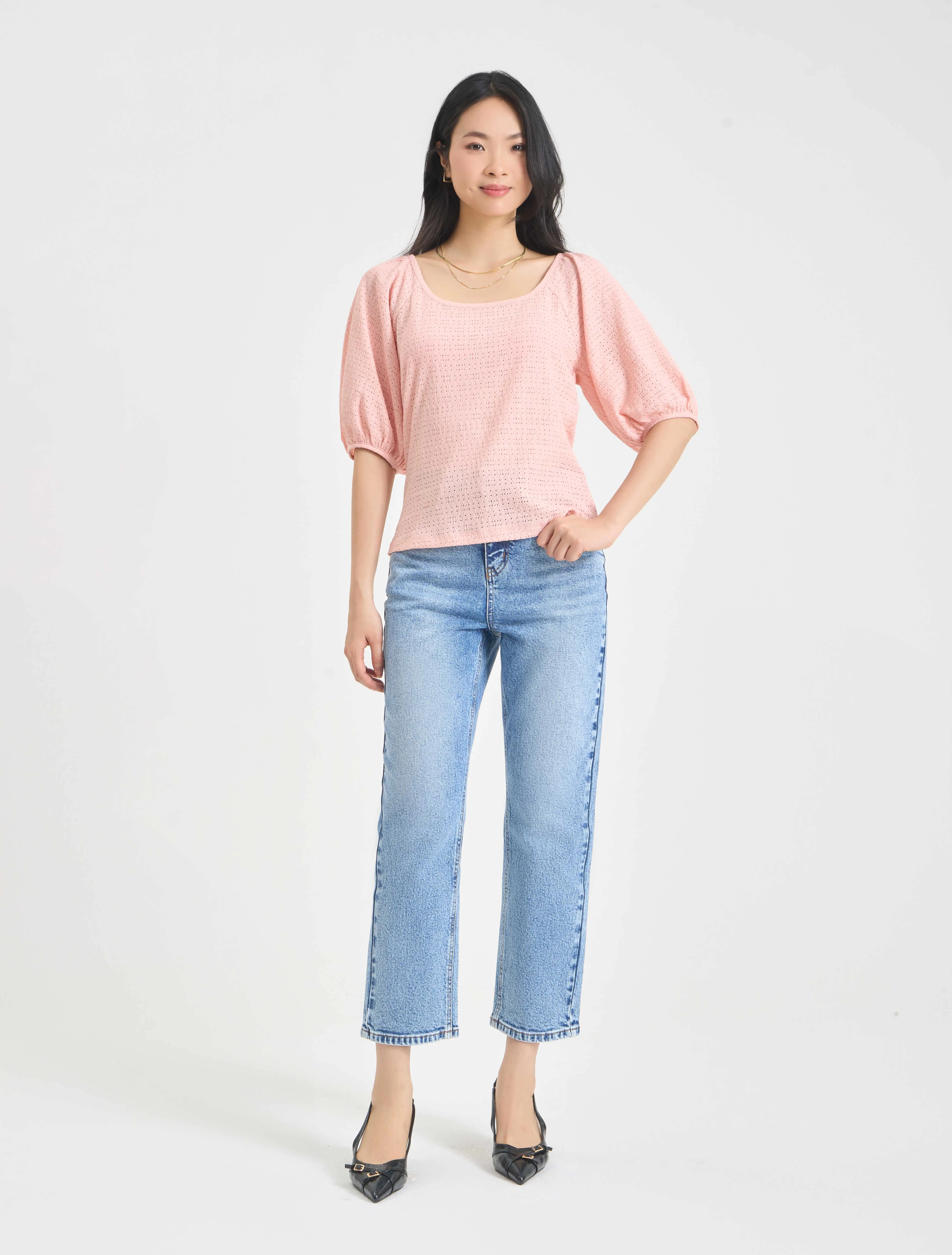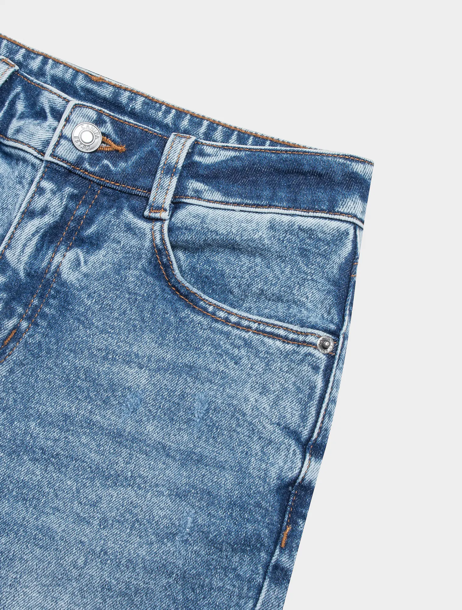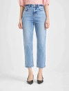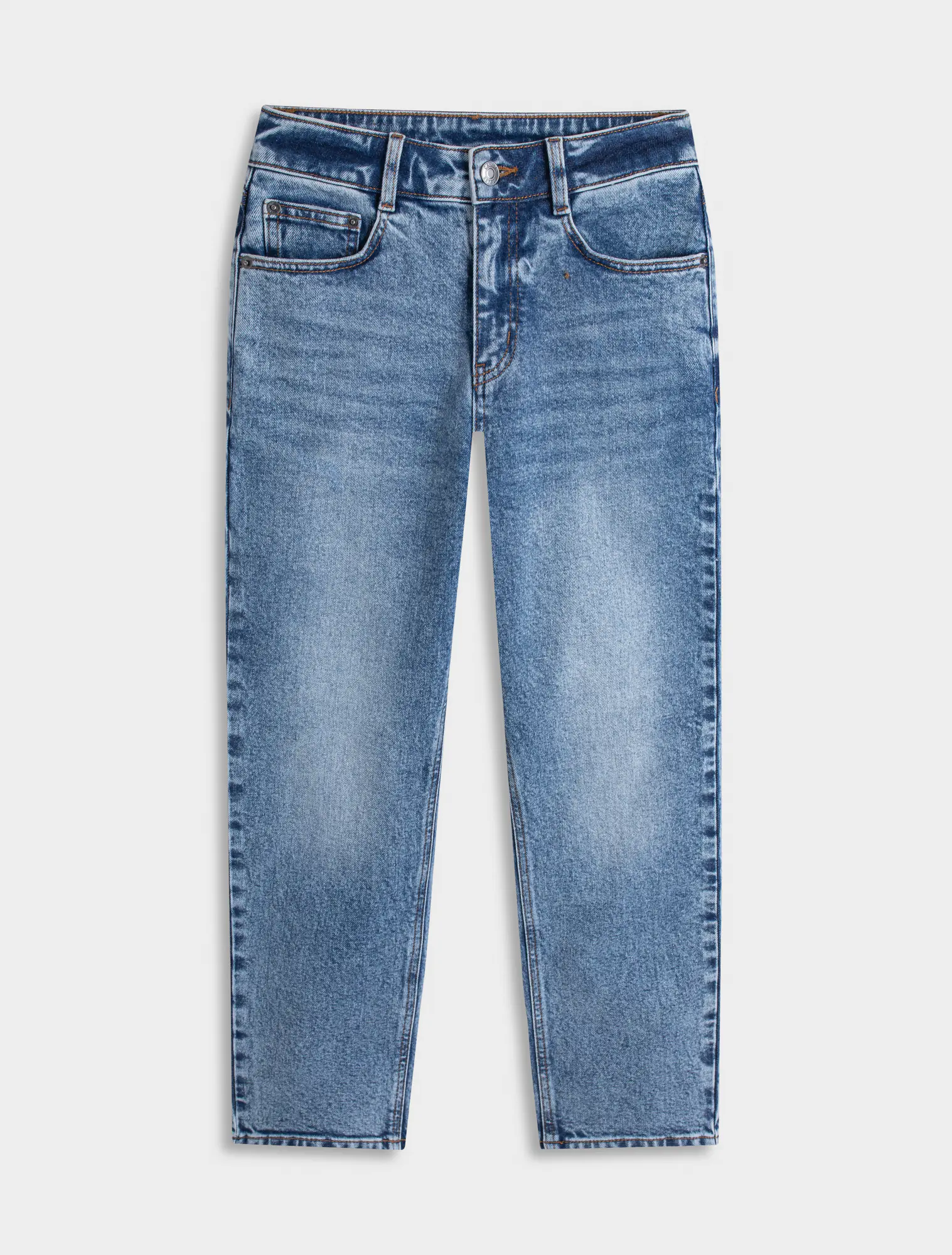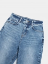 Quần jeans 5 túi chất liệu denim cotton spandex hơi co giãn mang lại cảm giác thoải mái. Quần dáng suông, eo và mông hơi ôm, phần ống xòe nhẹ. Cạp cao với nẹp khoá kéo và khuy. Chiều dài quần được thiết kế vừa chạm tới bàn chân và không bị chùng.
