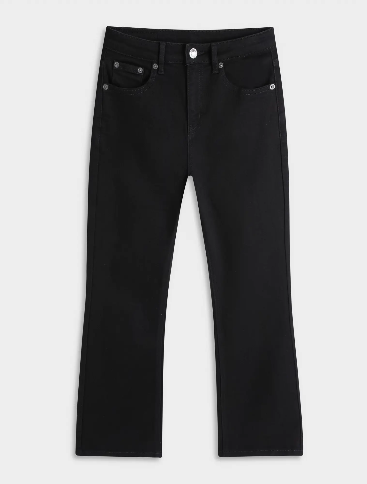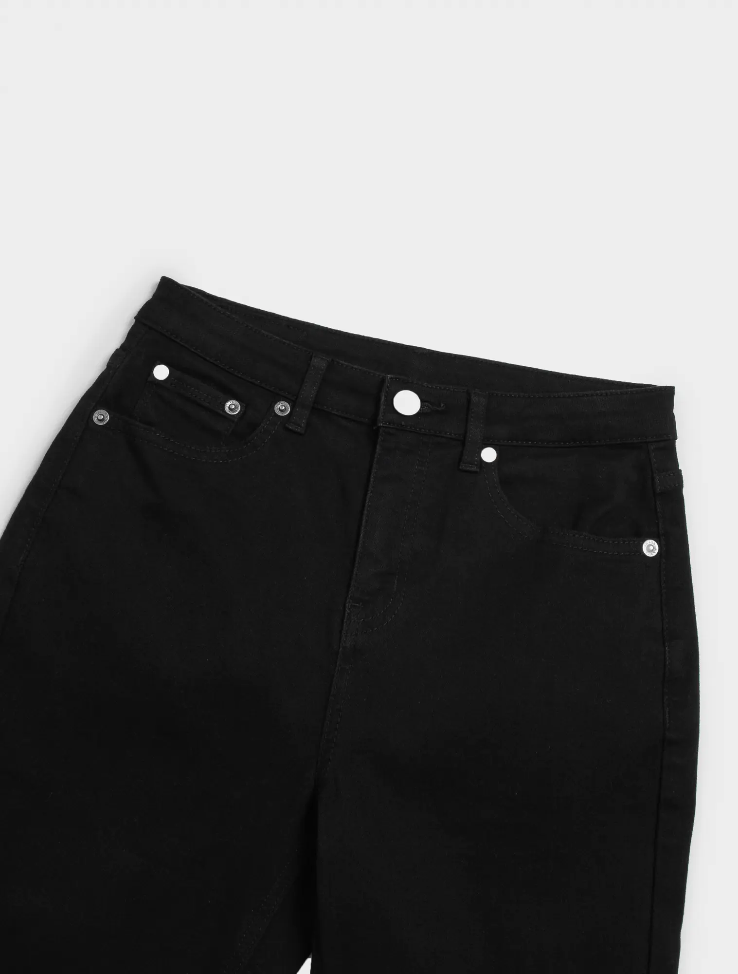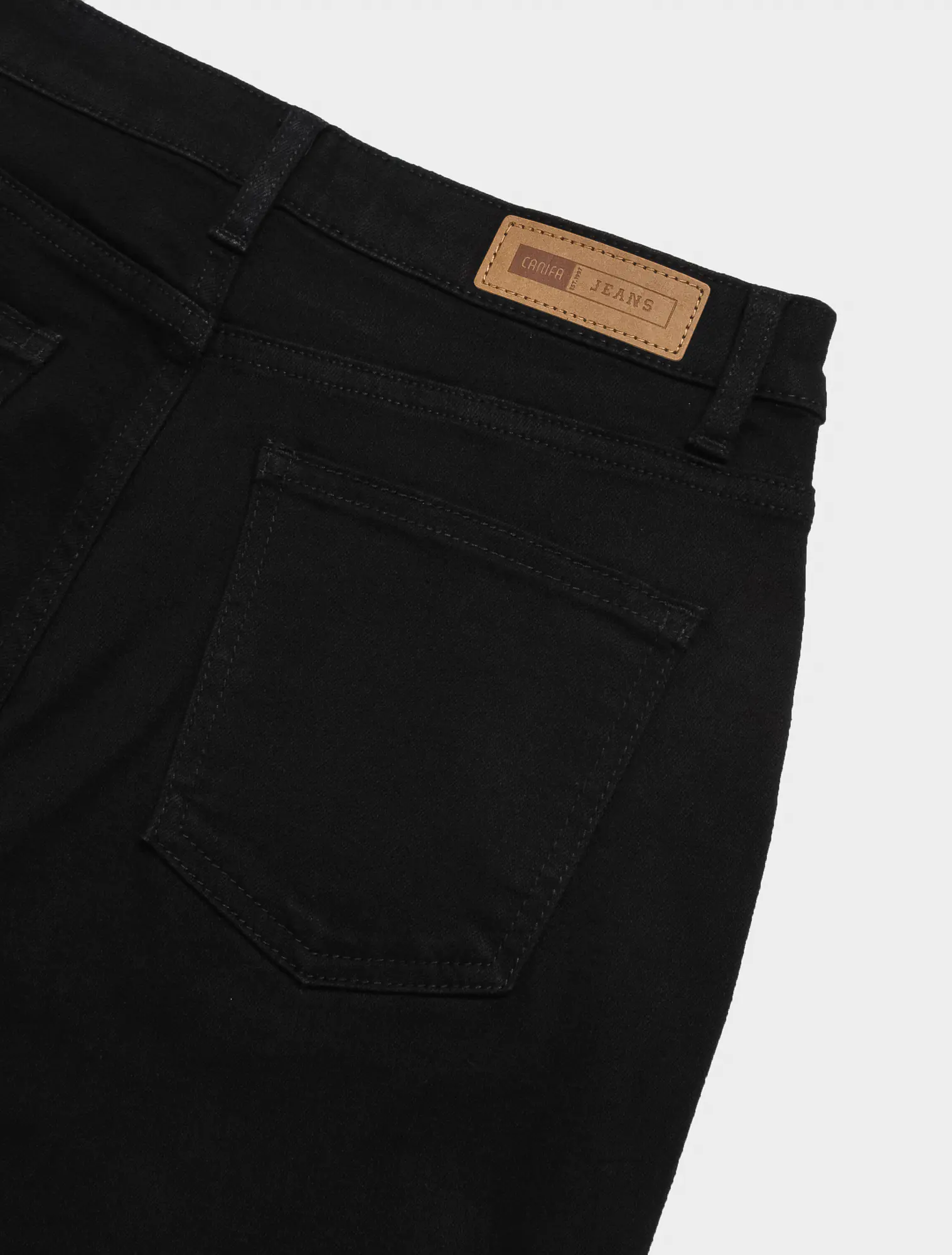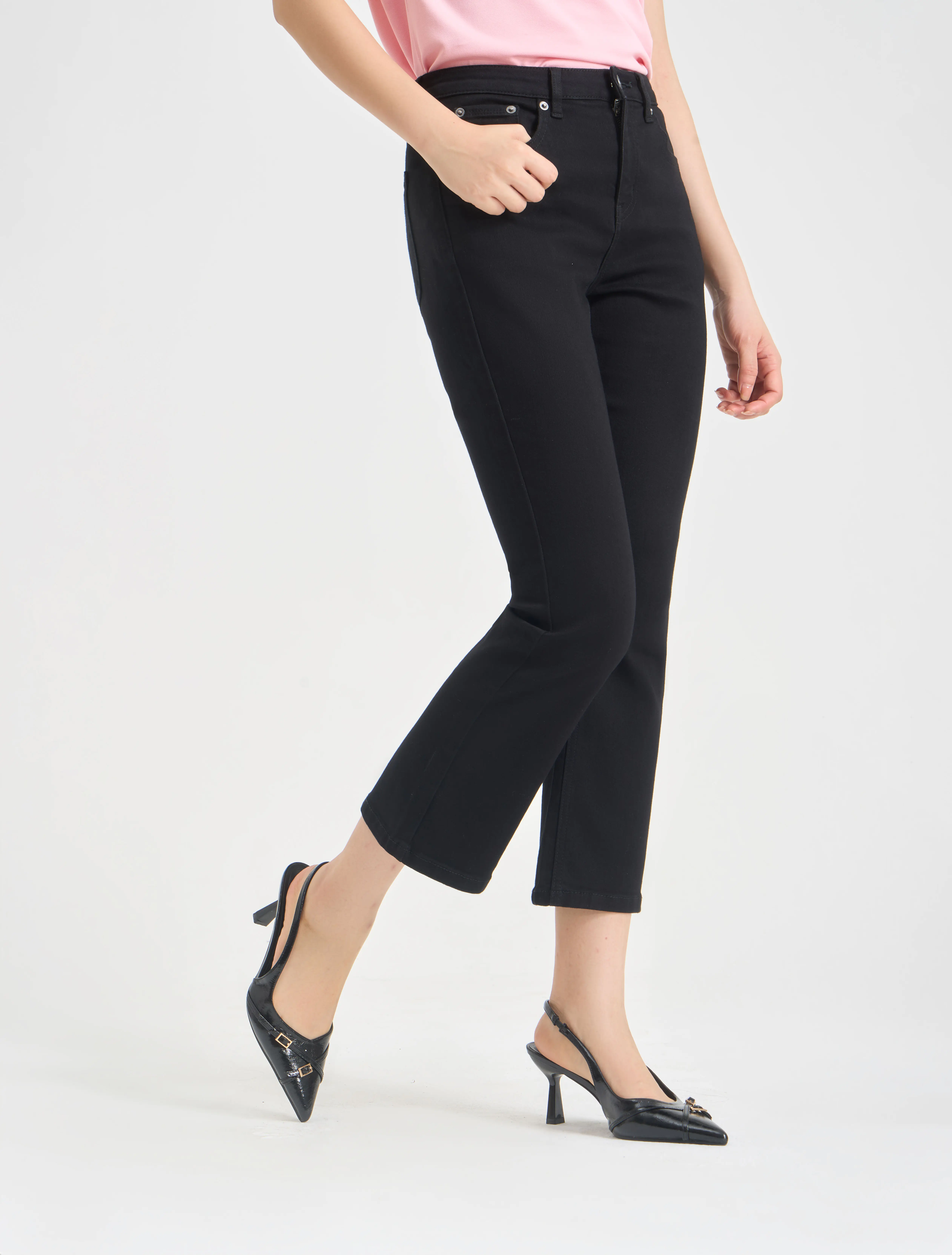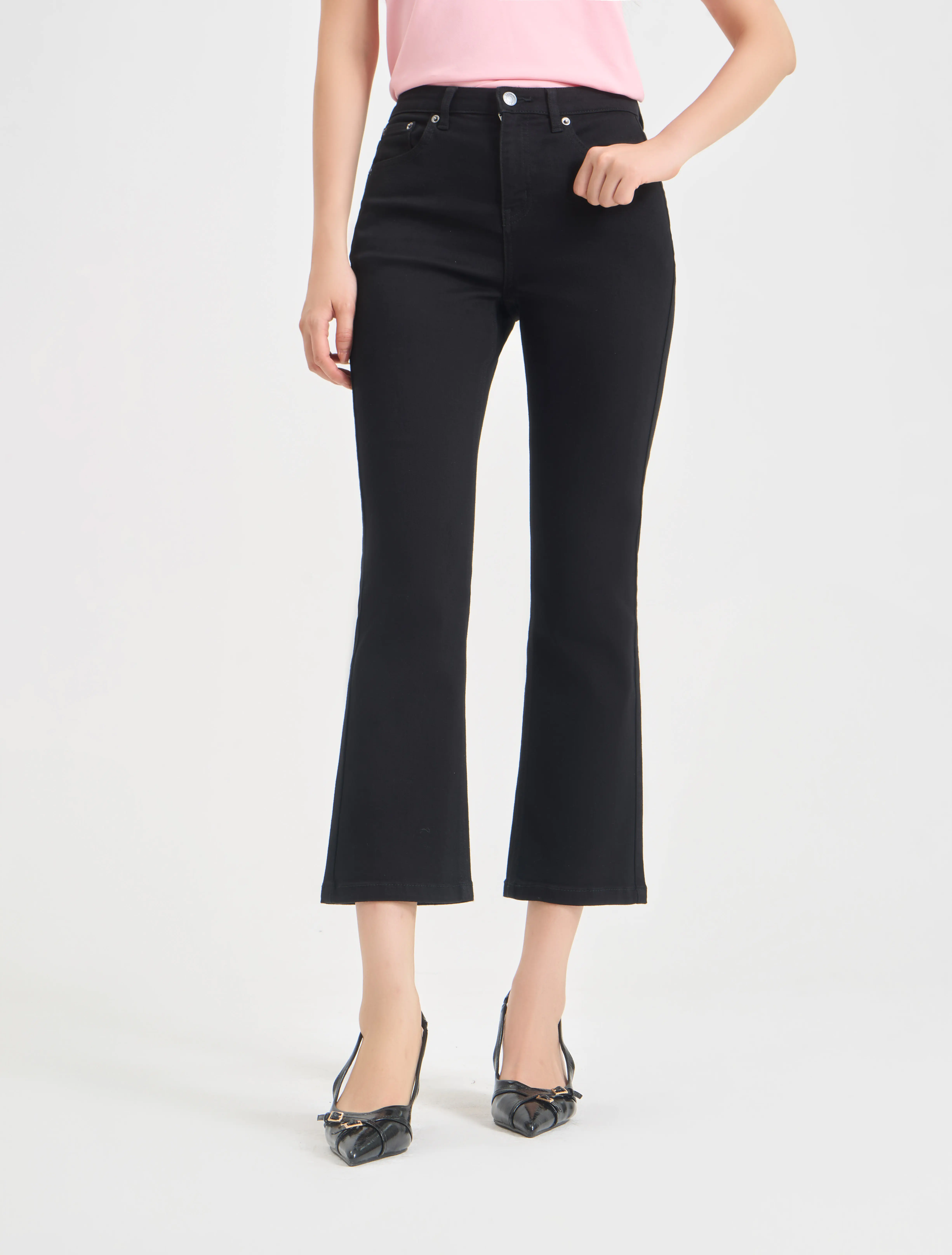 Quần jeans 5 túi màu đen siêu co giãn, dễ dàng ôm gọn các đường cong cơ thể bạn. Dáng quần ôm gọn từ cạp cho tới đùi và loe từ đầu gối xuống tới gấu. phom quần ống lửng được thiết kế thoải mái, với phần ống loe hiện đại, cá tính.