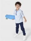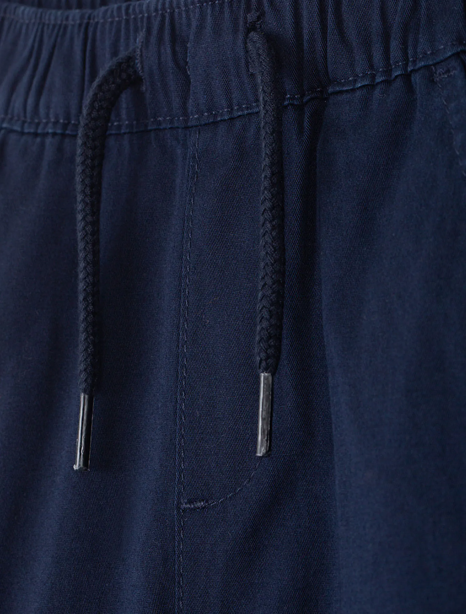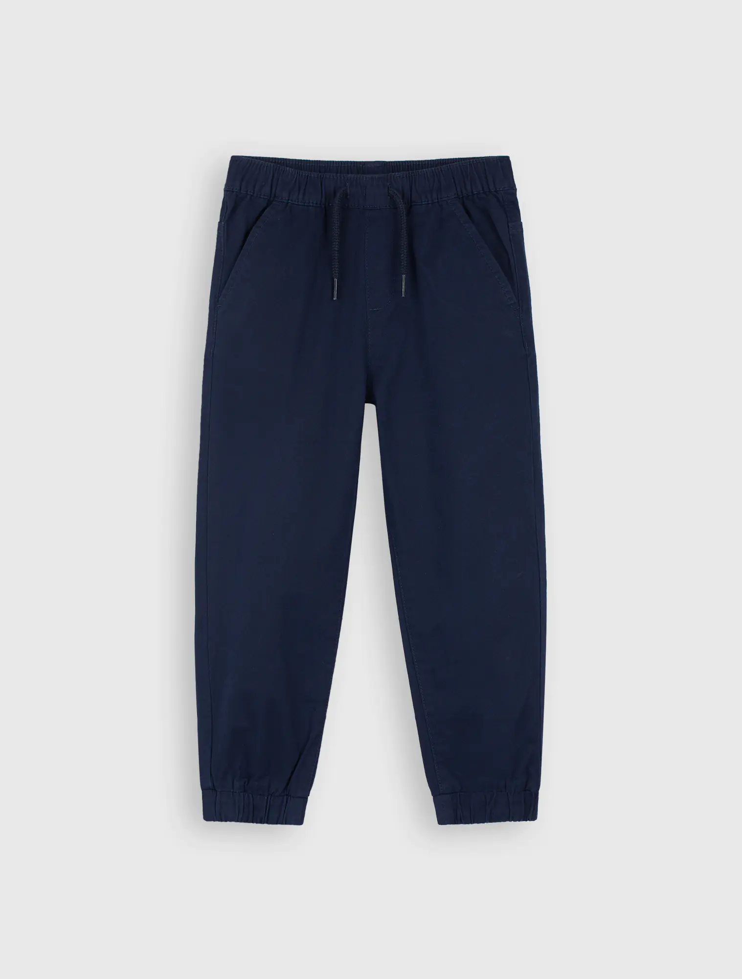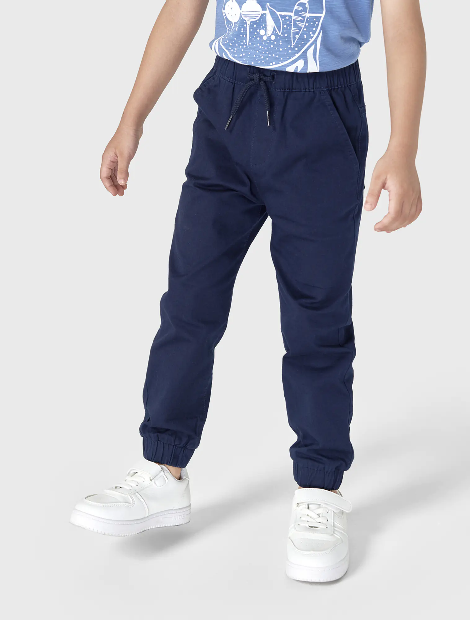 Quần khaki chất liệu cotton spandex, cạp chun luồn dây dệt, túi chéo, dáng jogger.