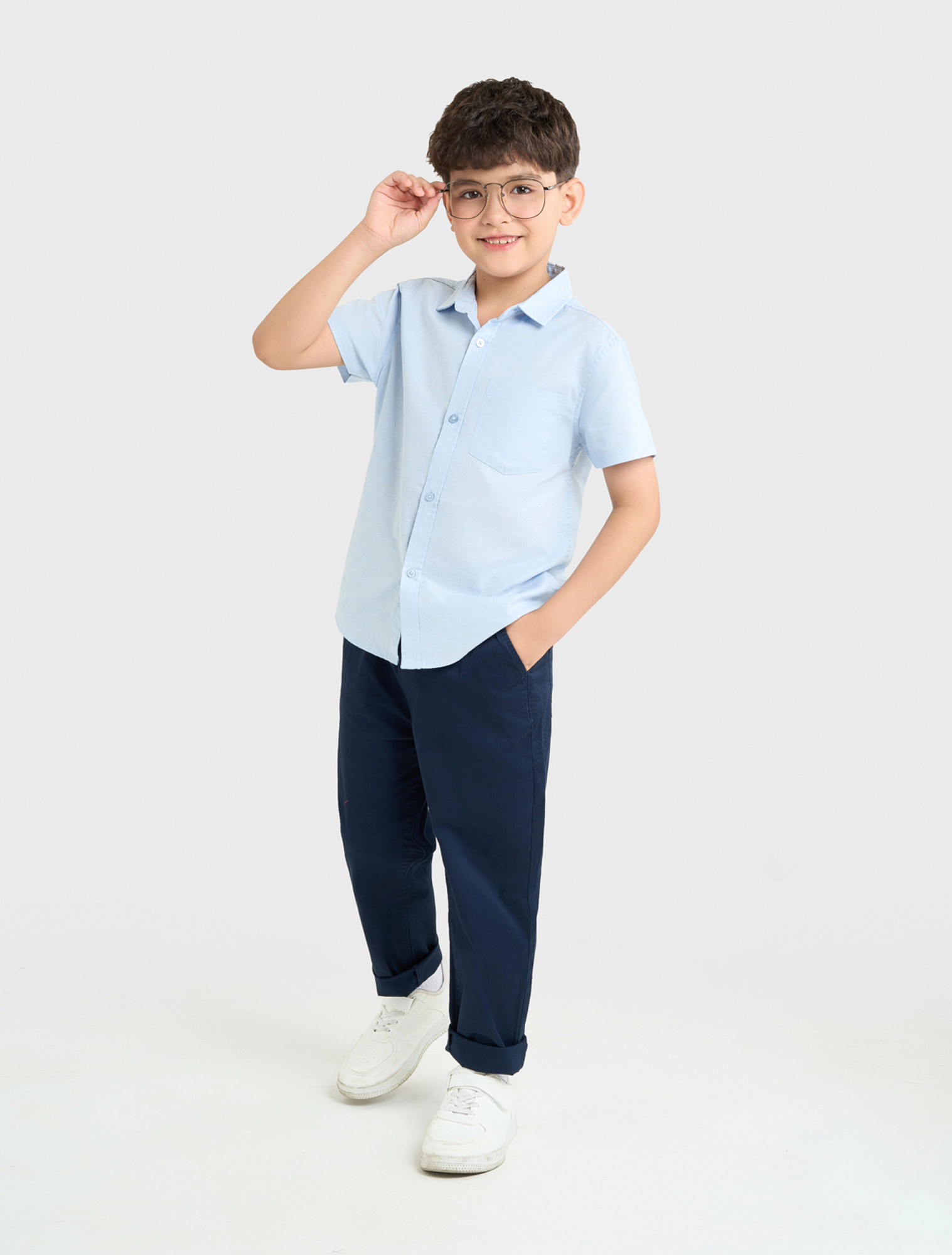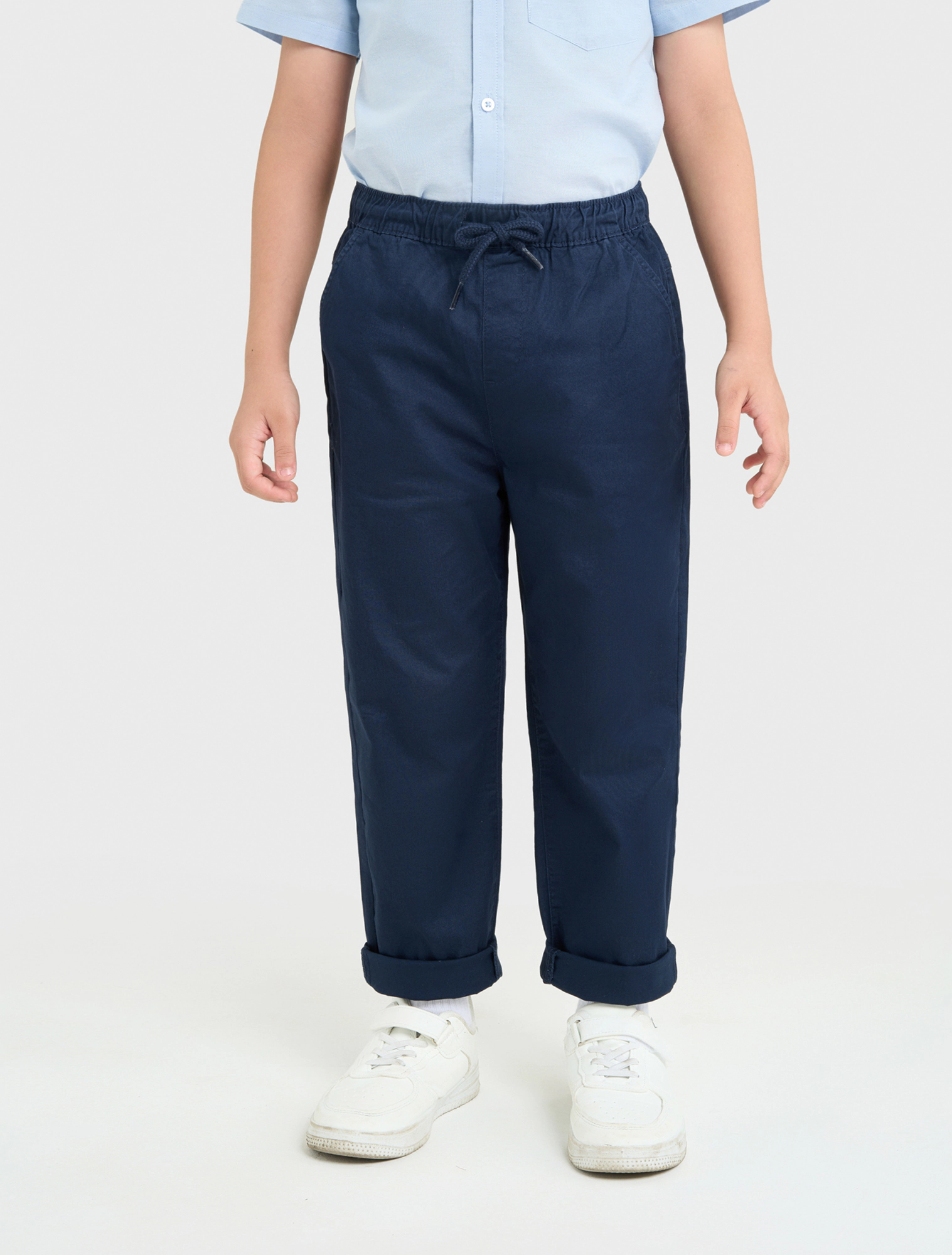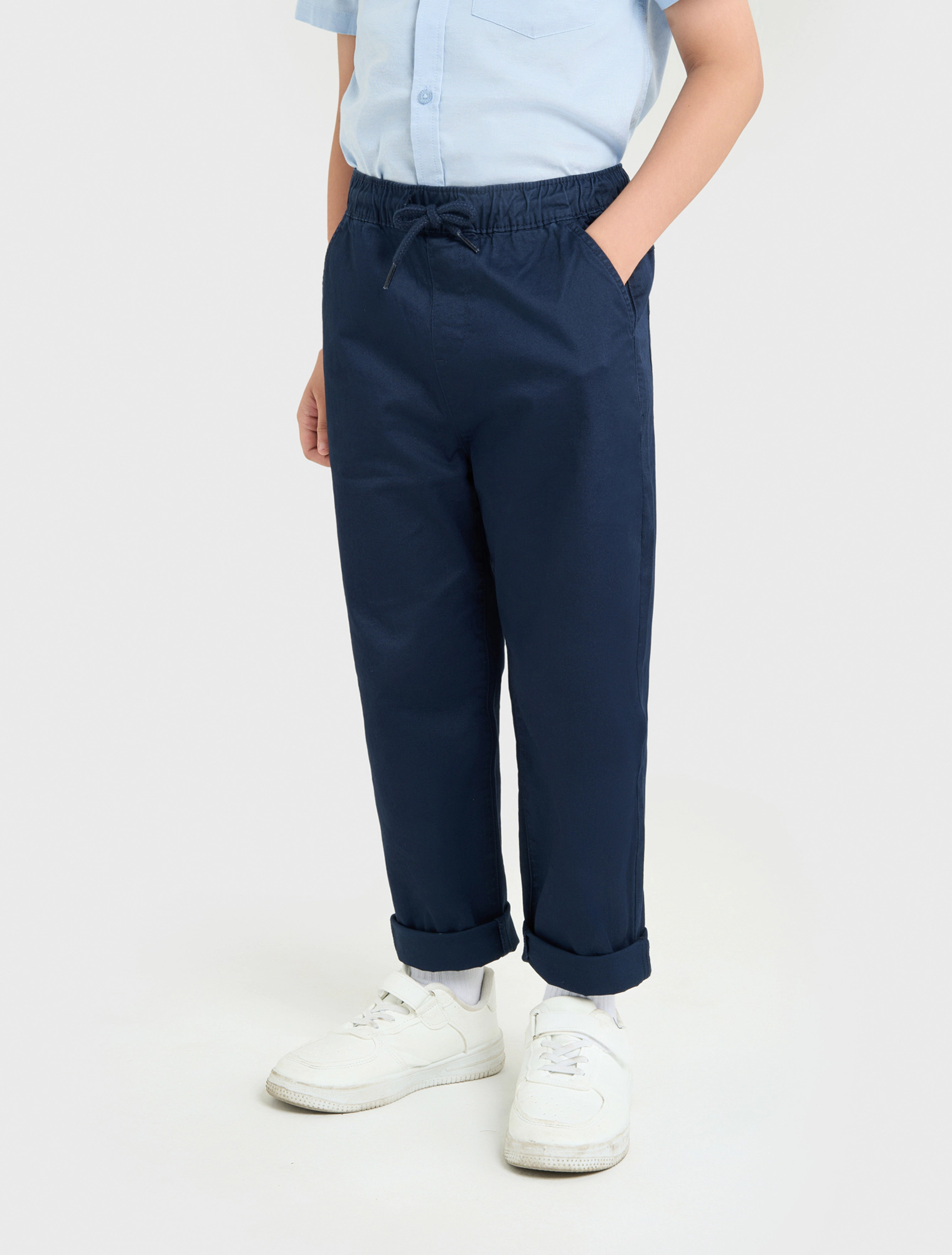 Quần khaki bé trai dáng suông, cạp chun, túi chéo.