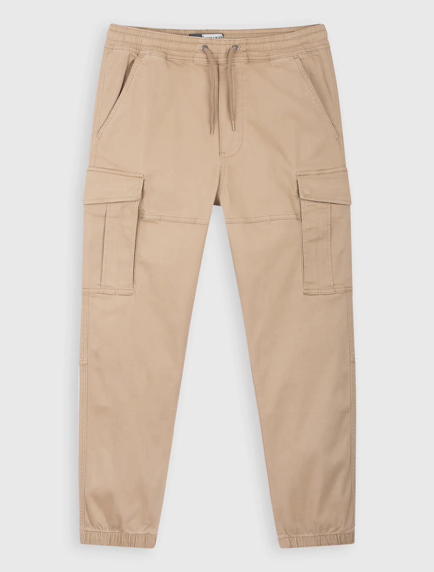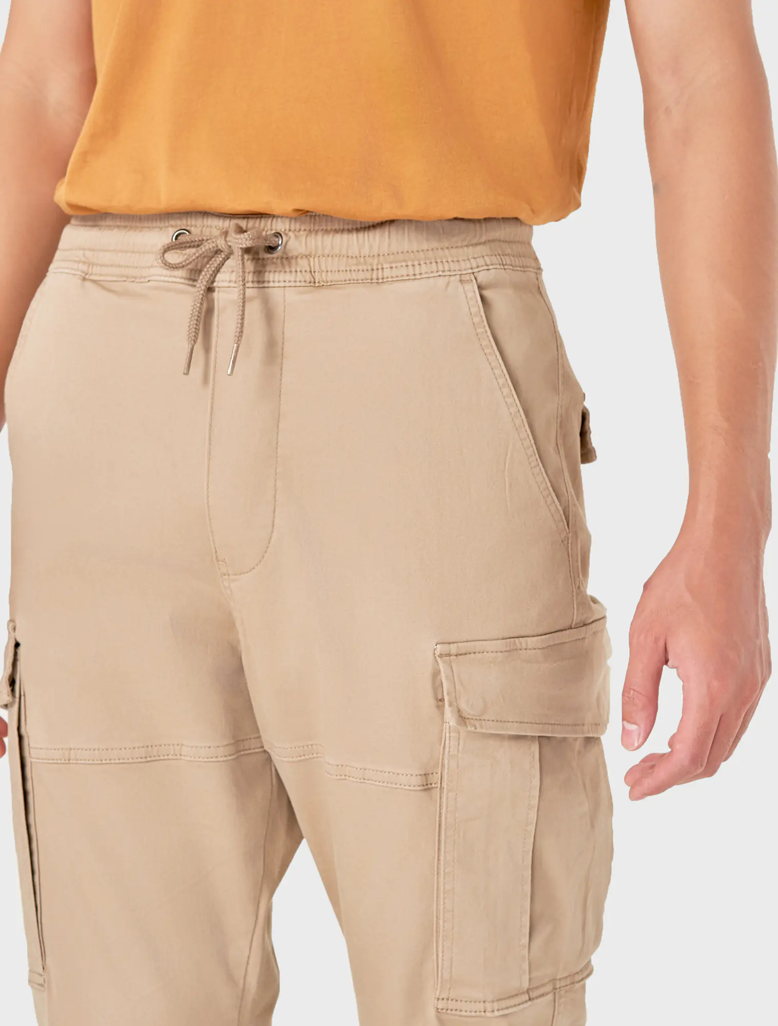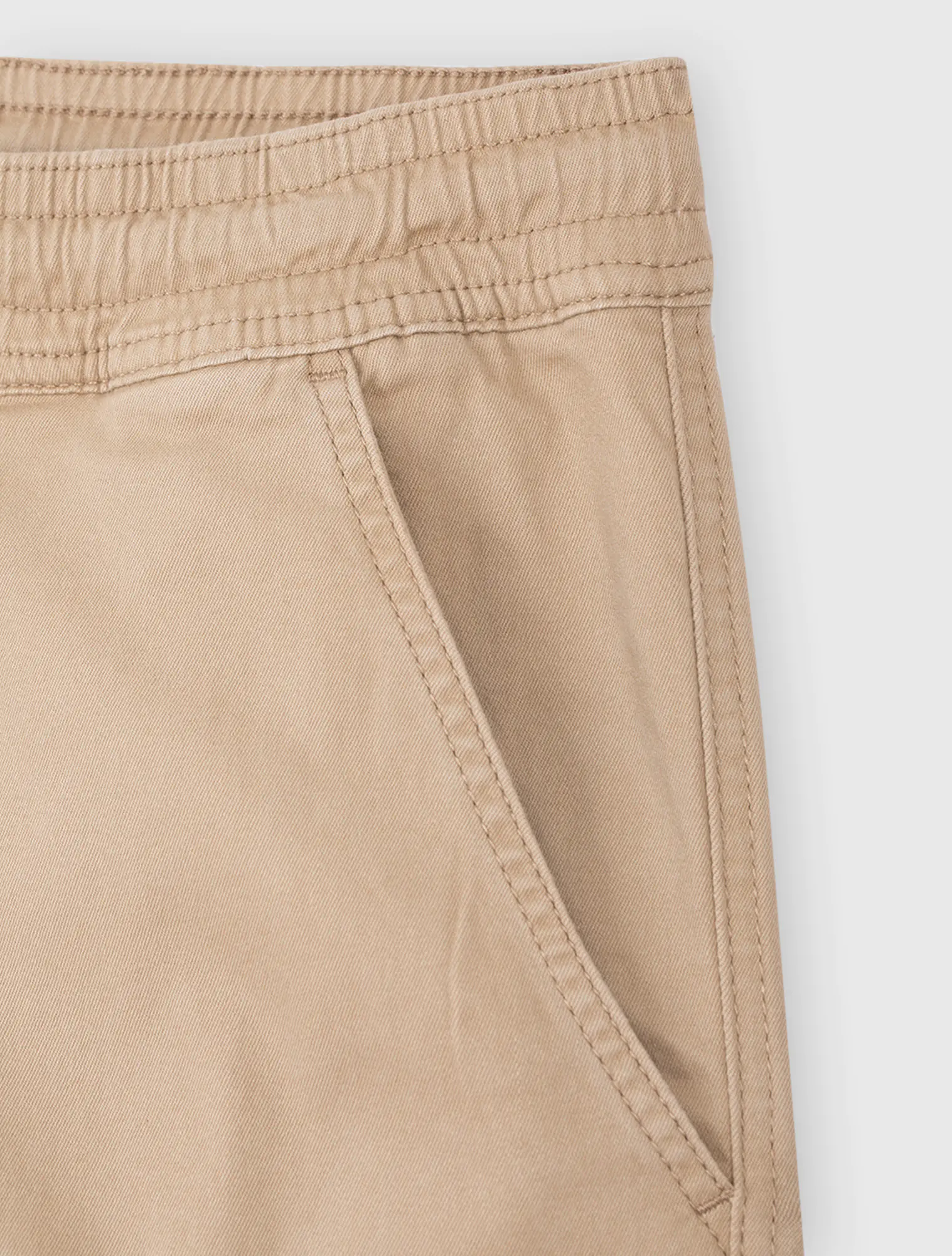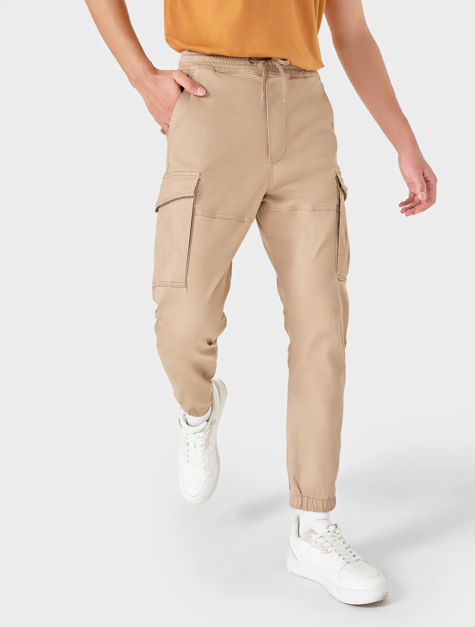 Quần khaki chất liệu cotton spandex, cạp chun luồn dây dệt, túi ốp 2 bên, dáng jogger.
