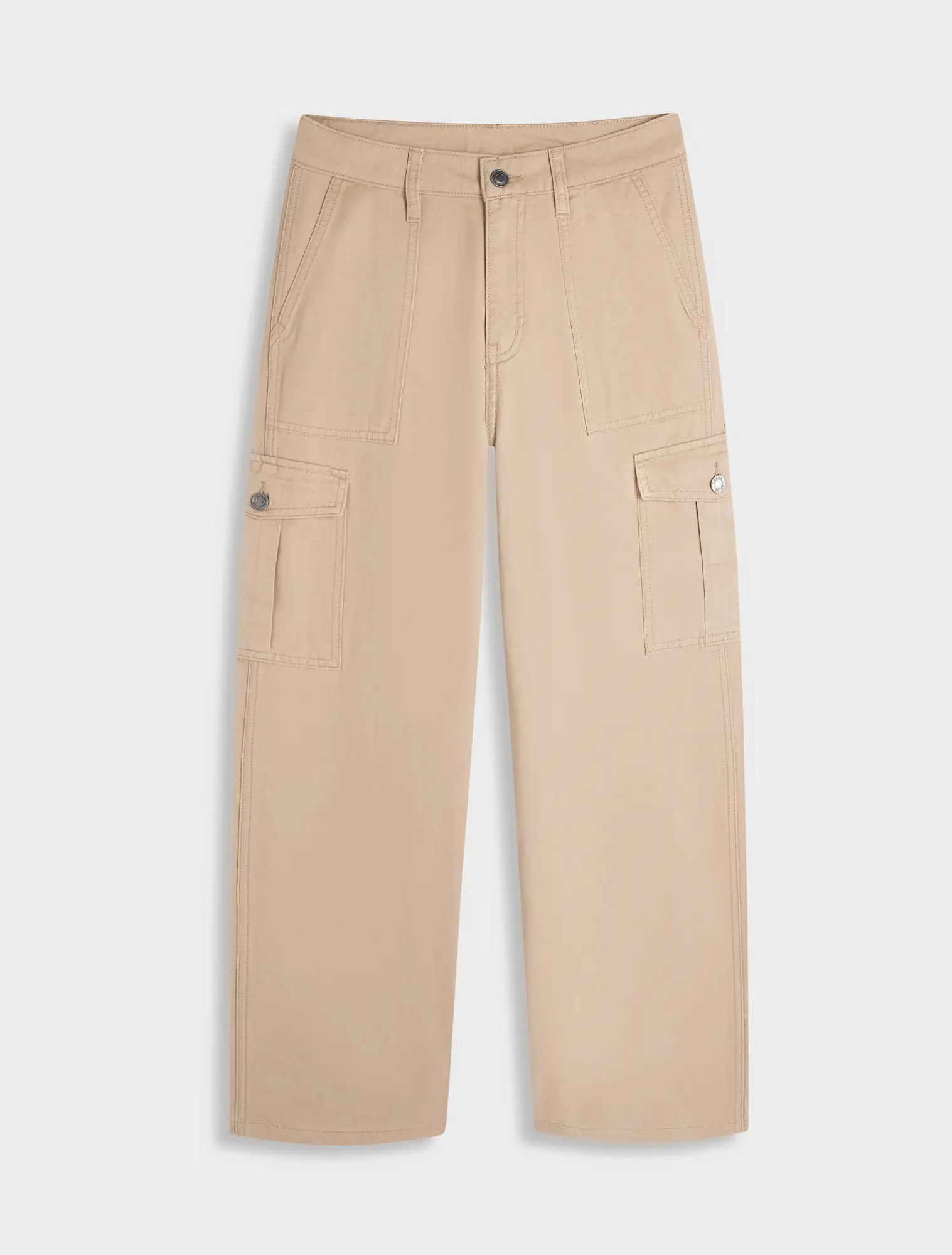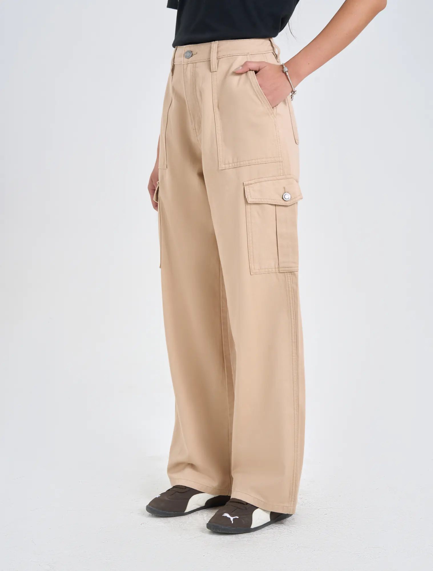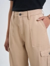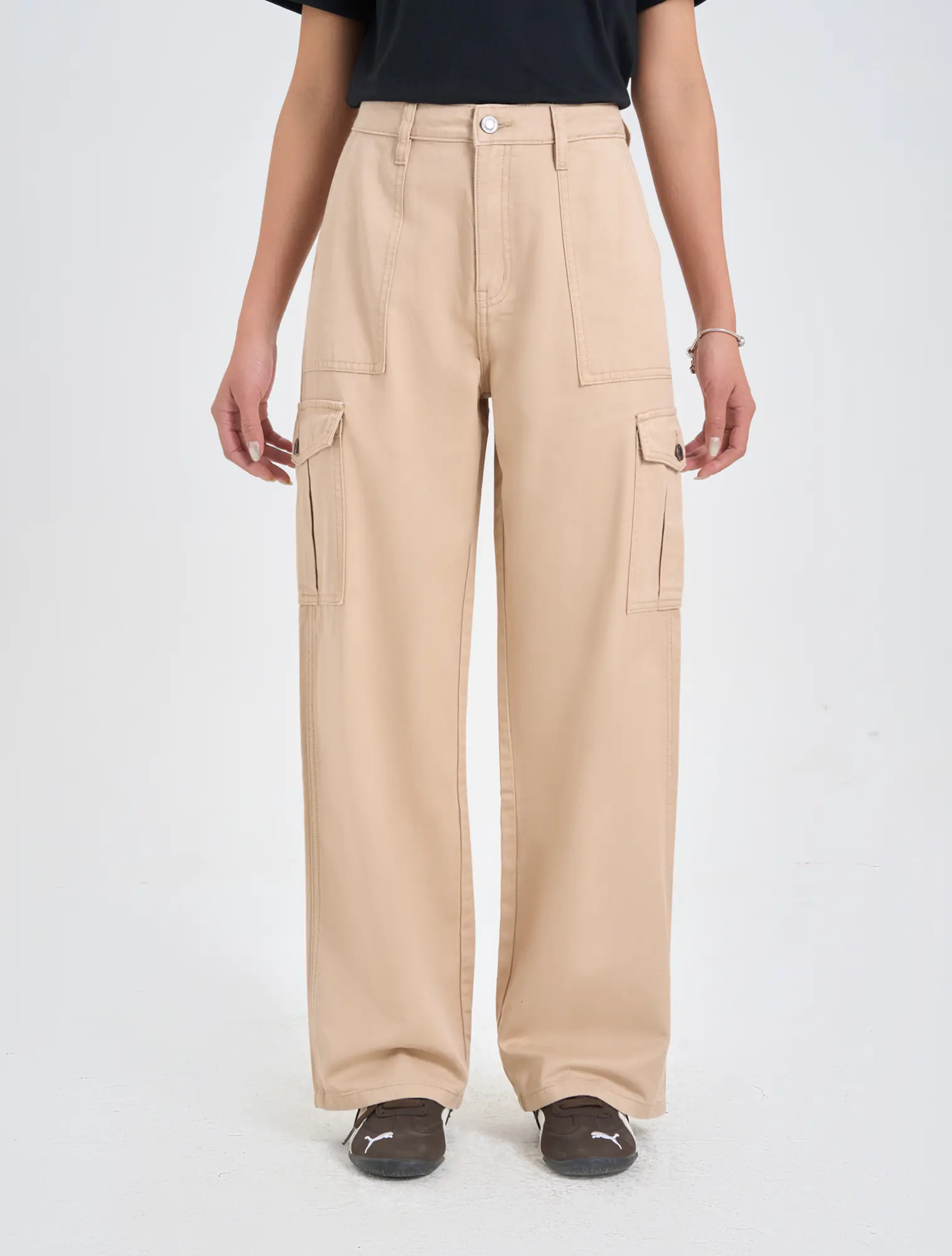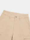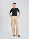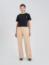 Quần dài khaki nữ dáng suông, với thiết kế túi hộp và điểm nhấn phối chỉ cá tính.
