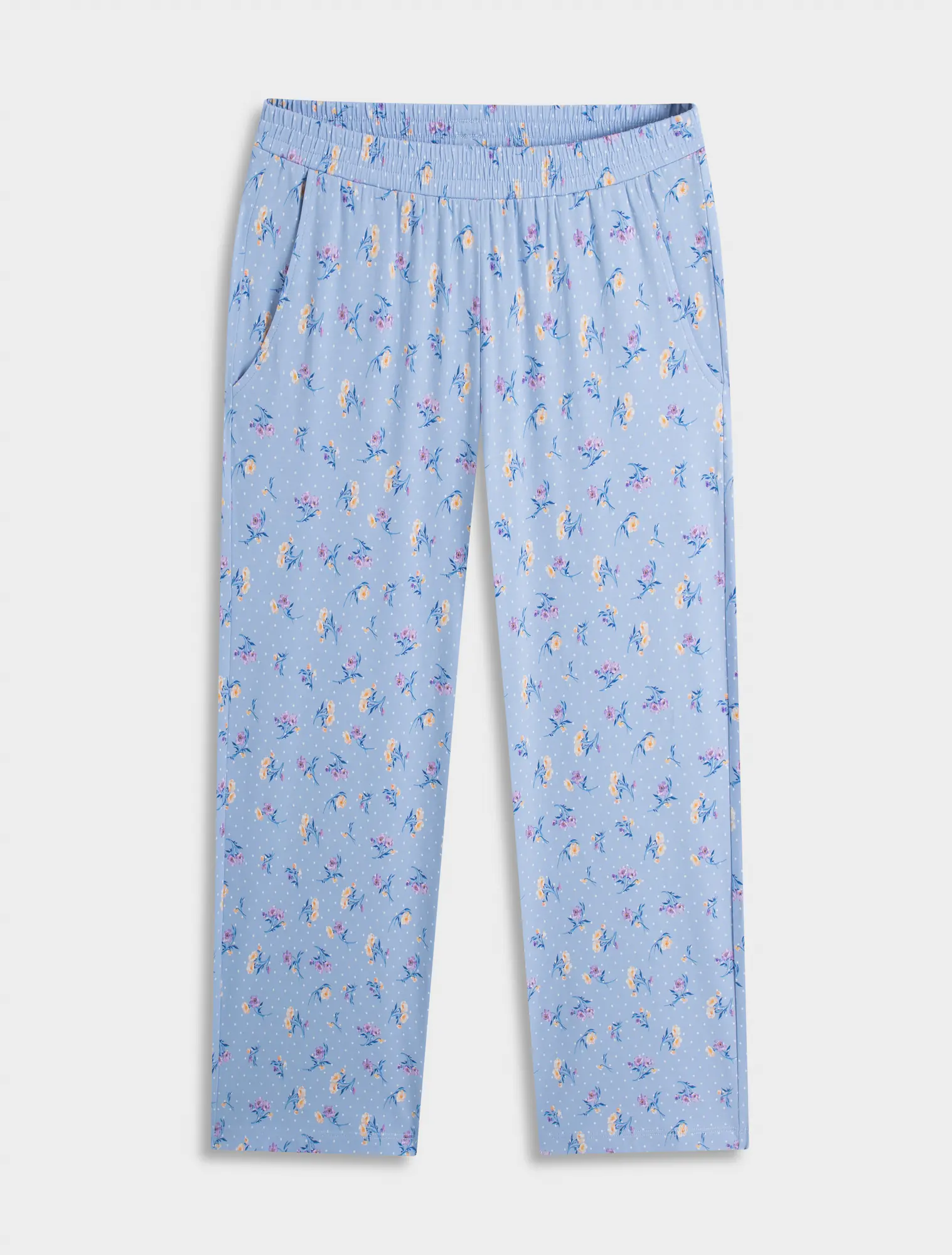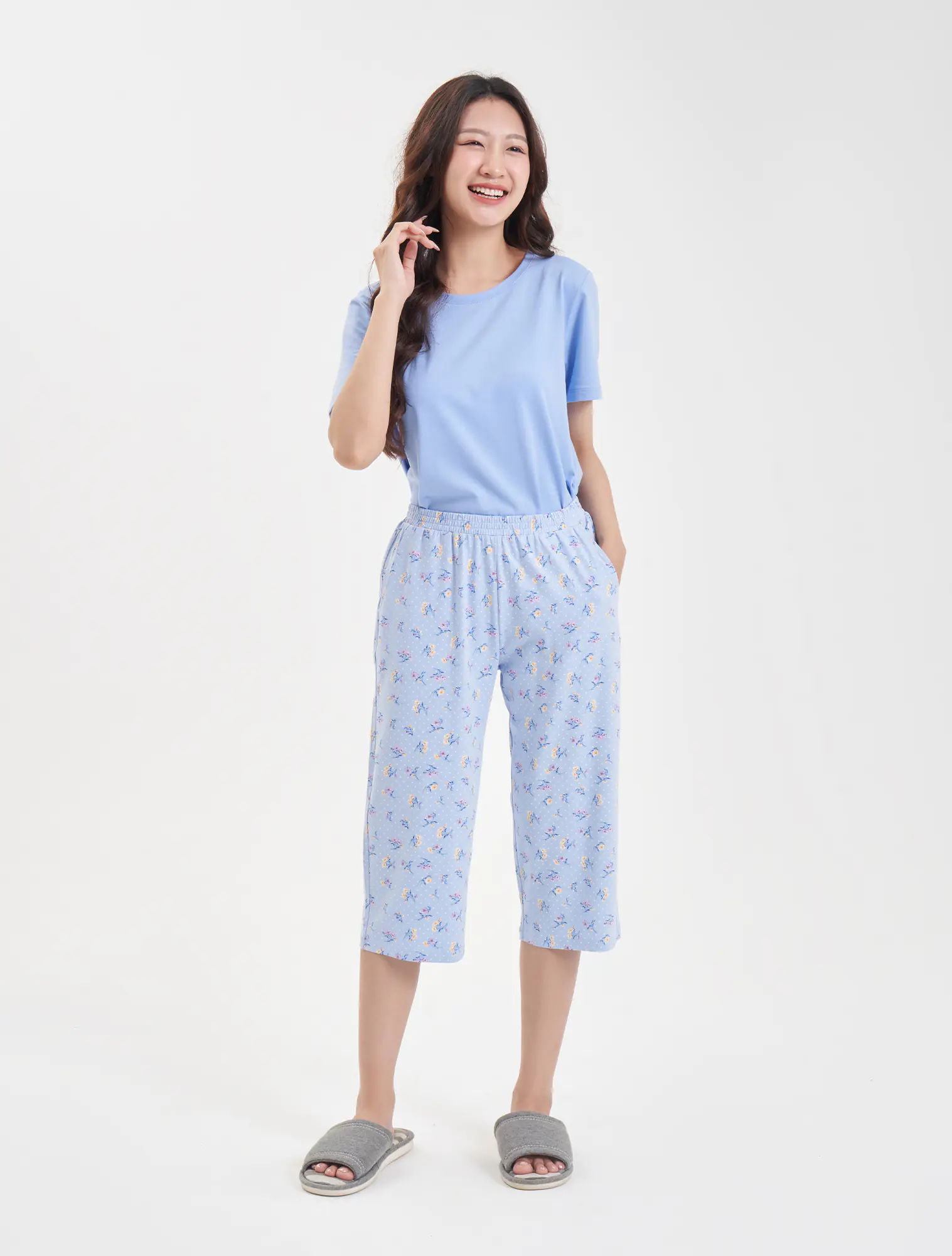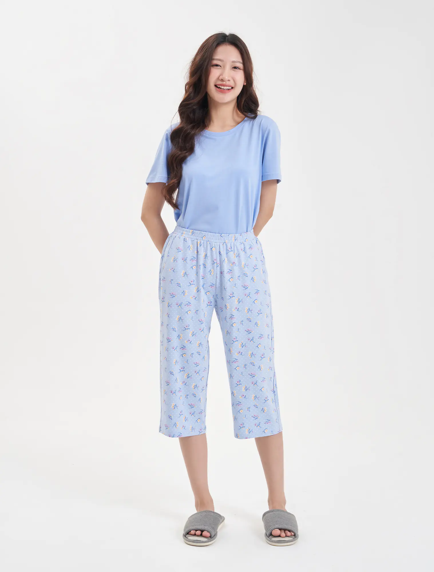 Quần mặc nhà nữ dáng lỡ qua đầu gối. Kiểu quần cơ bản, dễ mặc. Màu sắc họa tiết nhẹ nhàng, sạch sẽ, phù hợp các hoạt động nghỉ ngơi.