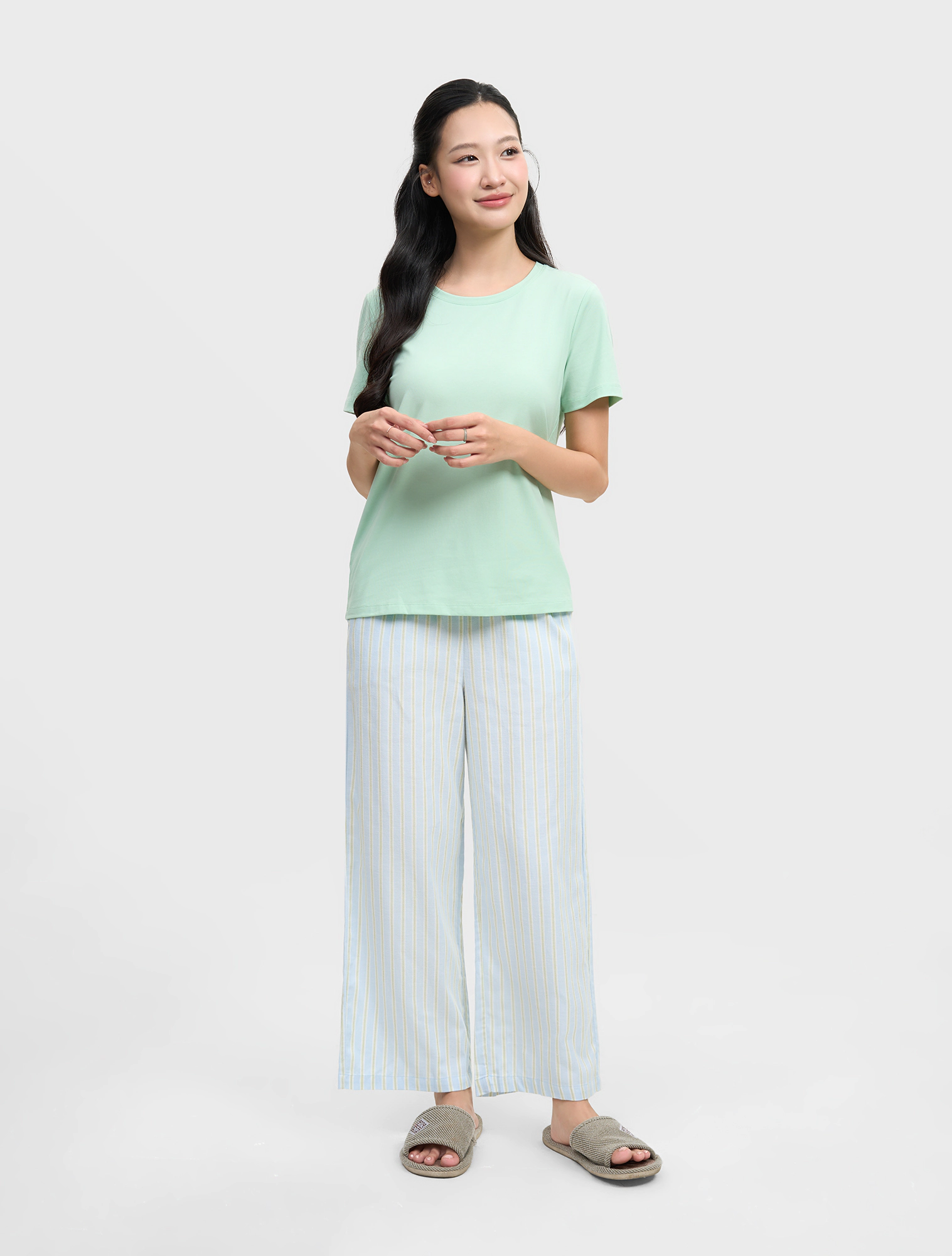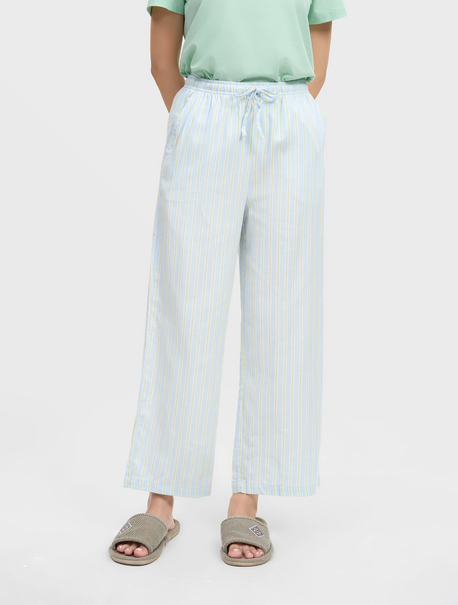 Quần dài mặc nhà nữ vải kẻ với màu sắc tươi sáng tạo nên sự tươi mới cho sản phẩm mặc nhà.