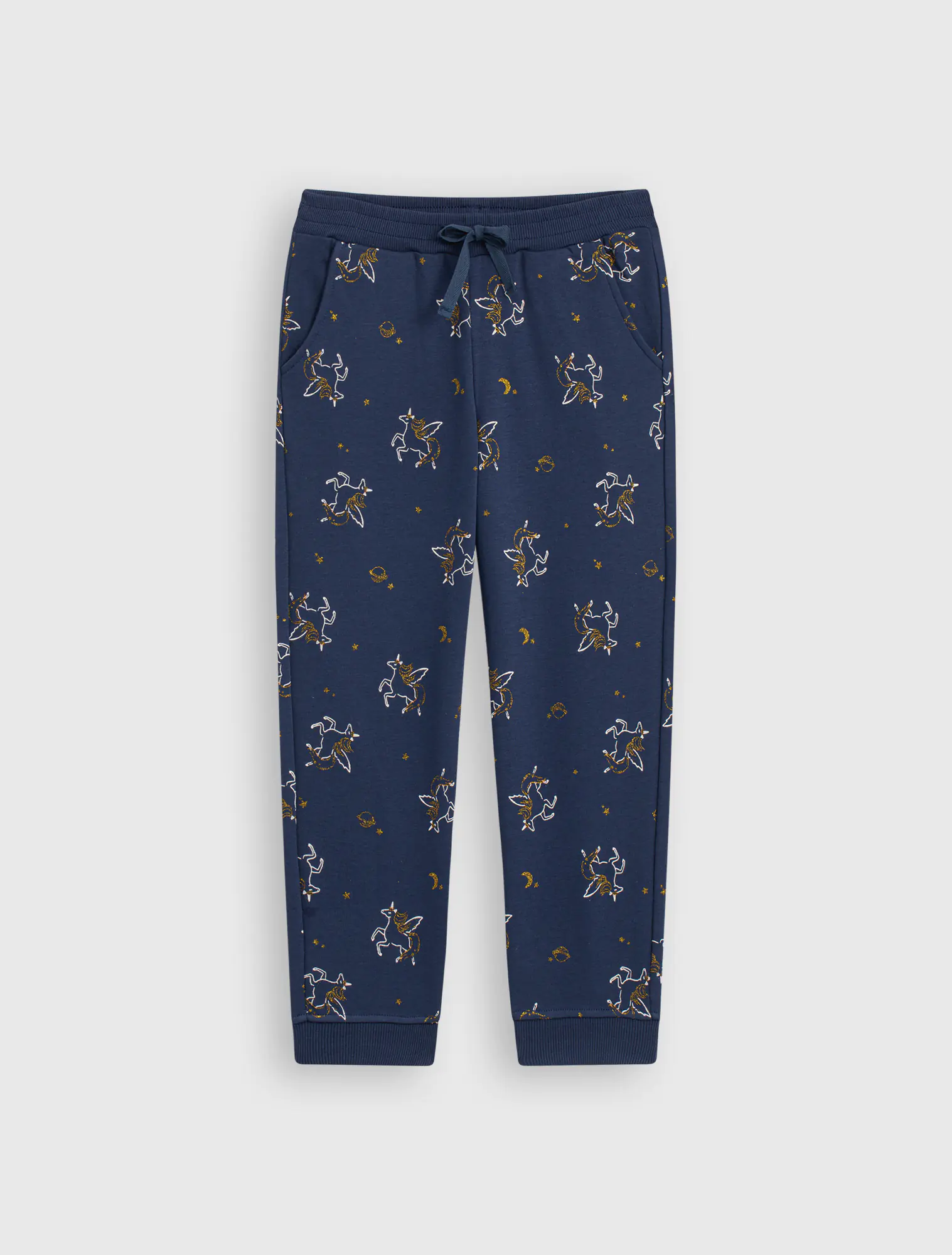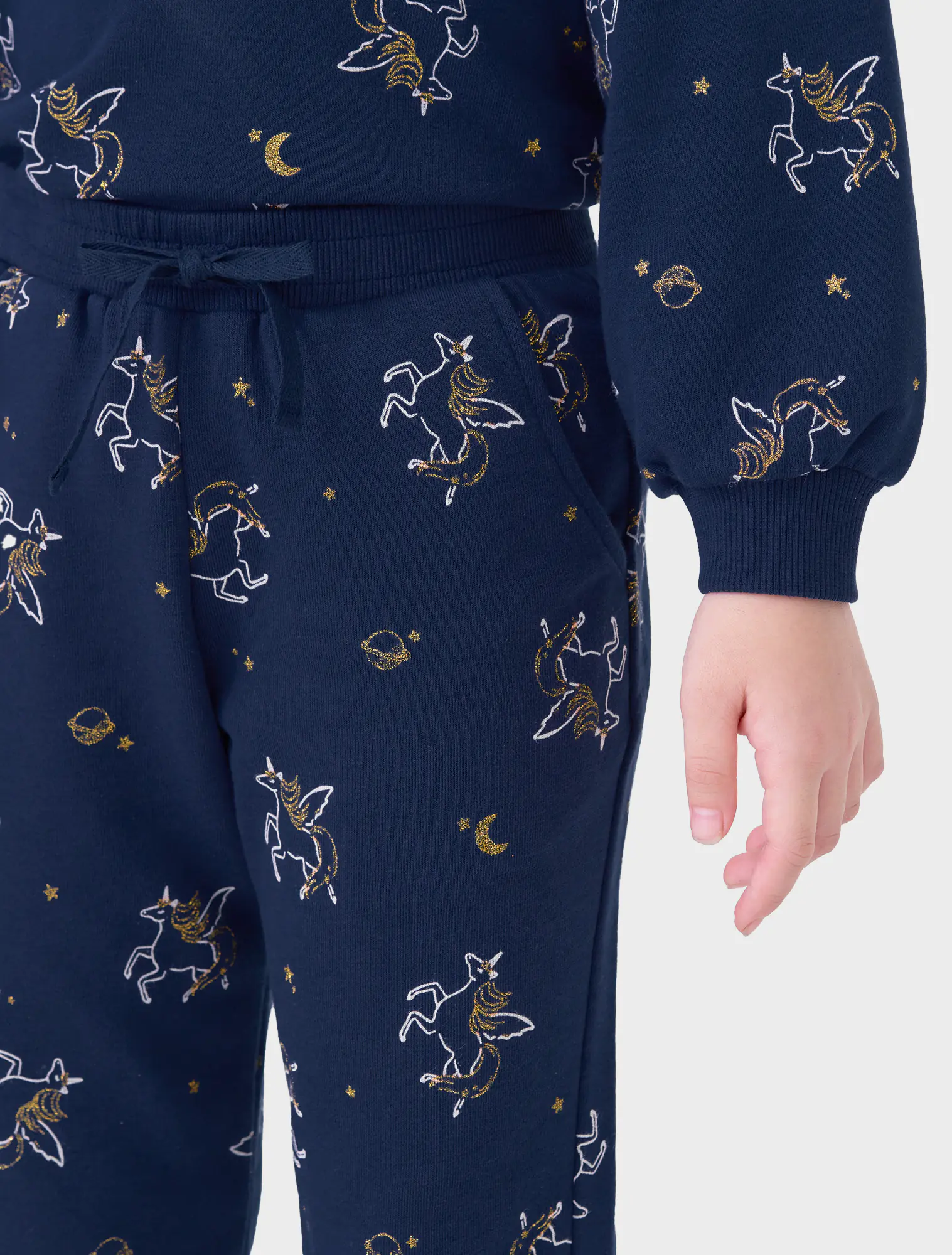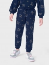 Quần nỉ bé gái phom dáng regular, chất liệu cotton pha tạo sự thoải mái cho trẻ vận động. Họa tiết in tràn nữ tính phù hợp với bé gái.