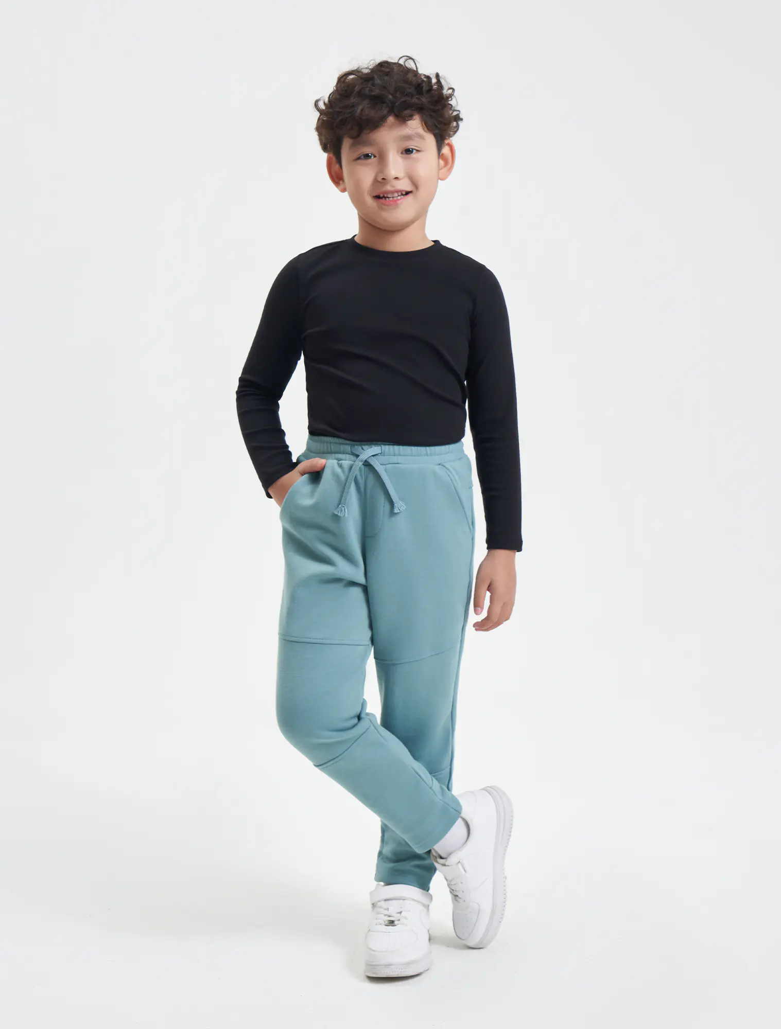 Quần nỉ bé trai phom dáng regular can phối gối tạo sự khỏe khoắn cho trẻ. Chất liệu cotton pha giúp trẻ thoải mái vận động.