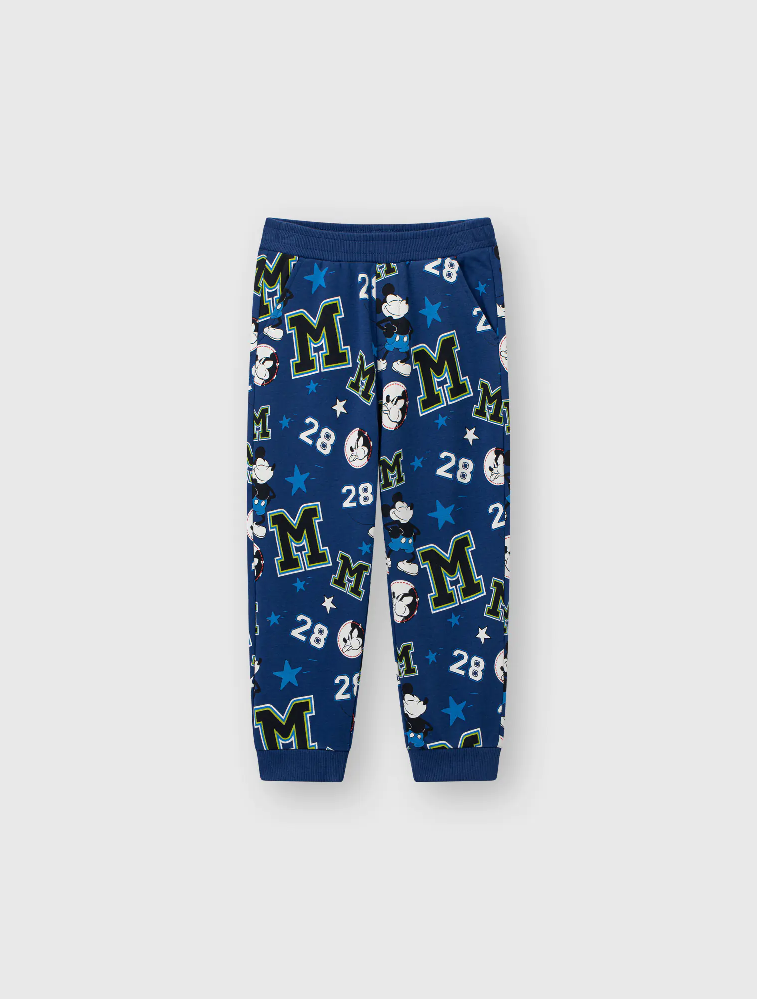 Quần nỉ bé trai phom dáng regular hình in tràn Mickey, chất liệu cotton pha giữ ấm cơ thể đồng thời tạo cảm giác thoải mái cho bé khi mặc.