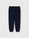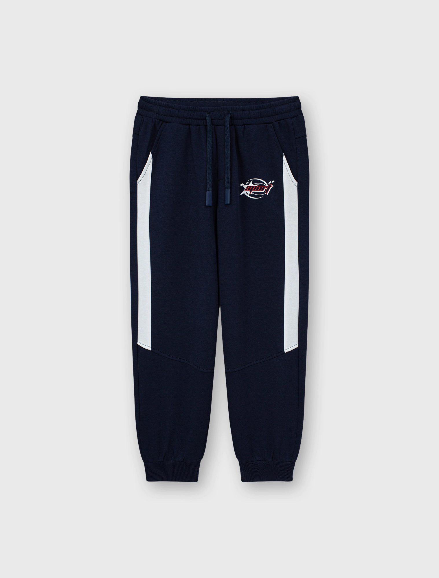 Quần nỉ interlock bé trai phối màu dọc hai bên. Cạp luồn chun có dây dệt, gấu bo khỏe khắn.