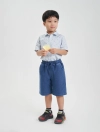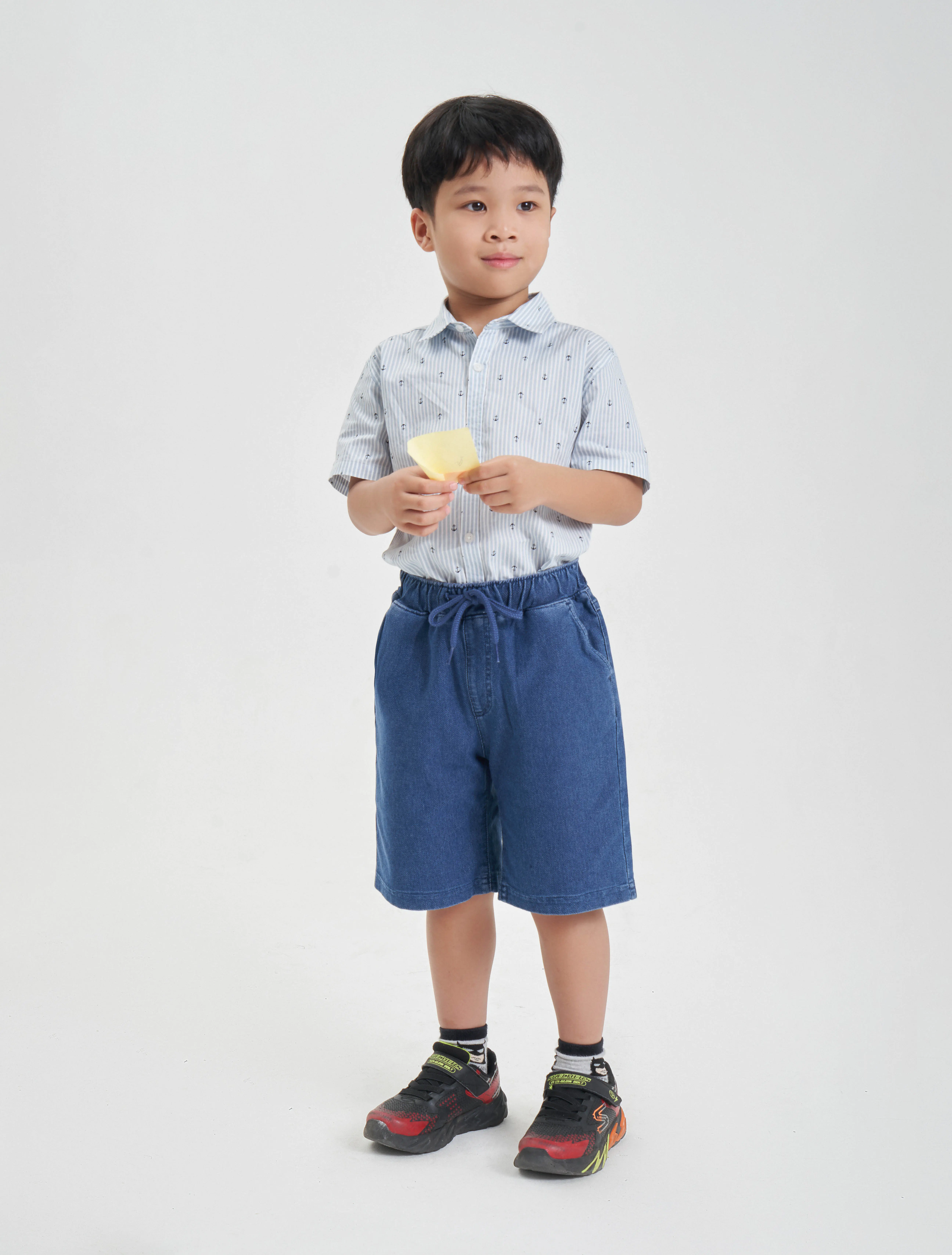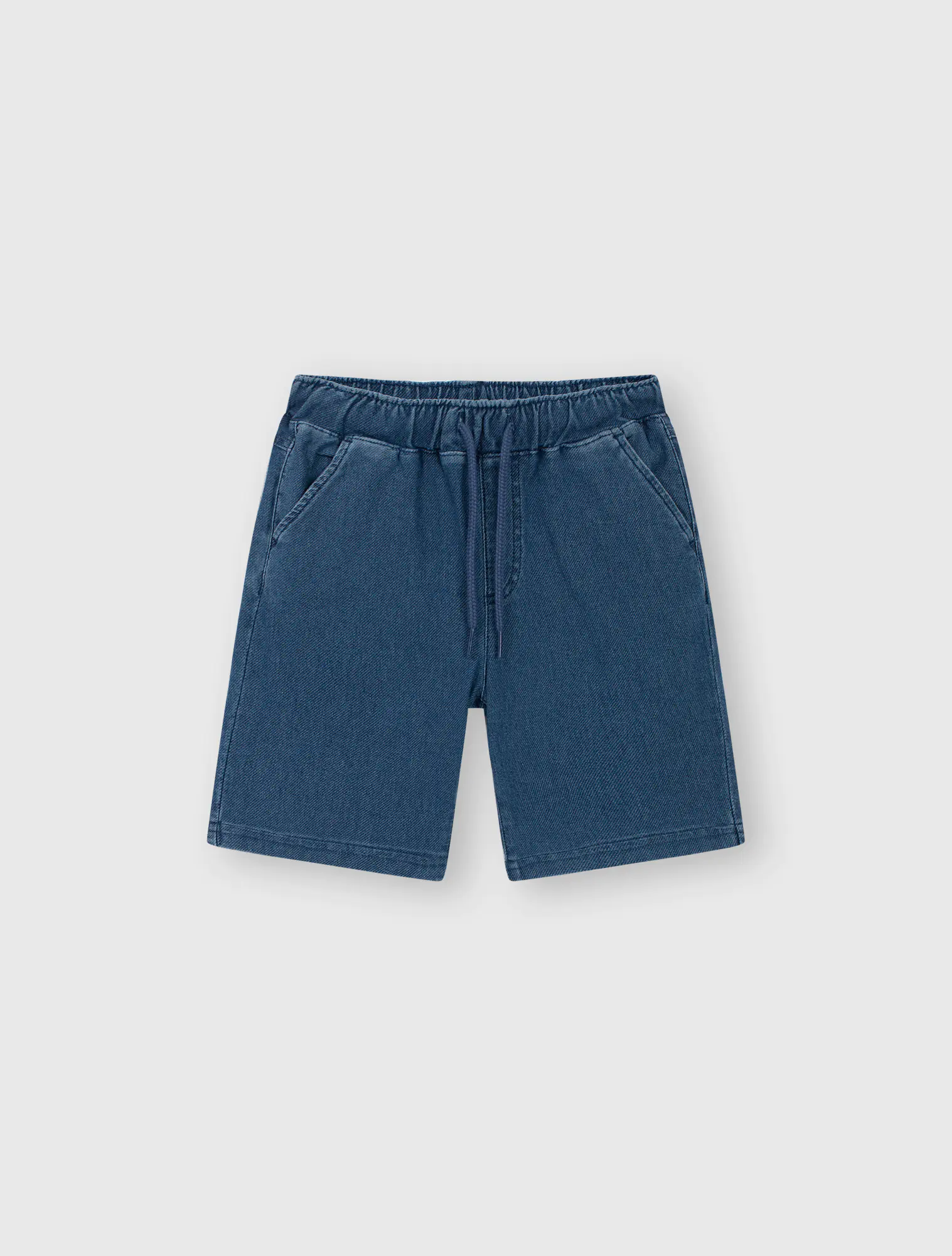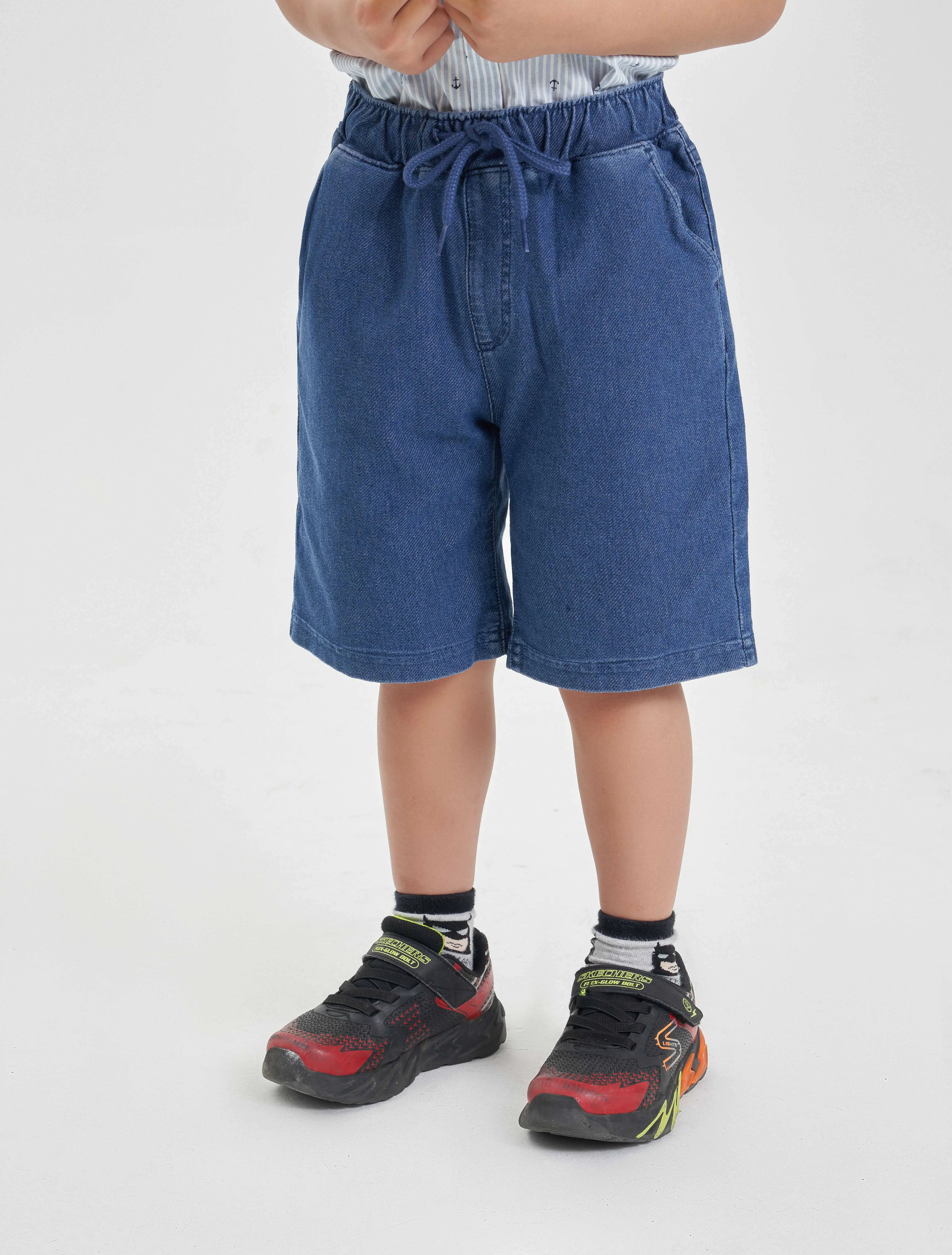 Quần soóc cạp co giãn, có dây rút điều chỉnh dây ở phía trước. Có hai túi phía trước. Phom dáng cơ bản.
