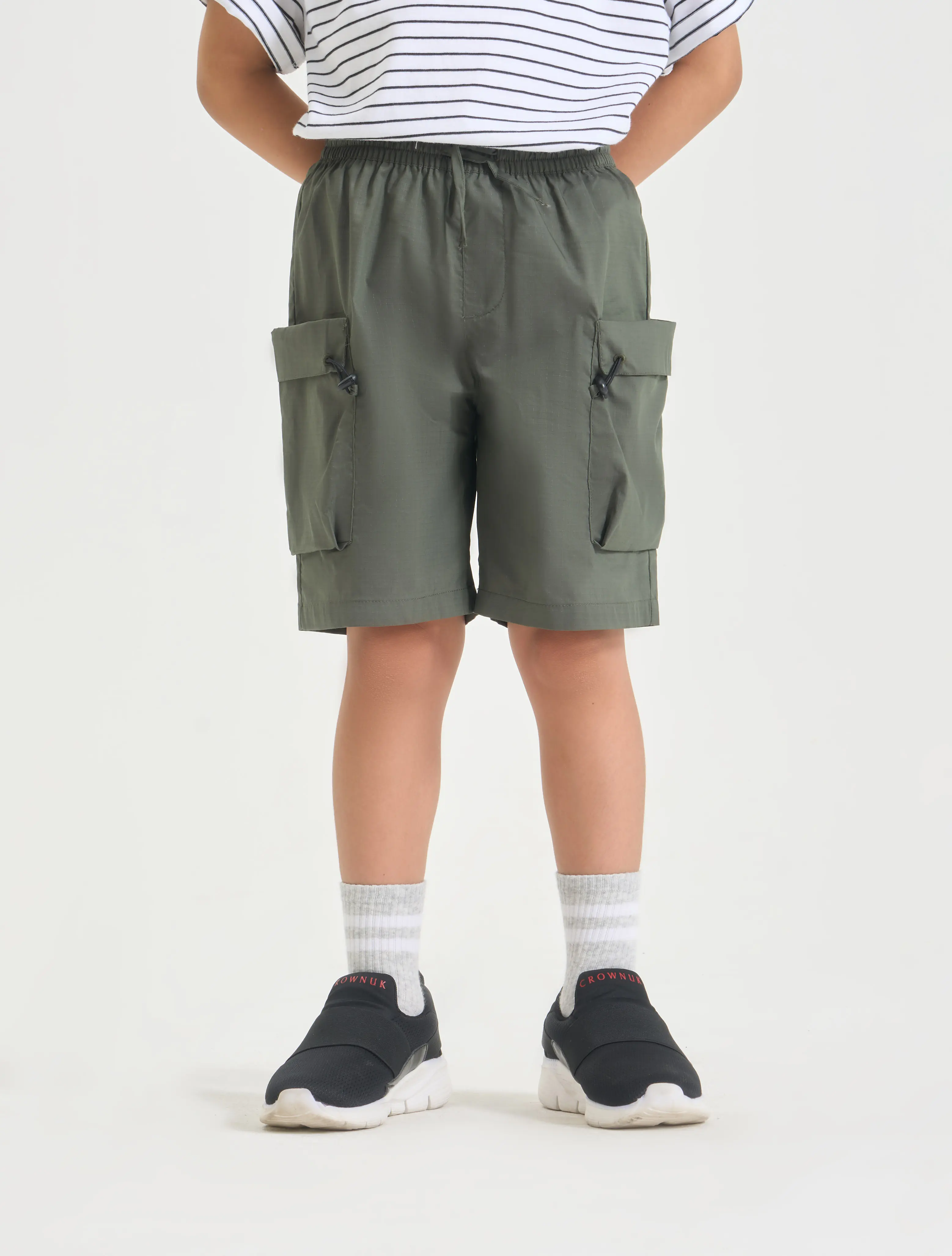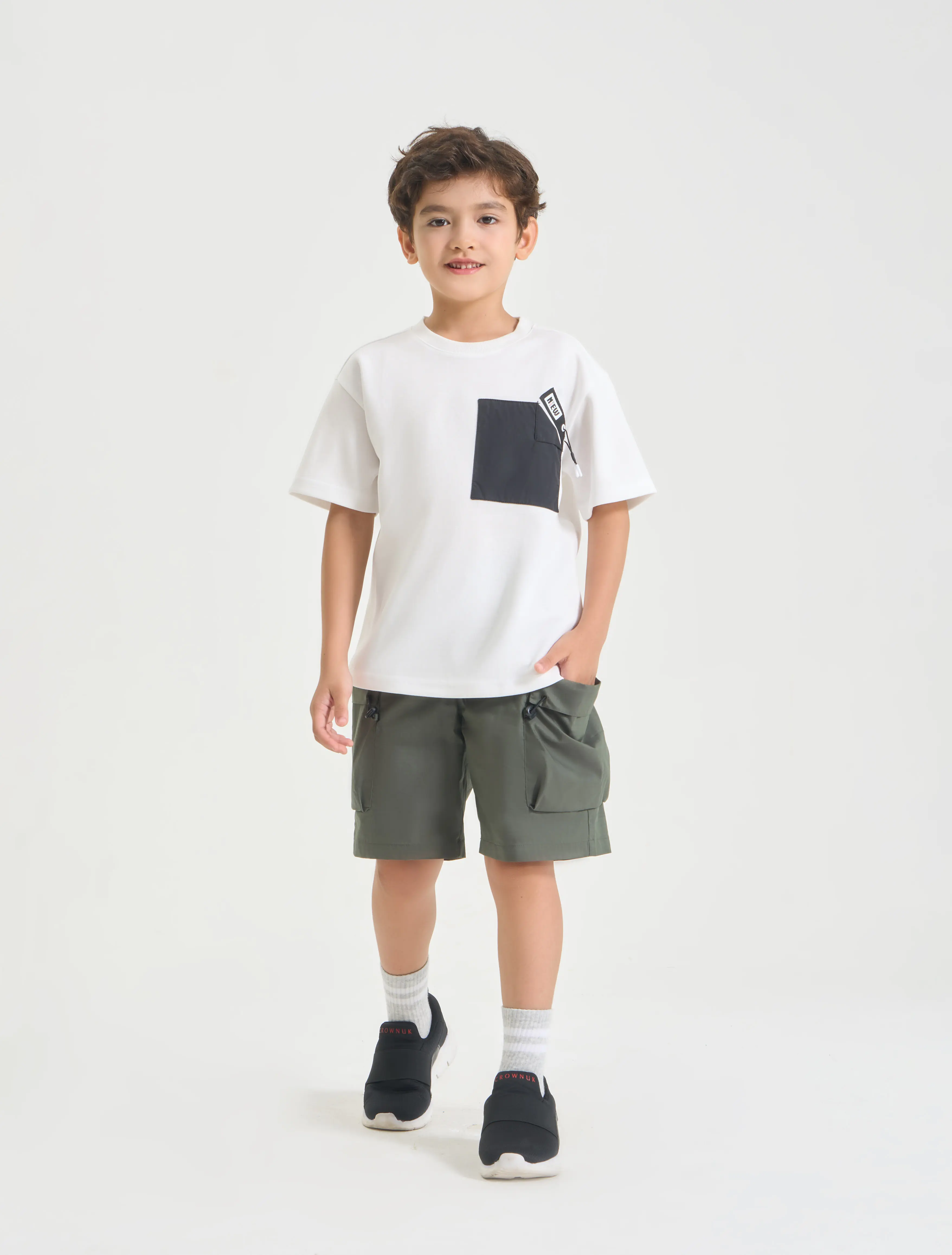 Quần soóc khaki bé trai có ốp túi hộp hai bên. Kiểu dáng hiện đại, cá tính giúp bé thể hiện phong cách năng động, khỏe khoắn.