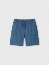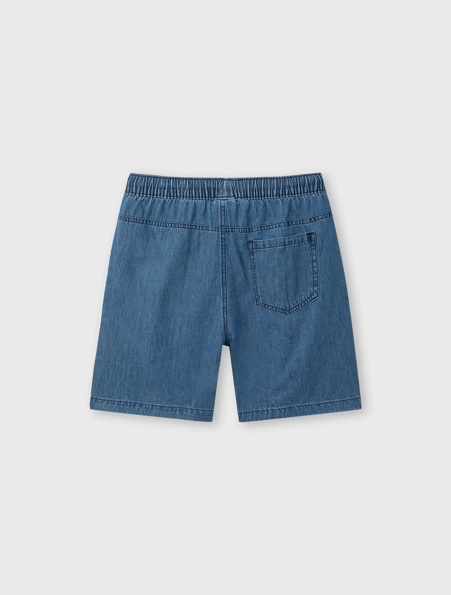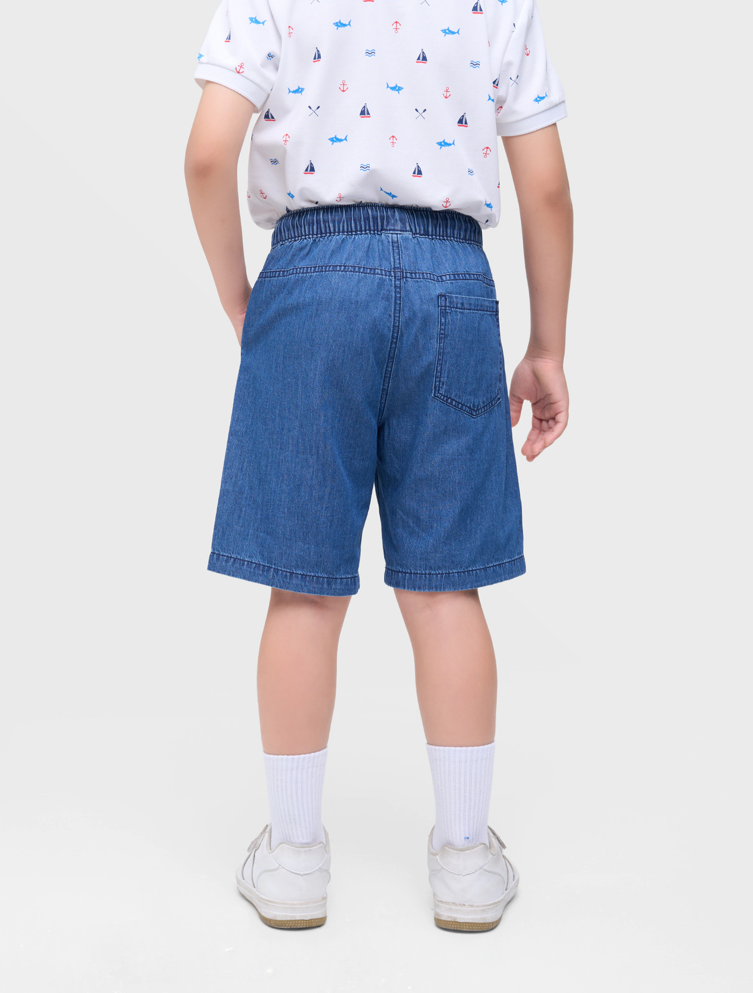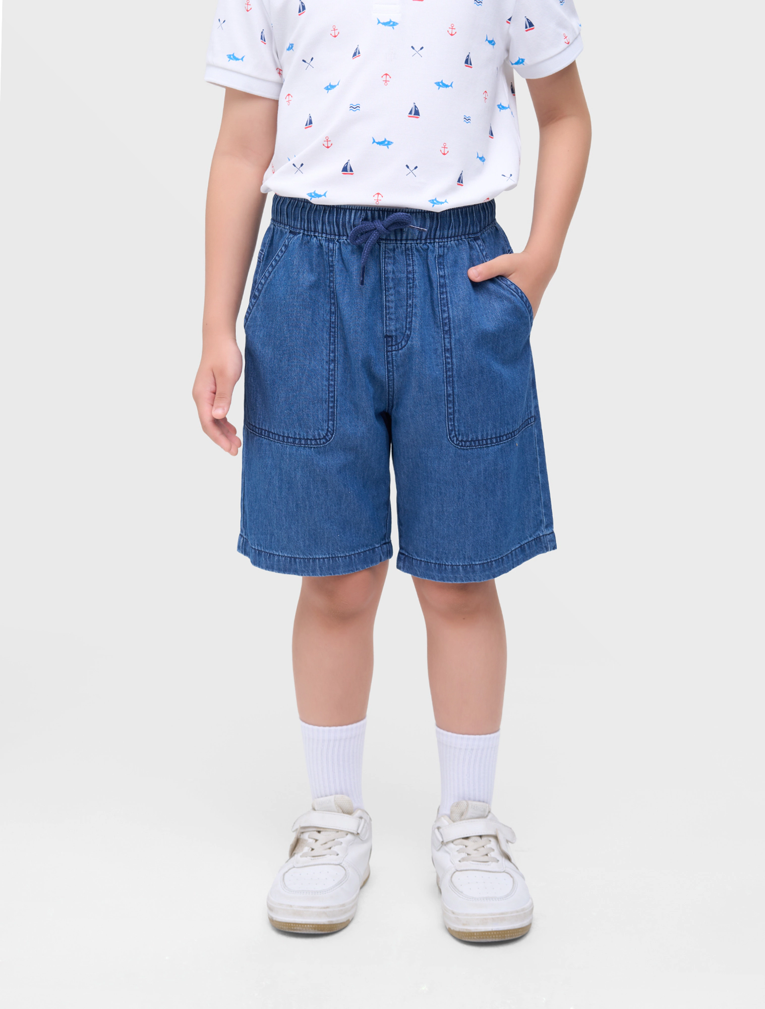Quần soóc chất liệu denim 100% cotton, nẹp kéo khoá giả, túi hai bên và một túi sau.