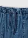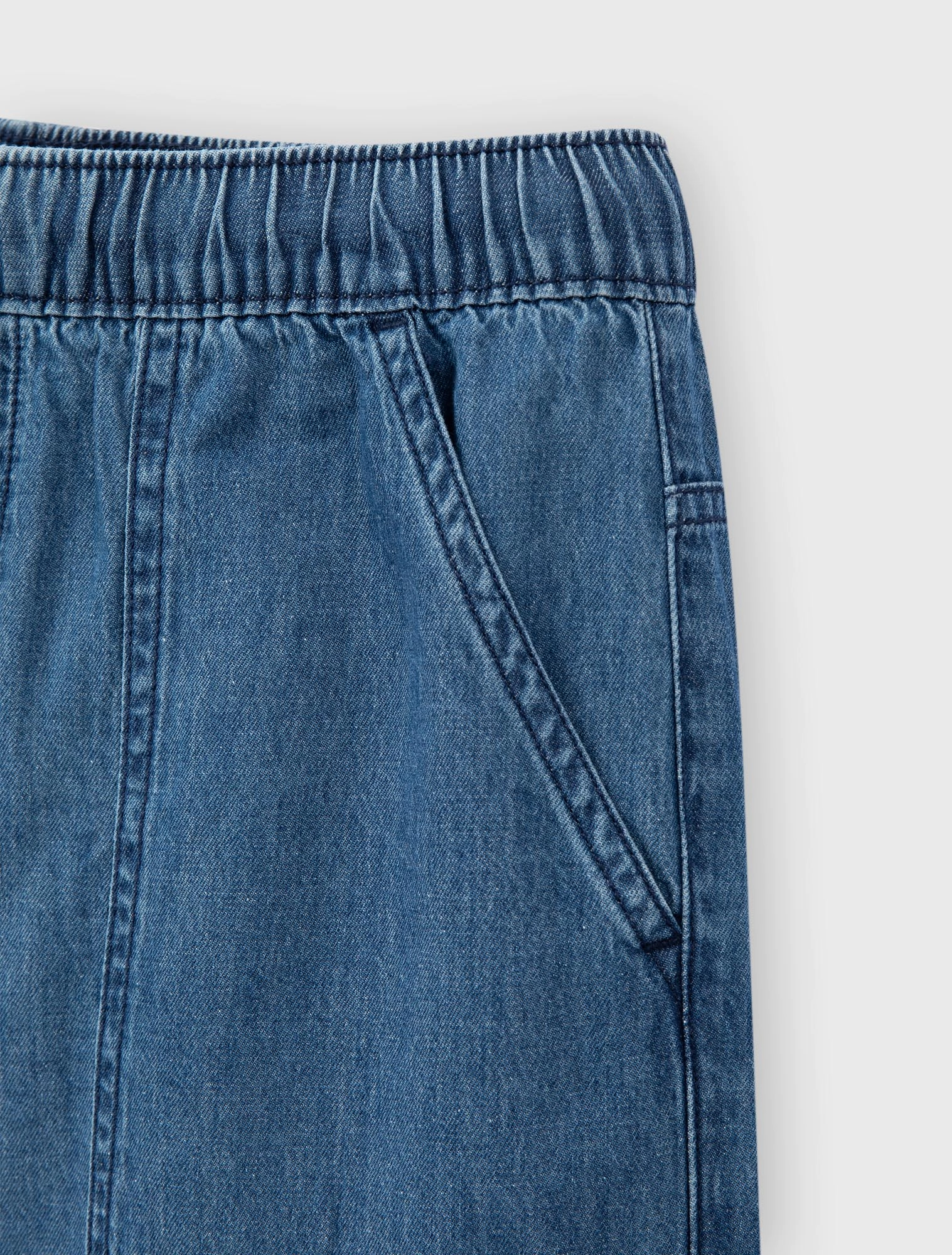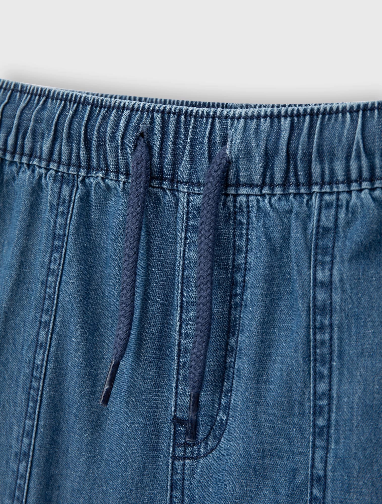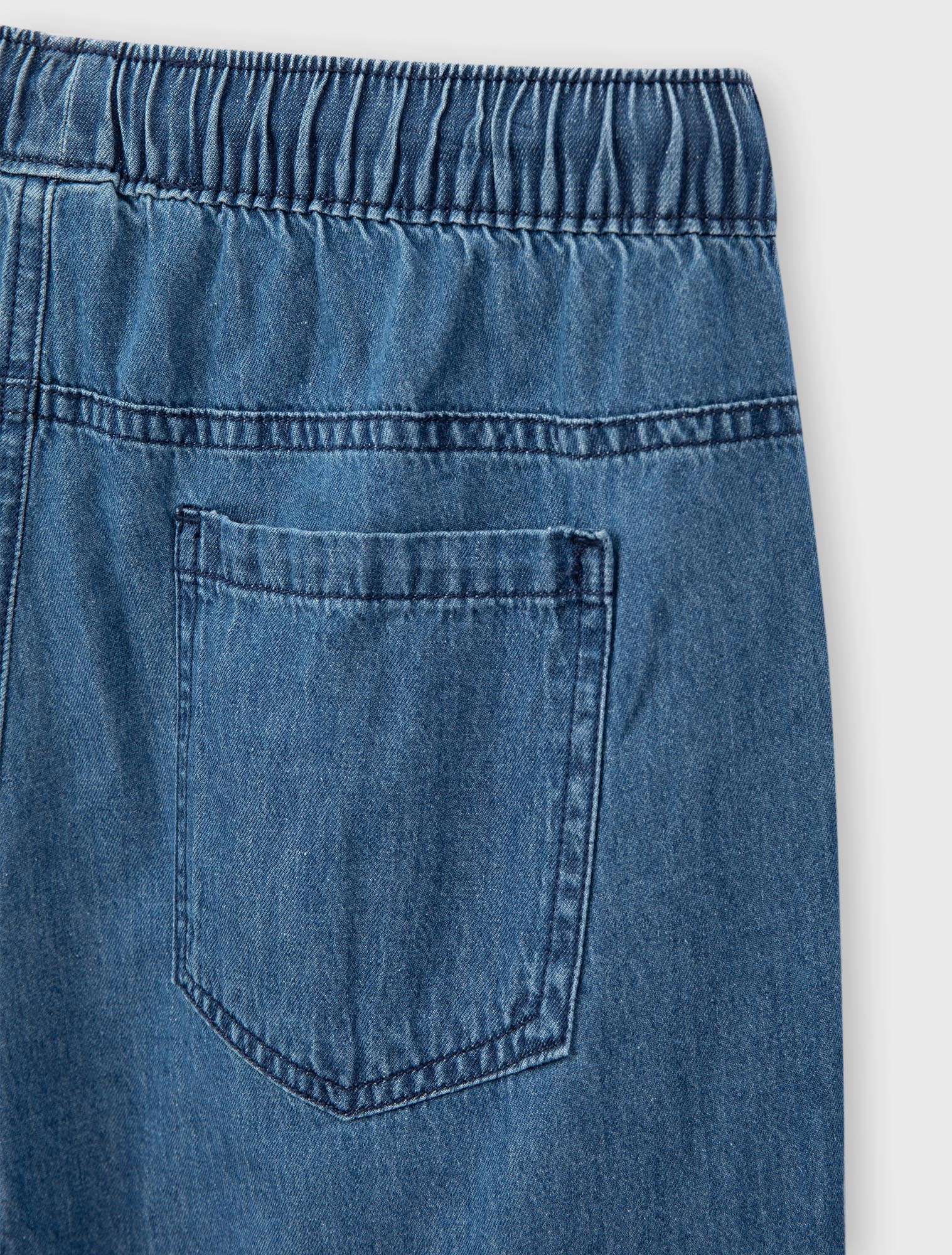 Quần soóc chất liệu denim 100% cotton, nẹp kéo khoá giả, túi hai bên và một túi sau.