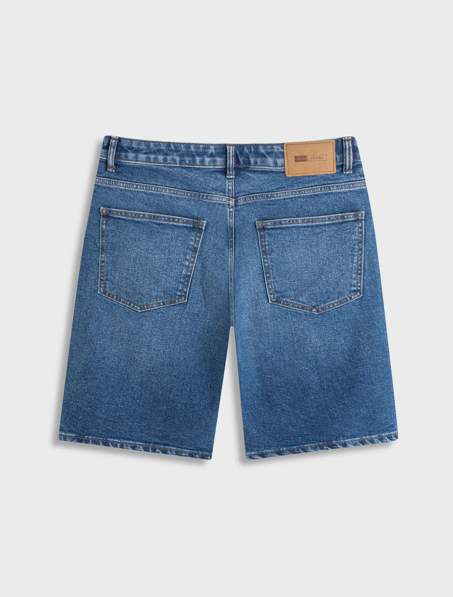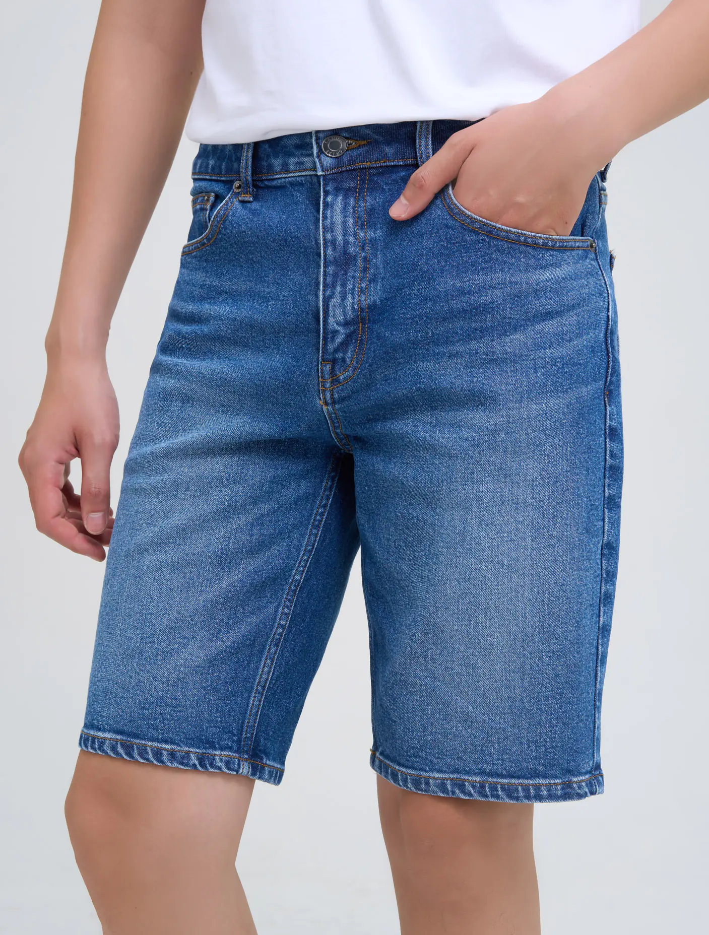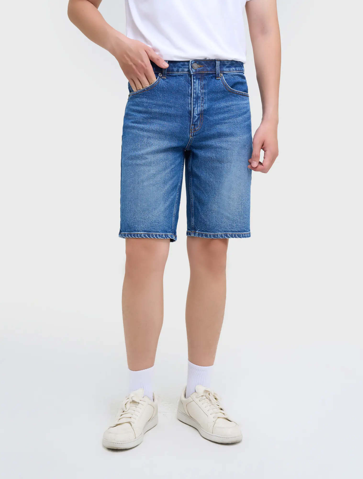 Quần soóc 5 túi chất liệu denim co giãn. Cạp thường, ống suông. Phần đùi và đầu gối đủ rộng để dễ vận động.