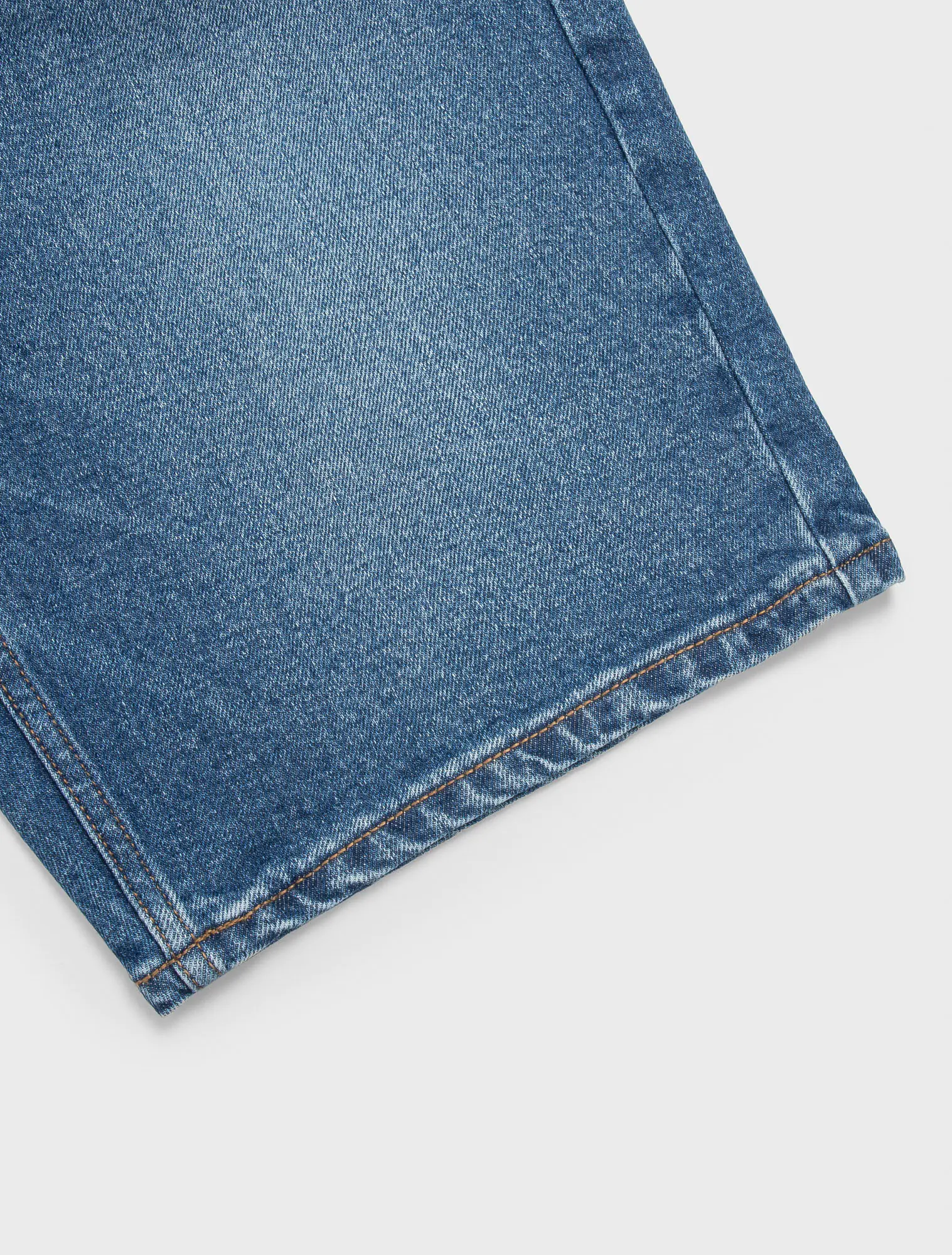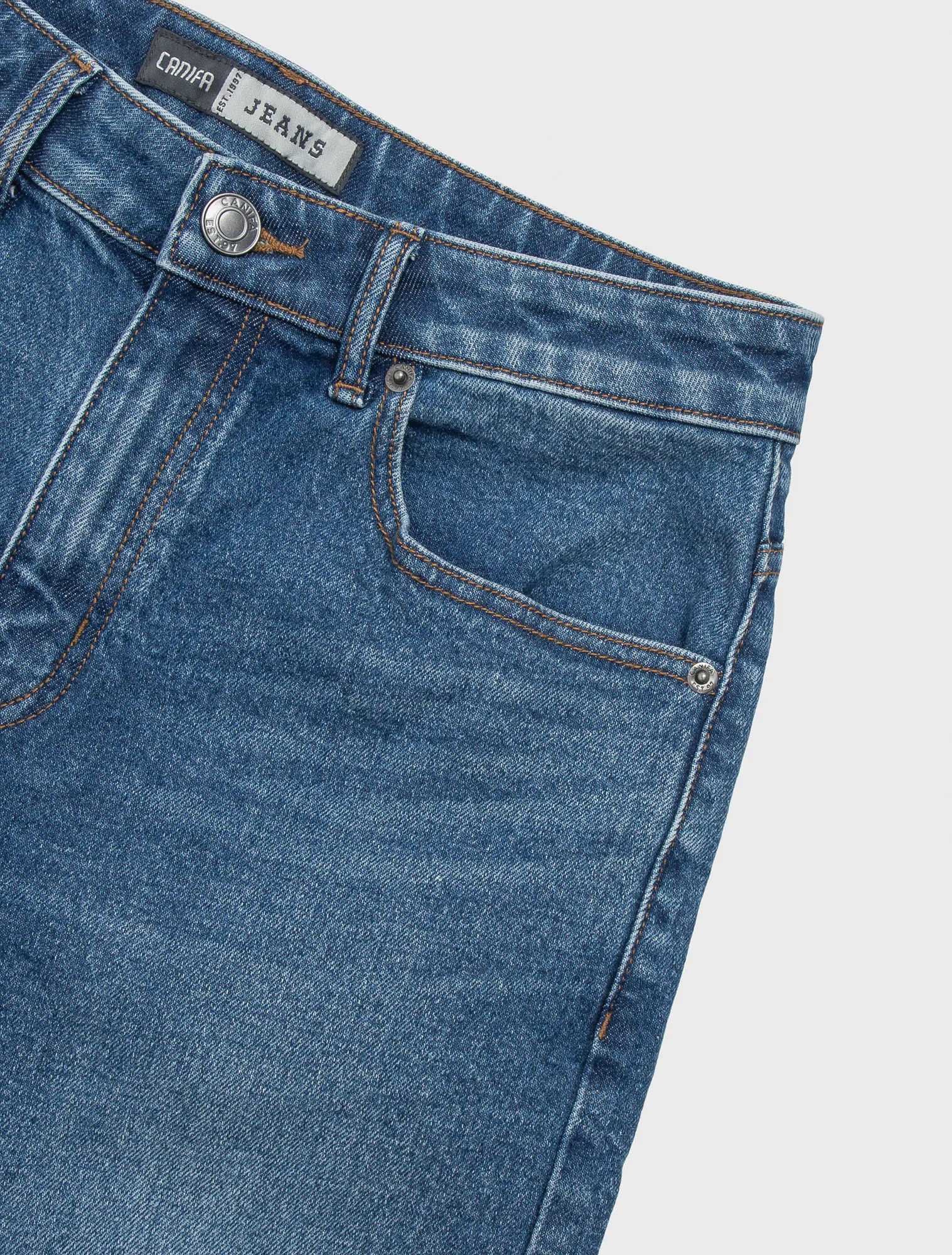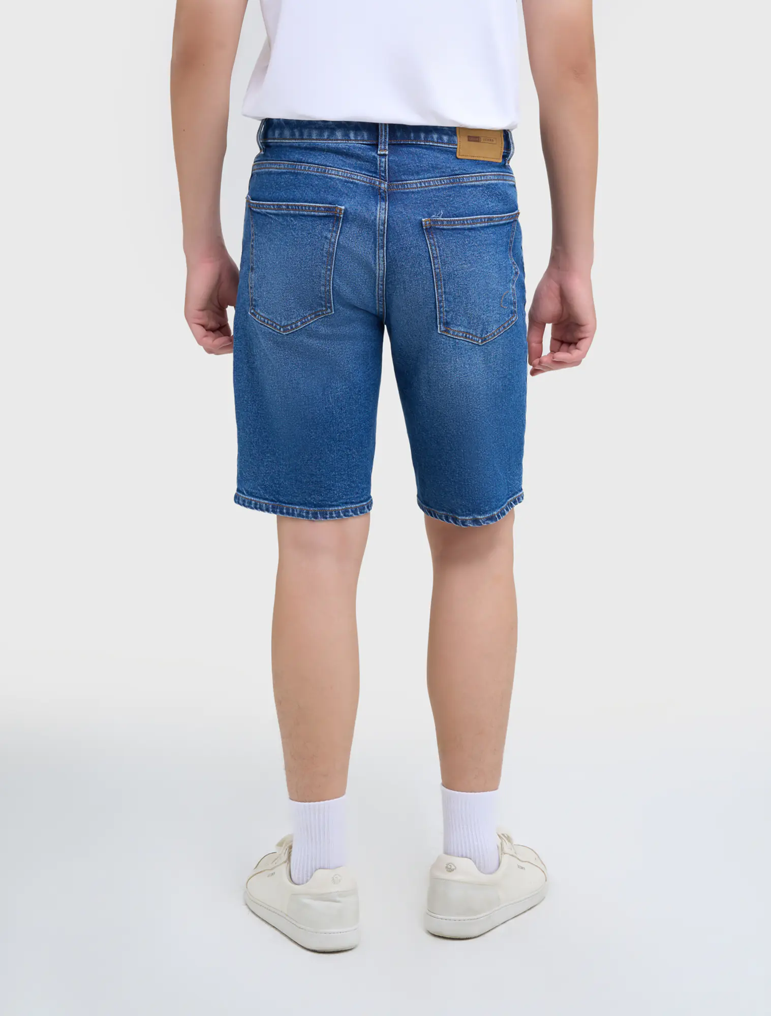 Quần soóc 5 túi chất liệu denim co giãn. Cạp thường, ống suông. Phần đùi và đầu gối đủ rộng để dễ vận động.