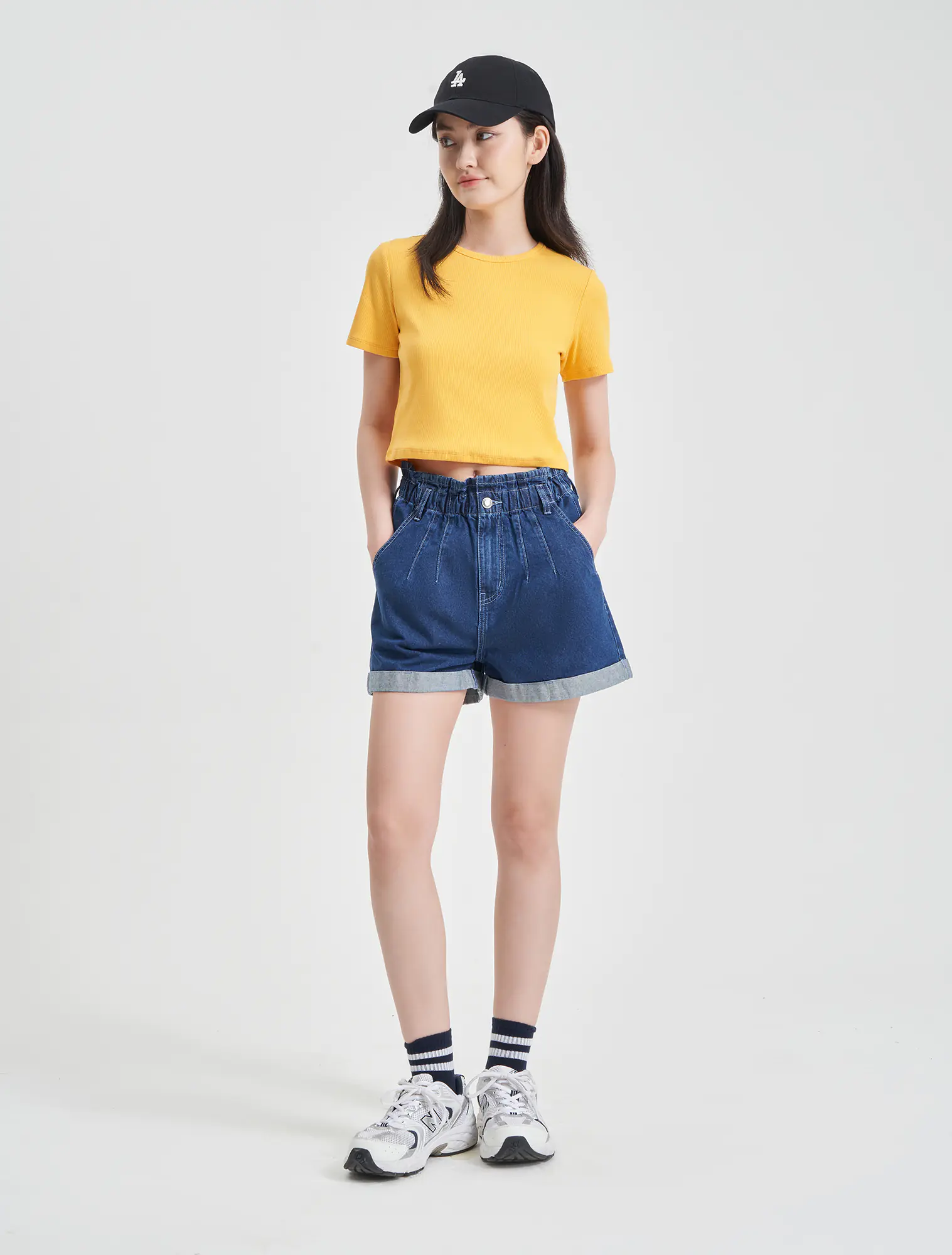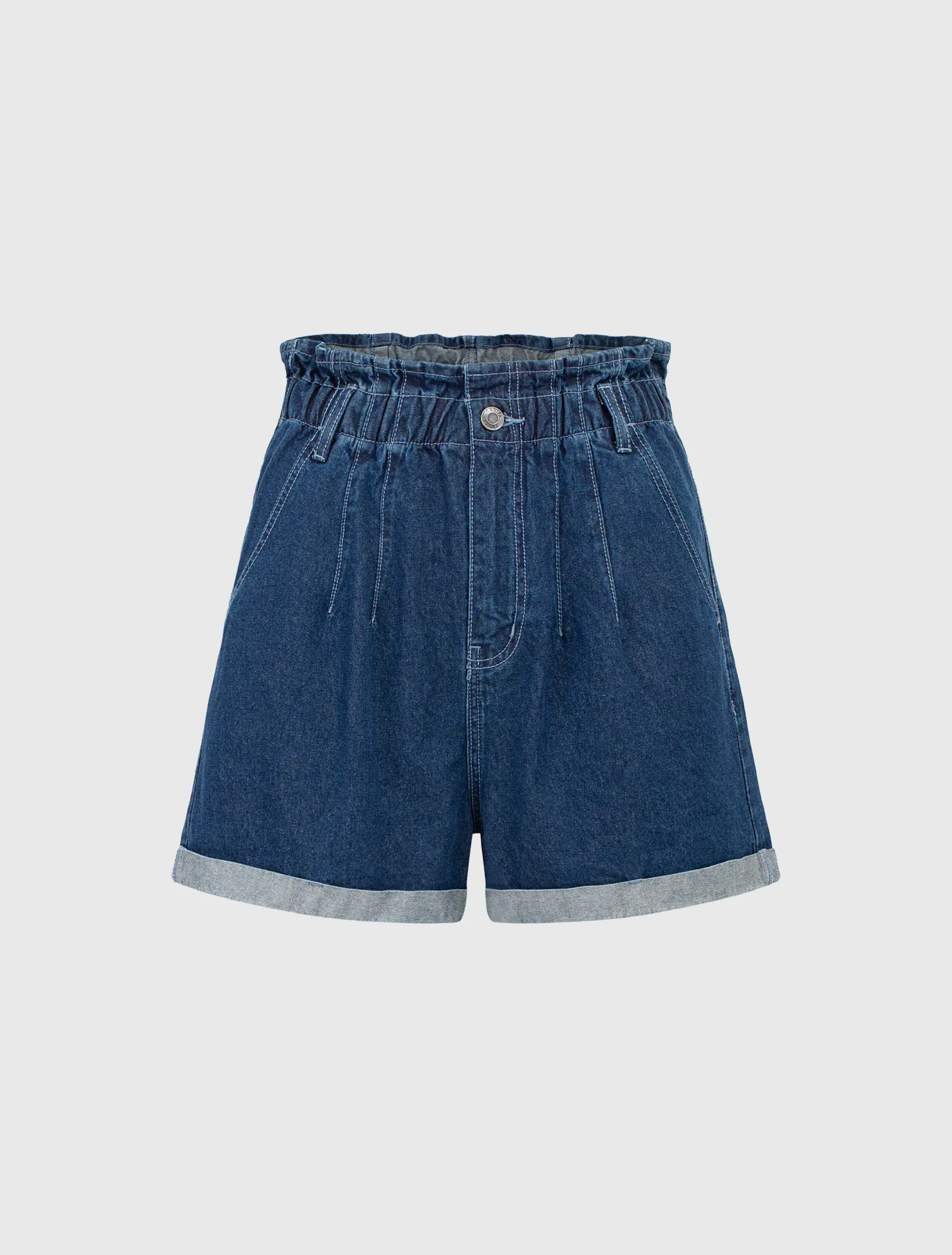 Quần soóc jeans phom vừa, dáng suông basic. Cạp cao có chun tạo sự thoải mái khi mặc.