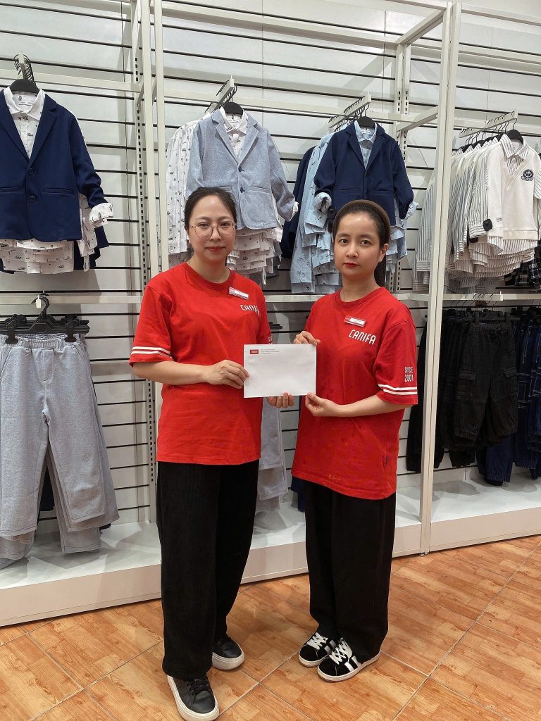 Để kịp thời sẻ chia khó khăn, Quỹ Canifa Vì Cộng đồng đã gửi phần quà nhỏ tới 03 ACE nhân viên cửa hàng Canifa Thái Nguyên – mỗi người 5 triệu đồng, động viên các bạn sớm ổn định lại cuộc sống.