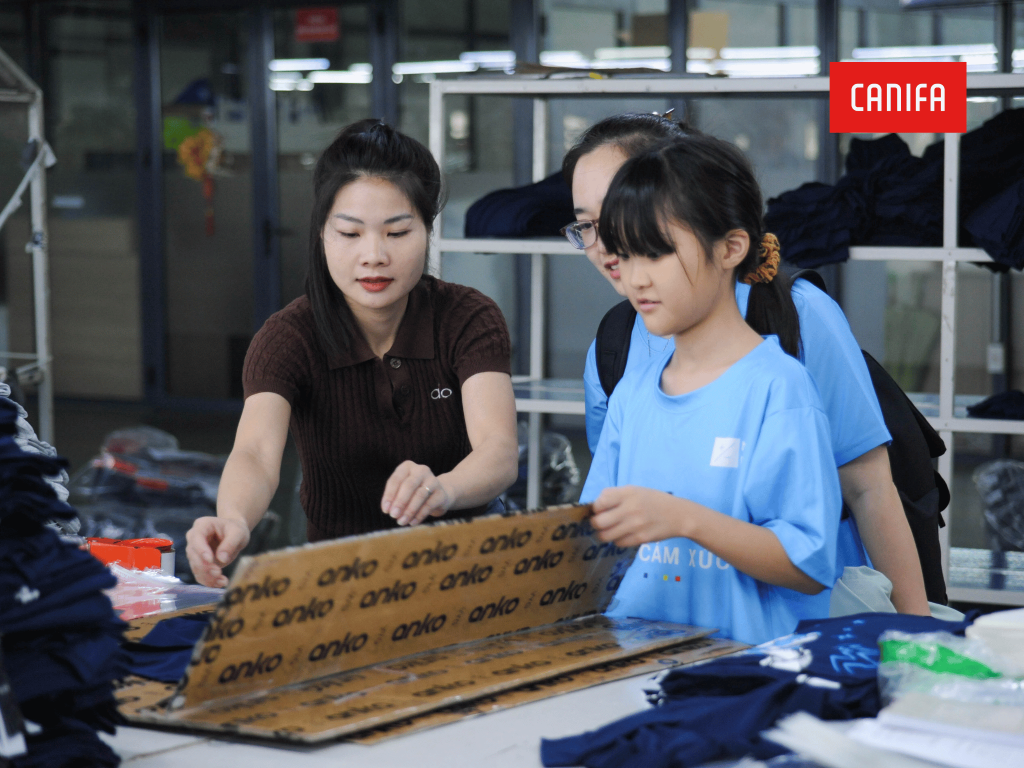 Một điểm nhấn đặc biệt trong hành trình là hoạt động tham quan trực tiếp dây chuyền sản xuất khép kín của Canifa. Qua đó, các bạn học sinh được tận mắt quan sát quy trình sản xuất hiện đại, tìm hiểu cách thức Canifa ứng dụng công nghệ và tiêu chuẩn bền vững vào từng khâu sản xuất – từ nguyên liệu đầu vào cho đến thành phẩm cuối cùng.