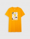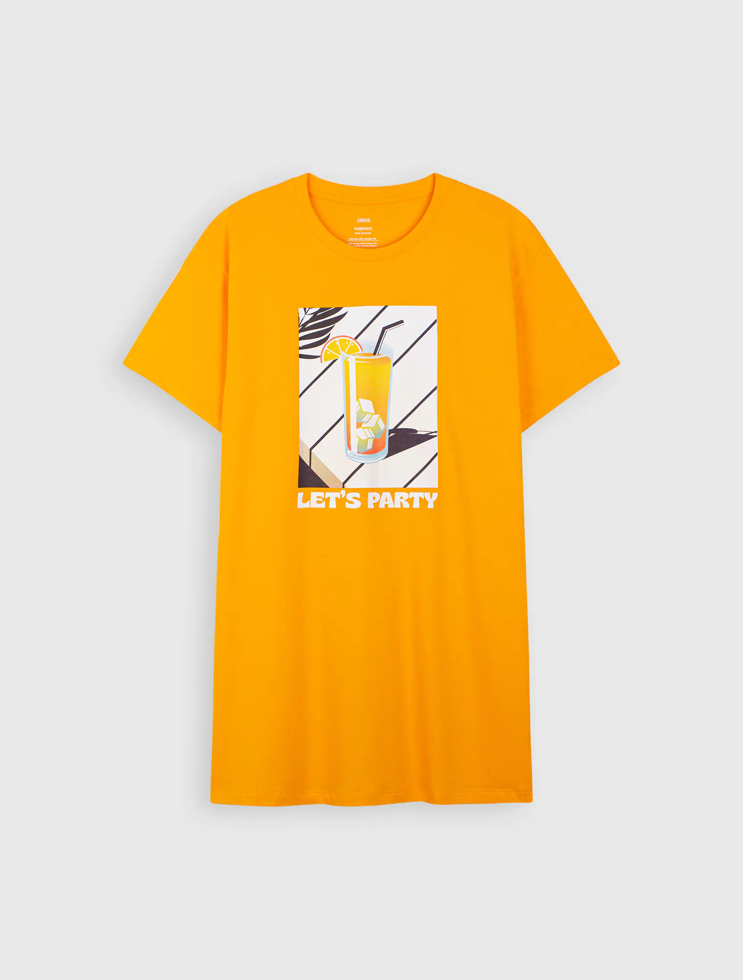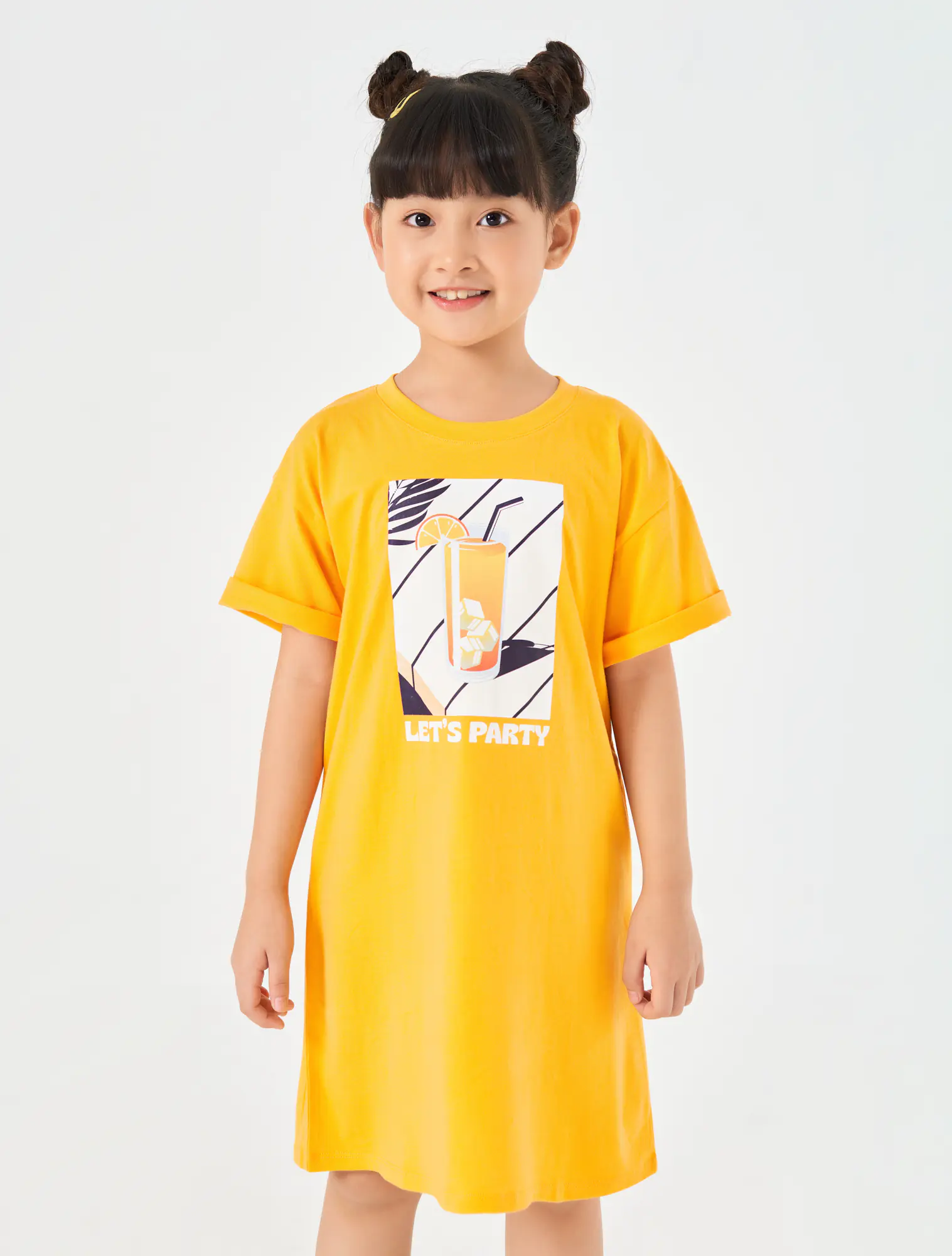 Váy liền 100% cotton, cổ tròn, tay ngắn. In hình trước ngực