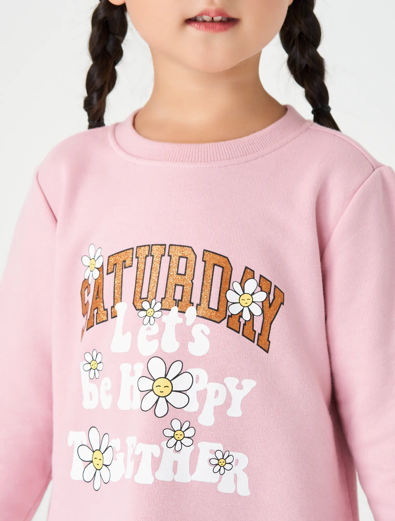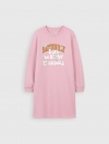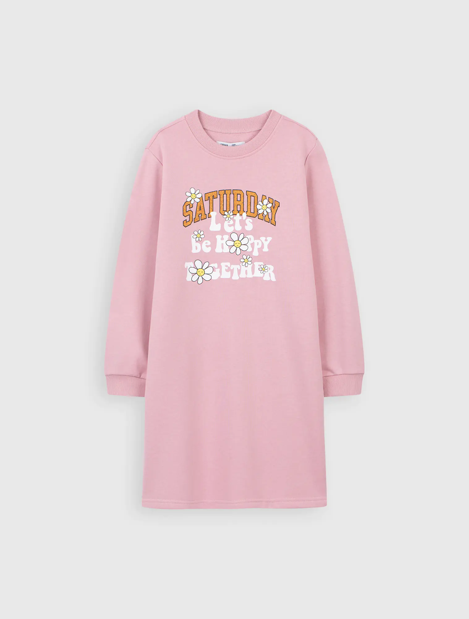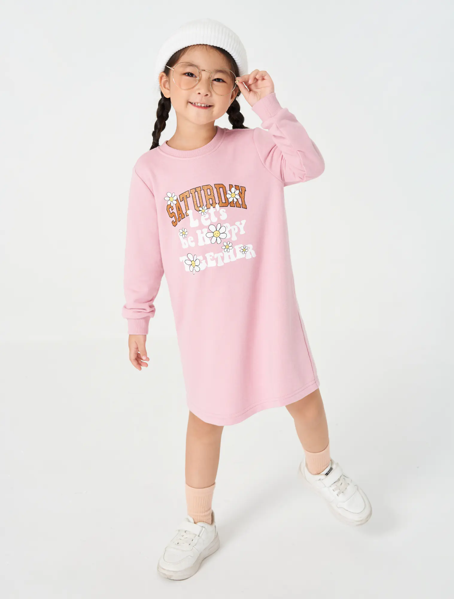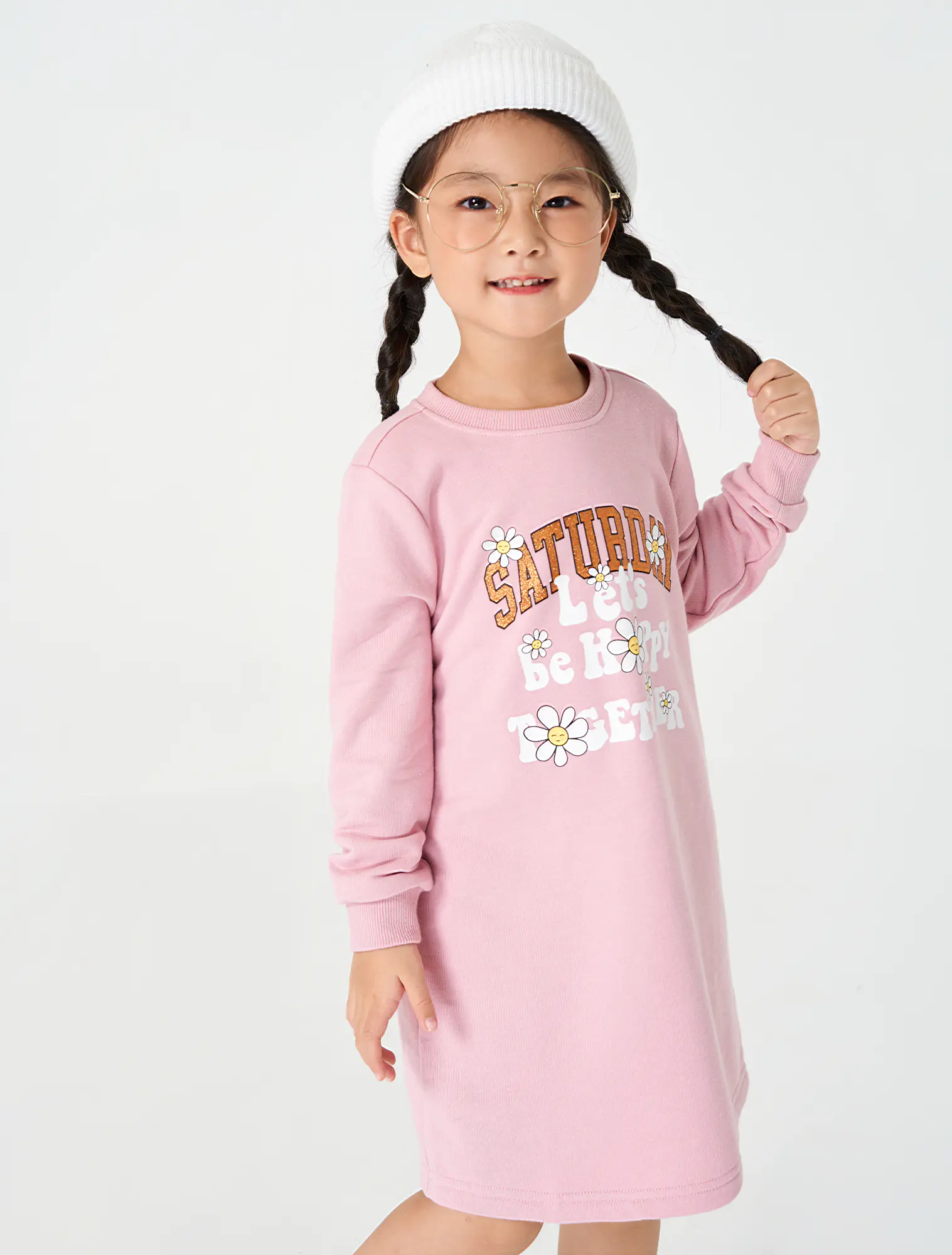 Váy liền chất liệu cotton pha, cổ tròn, tay dài phồng nhẹ, dáng suông.