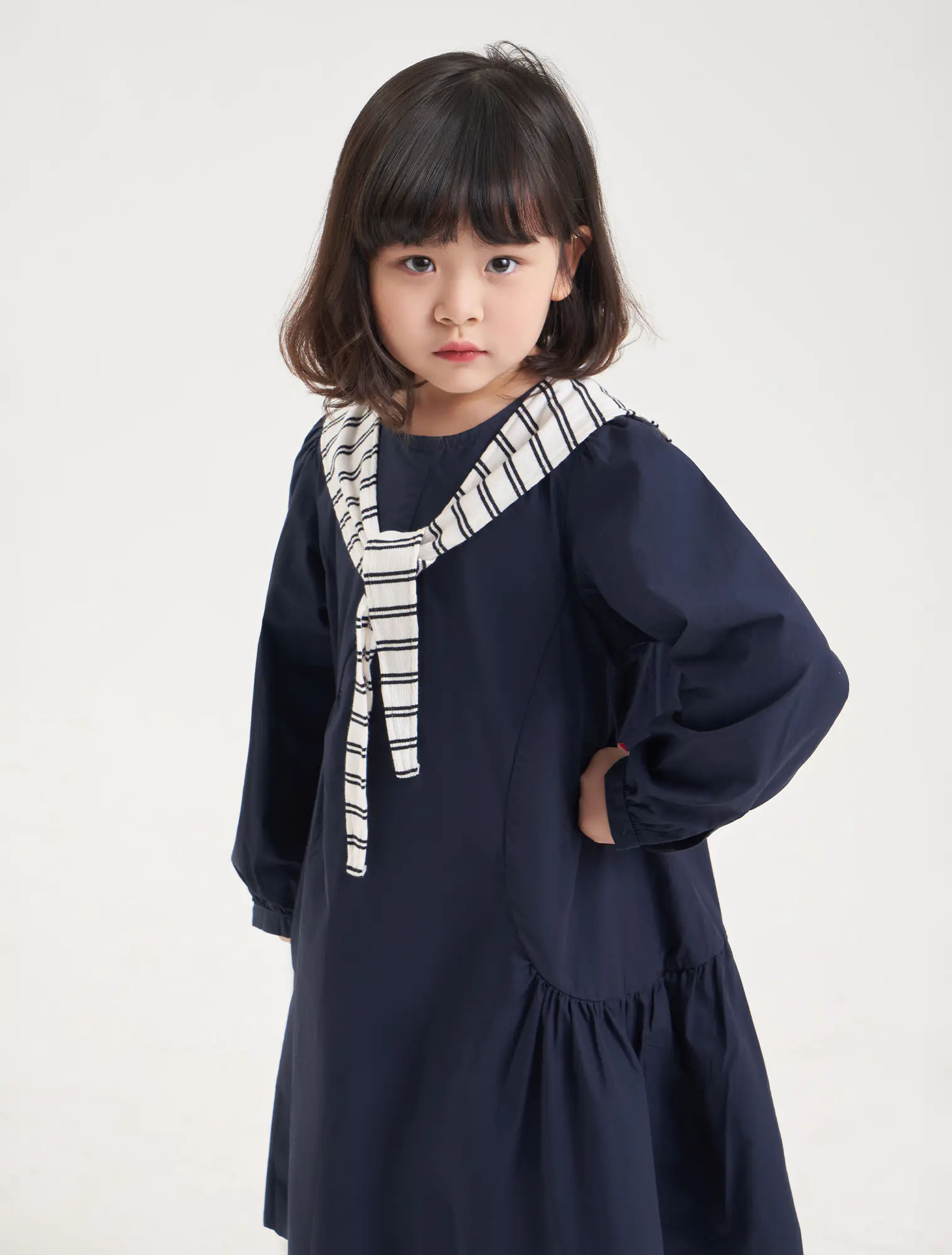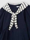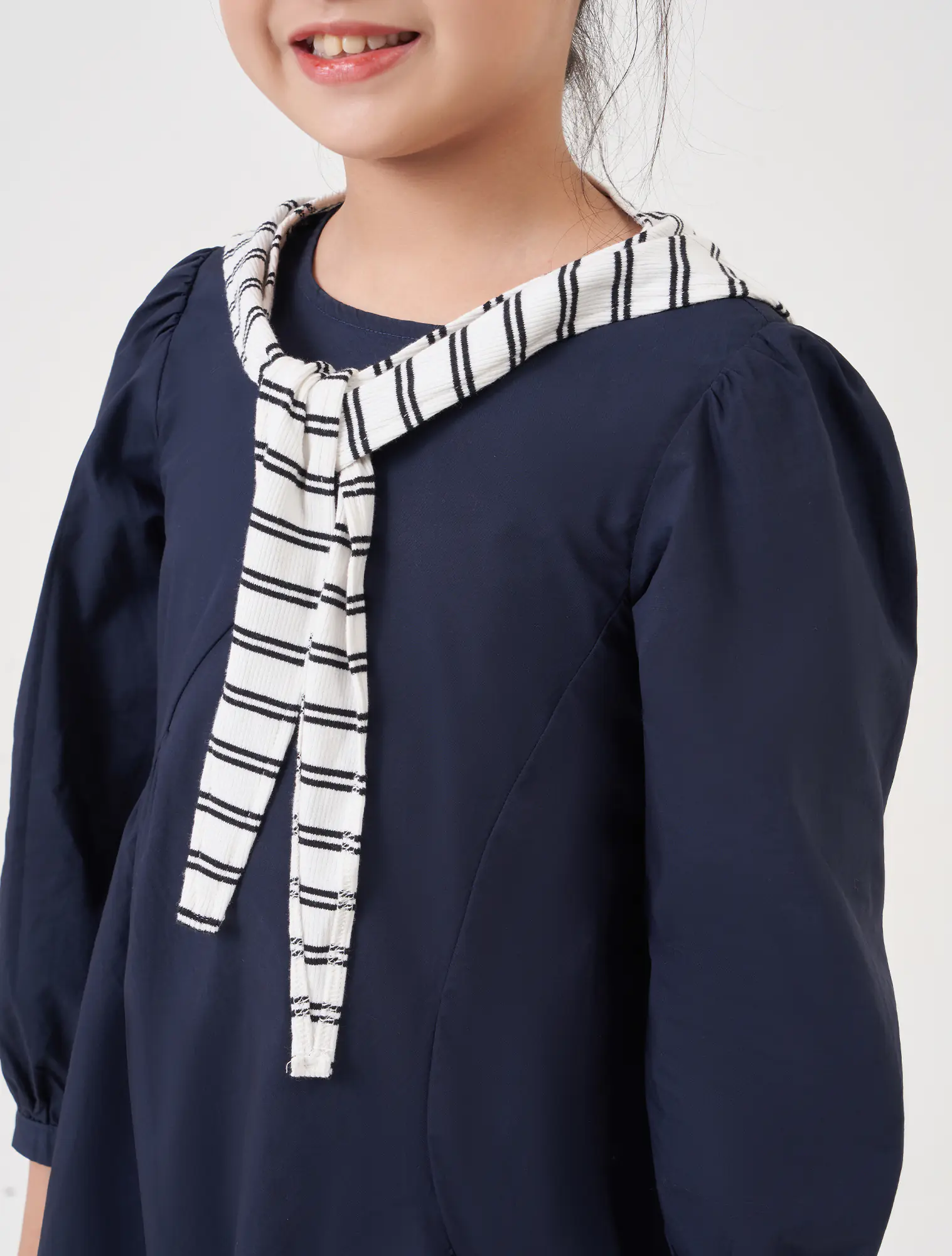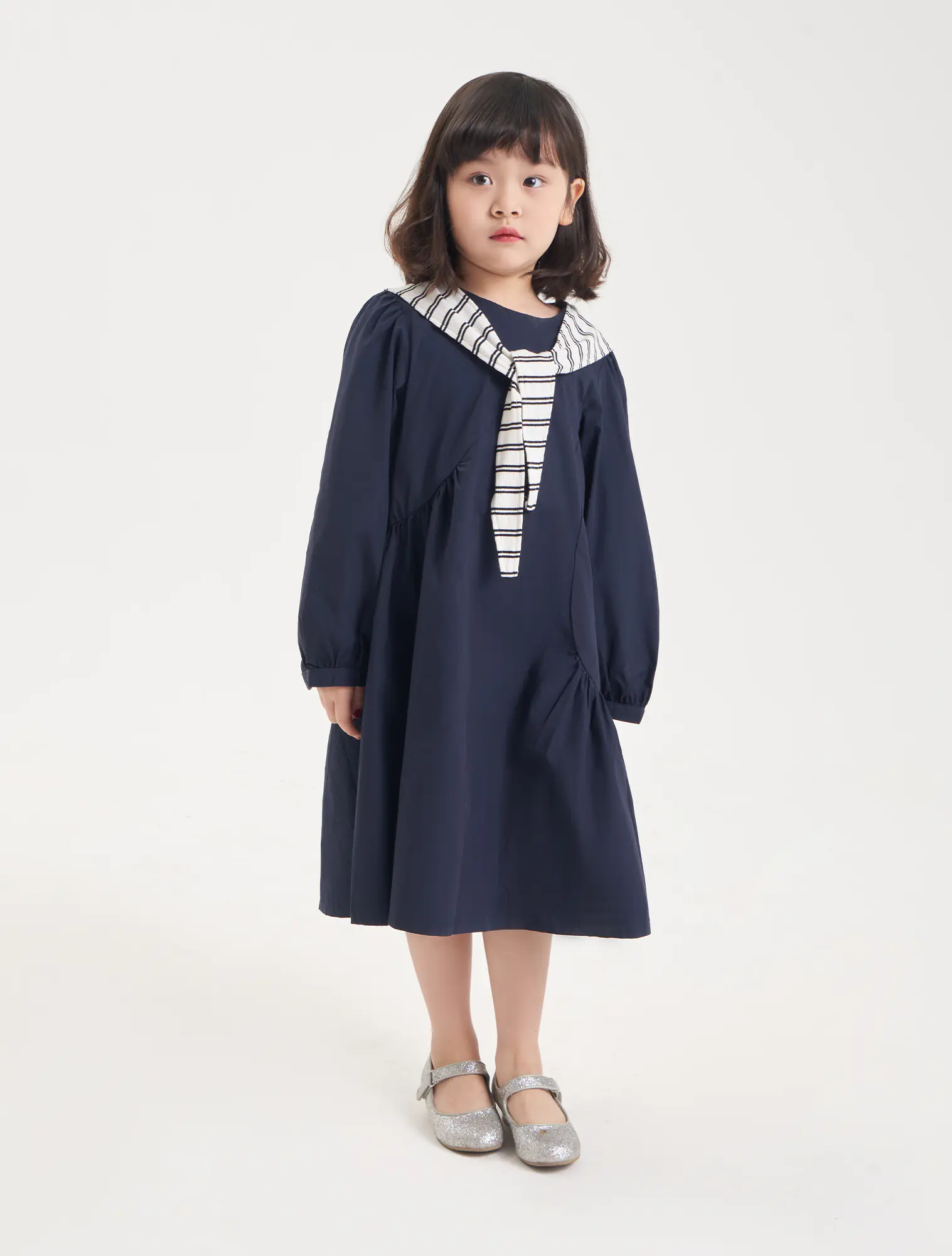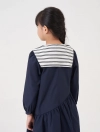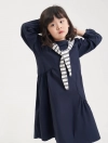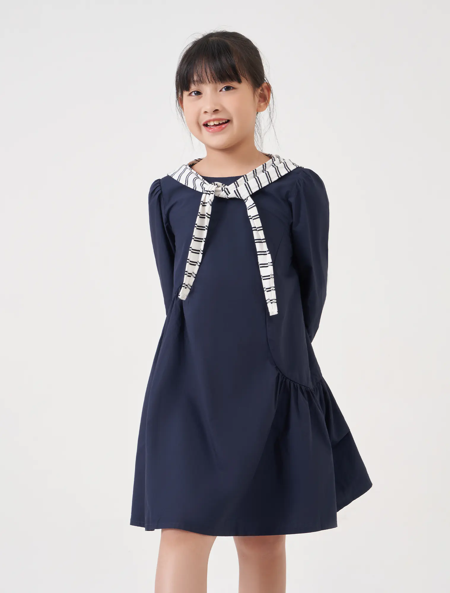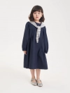 Váy liền dài tay bé gái. Chi tiết khăn choàng vai nữ tính, phù hợp với nhiều hoàn cảnh sử dụng.