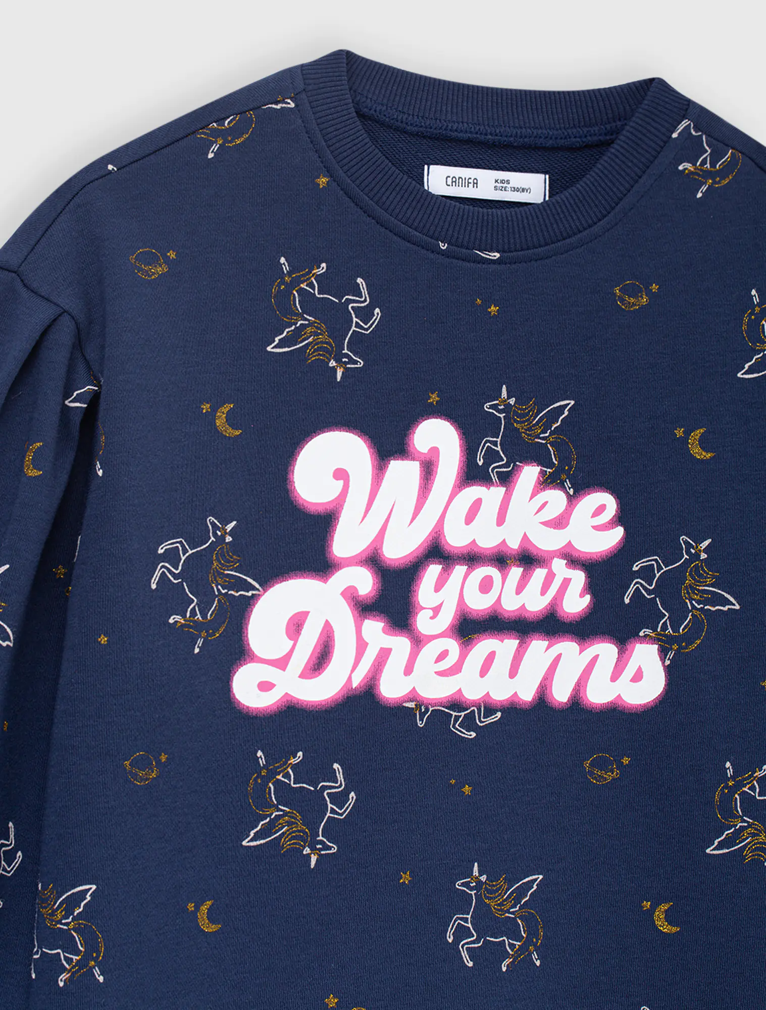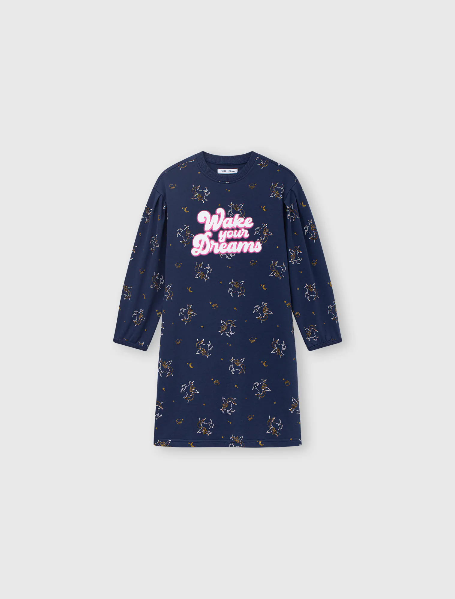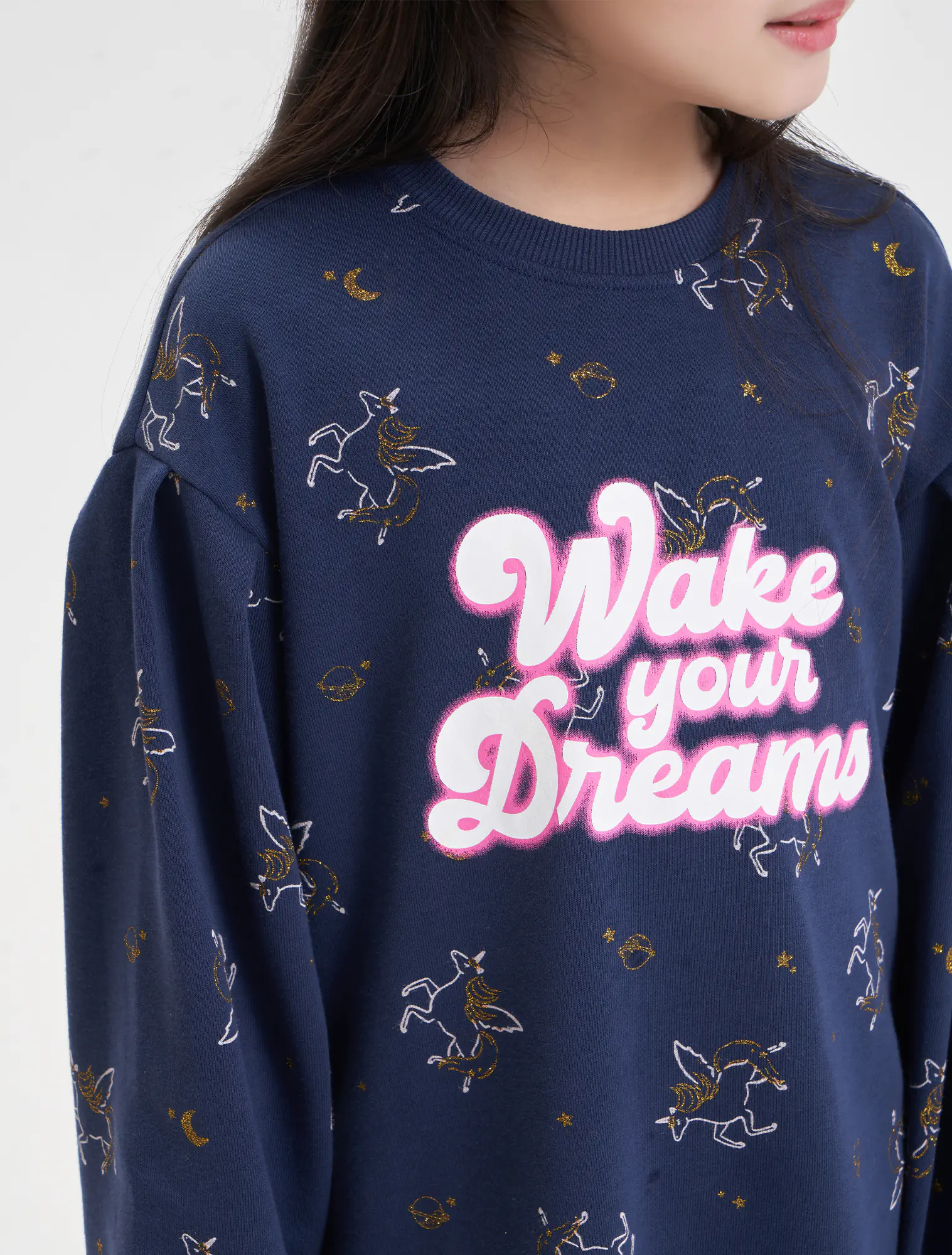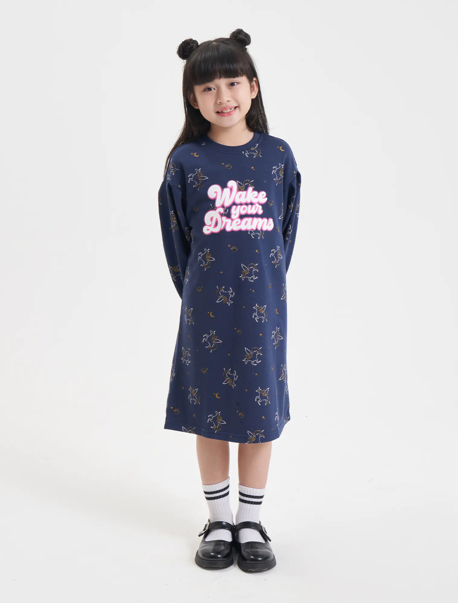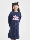Váy nỉ bé gái có hình in ngộ nghĩnh, chi tiết tay bồng nhẹ nữ tính.
