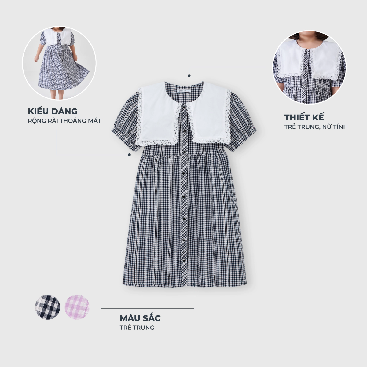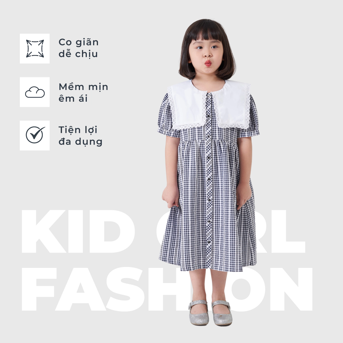 Váy liền bé gái có chi tiết lá cổ to và phối ren mang đến sự nữ tính. Chất liệu có độ dày vừa phải rất phù hợp với thời tiết giao mùa.