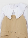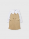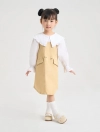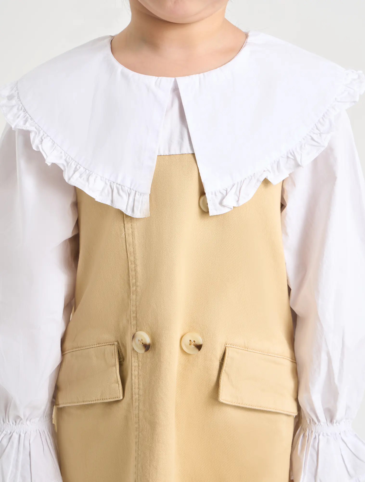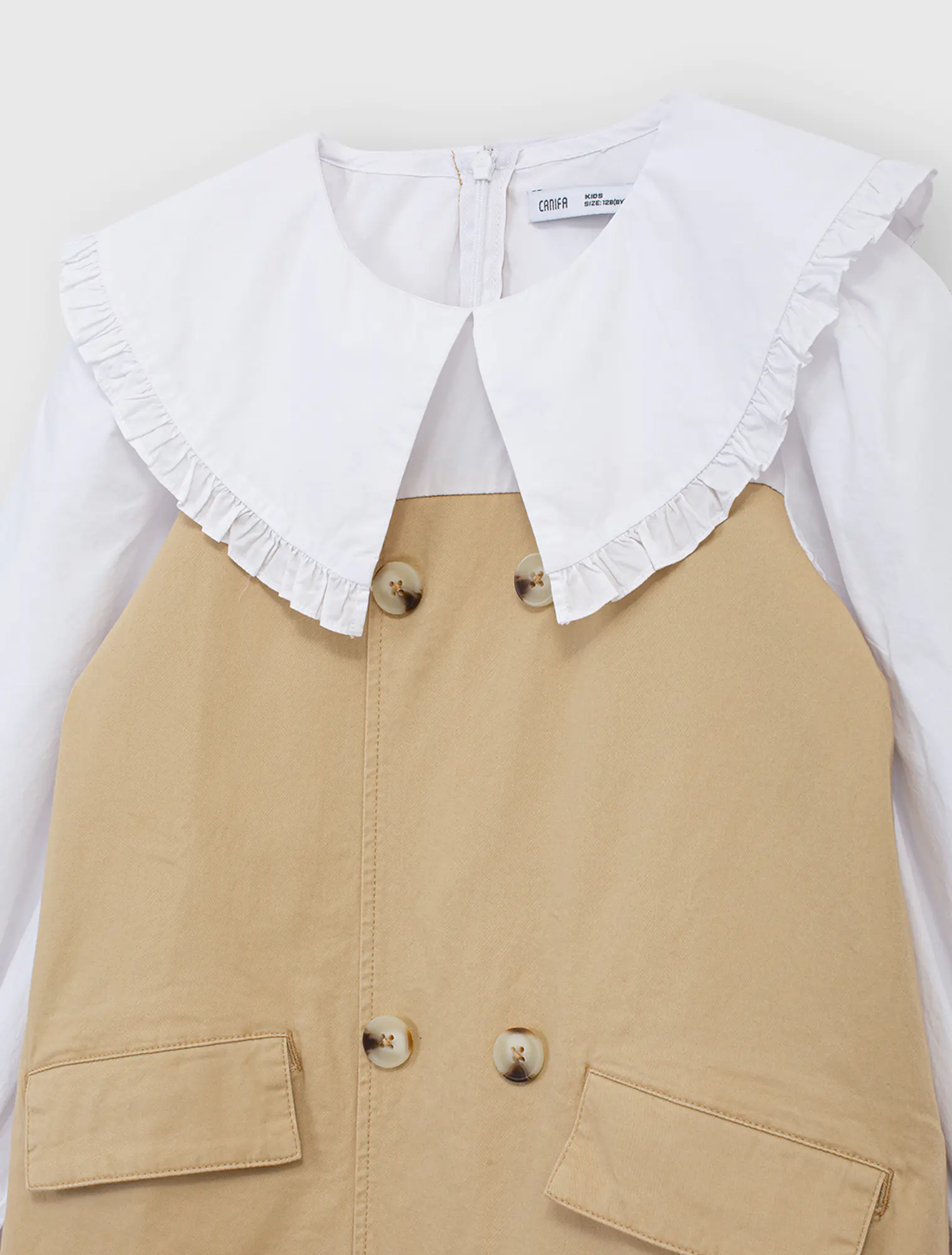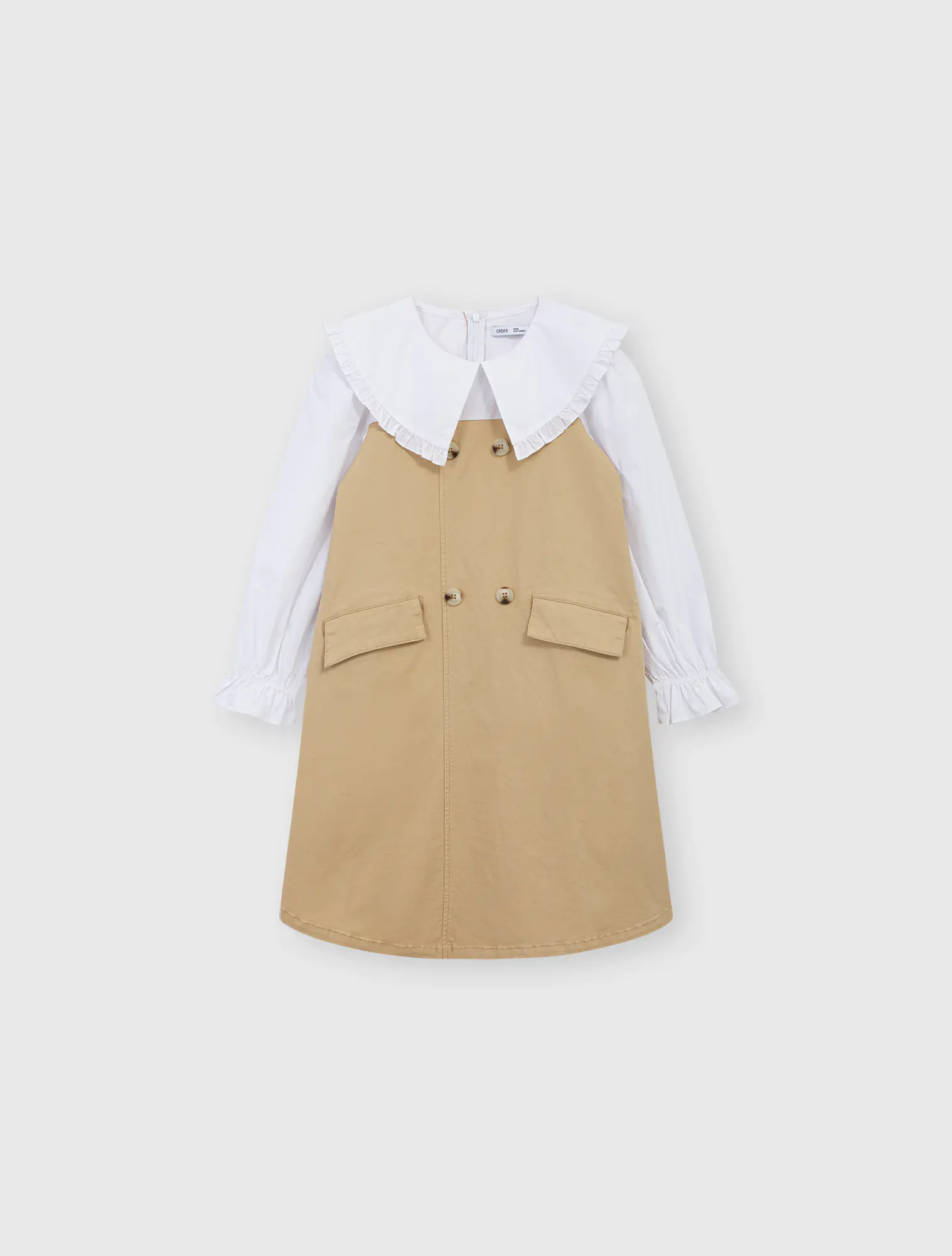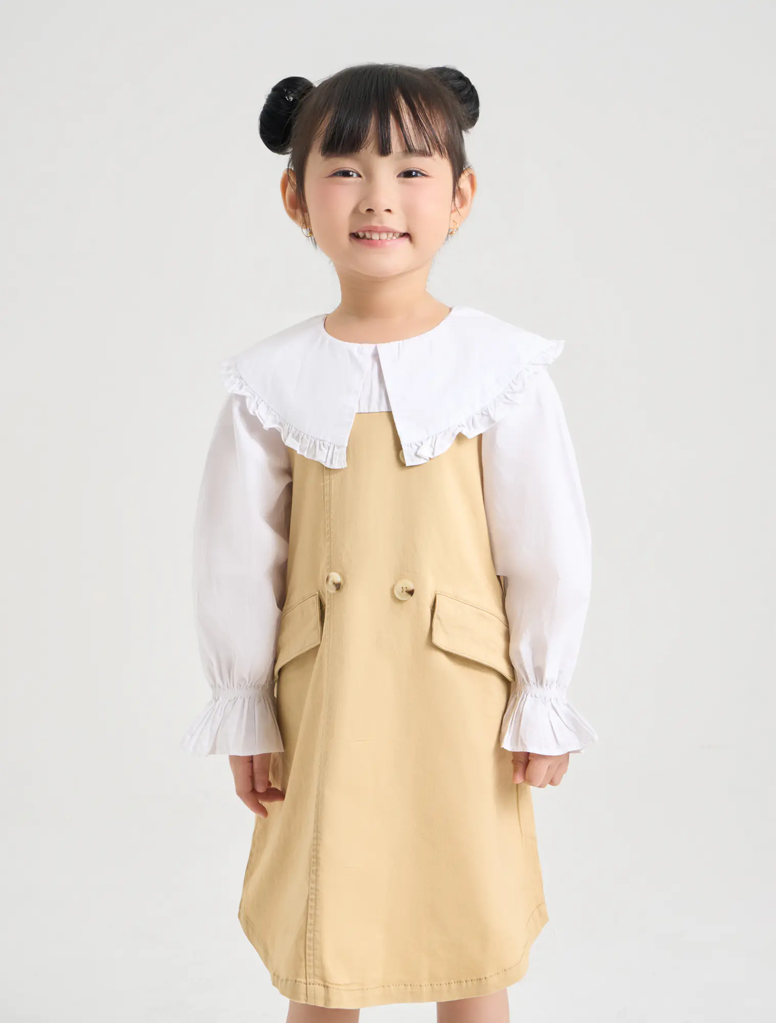 Váy dài tay bé gái, khaki phối vải poplin tạo sự năng động nhưng vẫn có sự nữ tính với tầng váy xếp nếp. Sản phẩm phù hợp với những hoạt động vào thời tiết giao mùa.