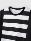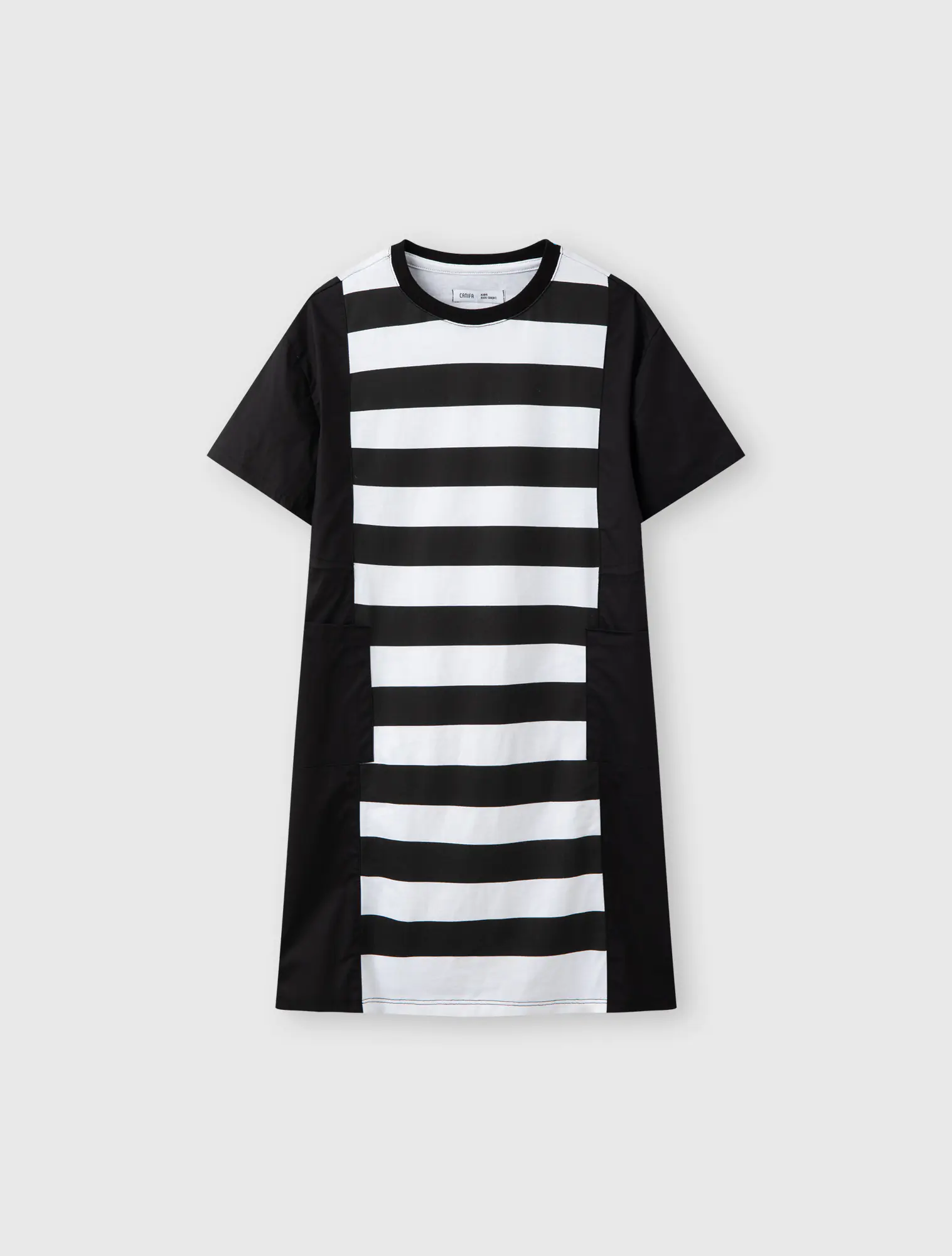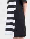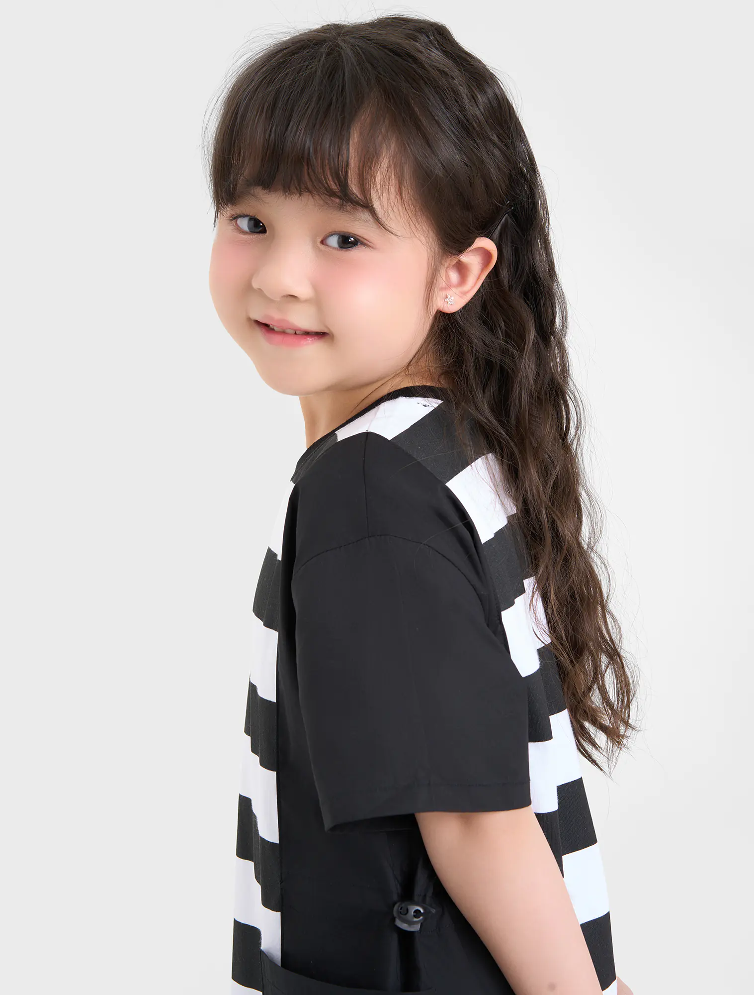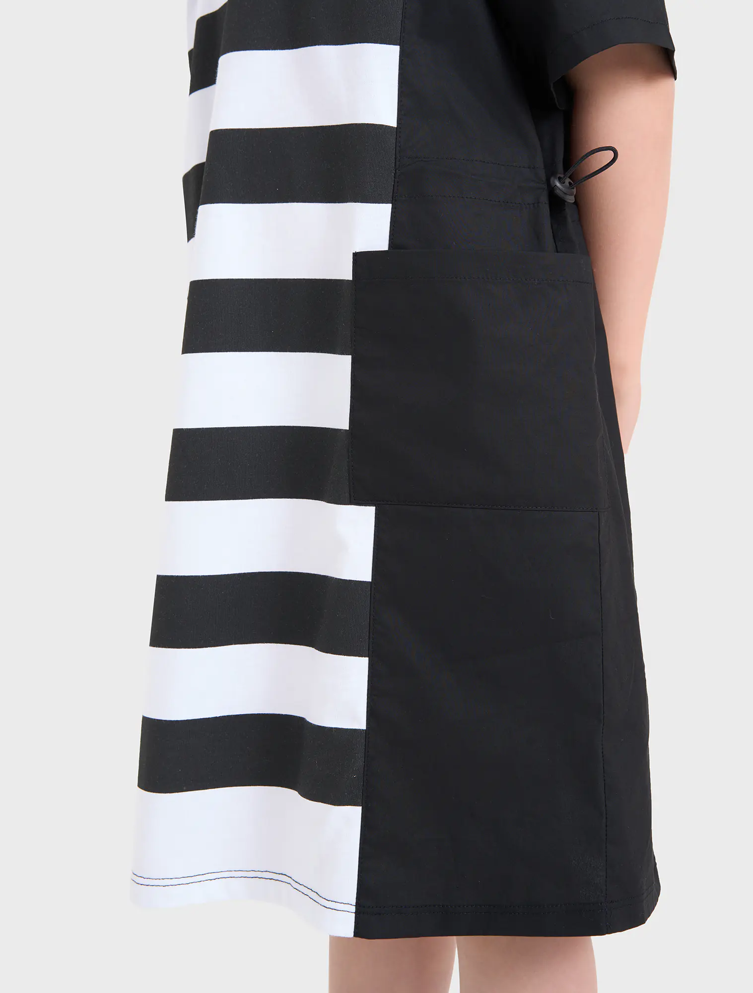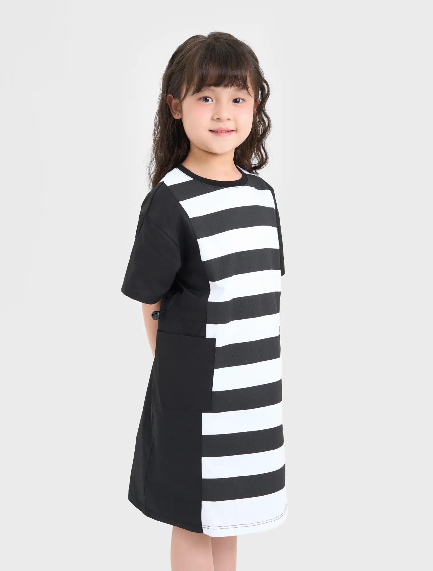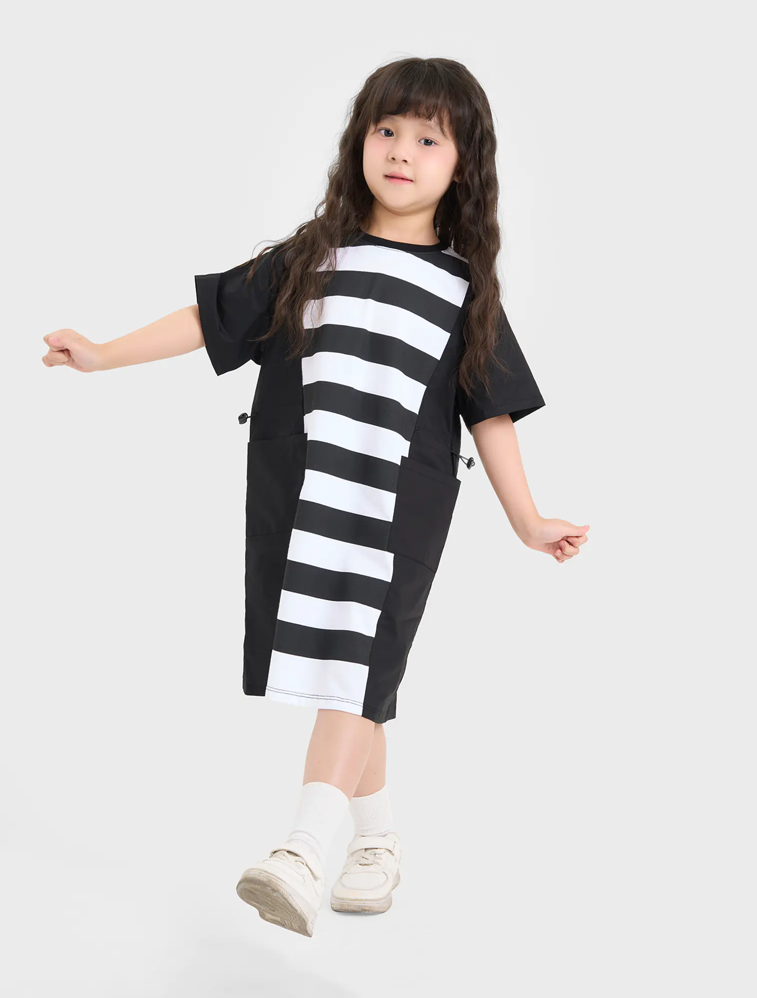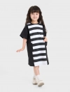 Váy liền bé gái, phối kẻ thân giữa áo, dáng oversize thoải mái, rút eo năng động. Thích hợp với thời tiết giao mùa.
