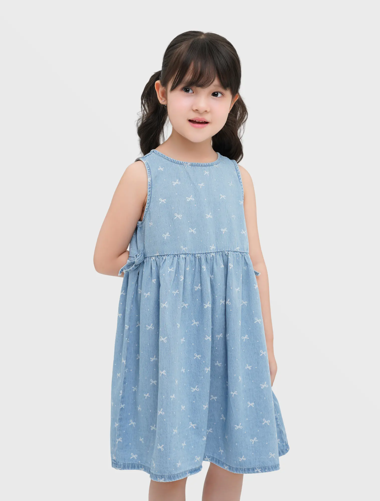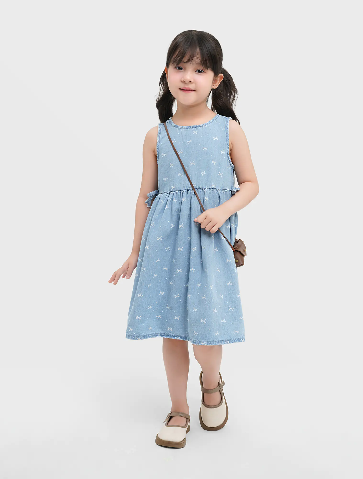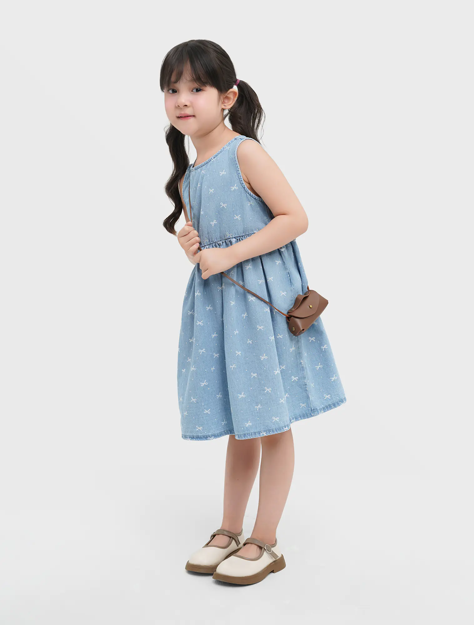 Váy liền bé gái, vải denim cotton đứng phom, màu sắc phù hợp cho các bé.Dáng regular.