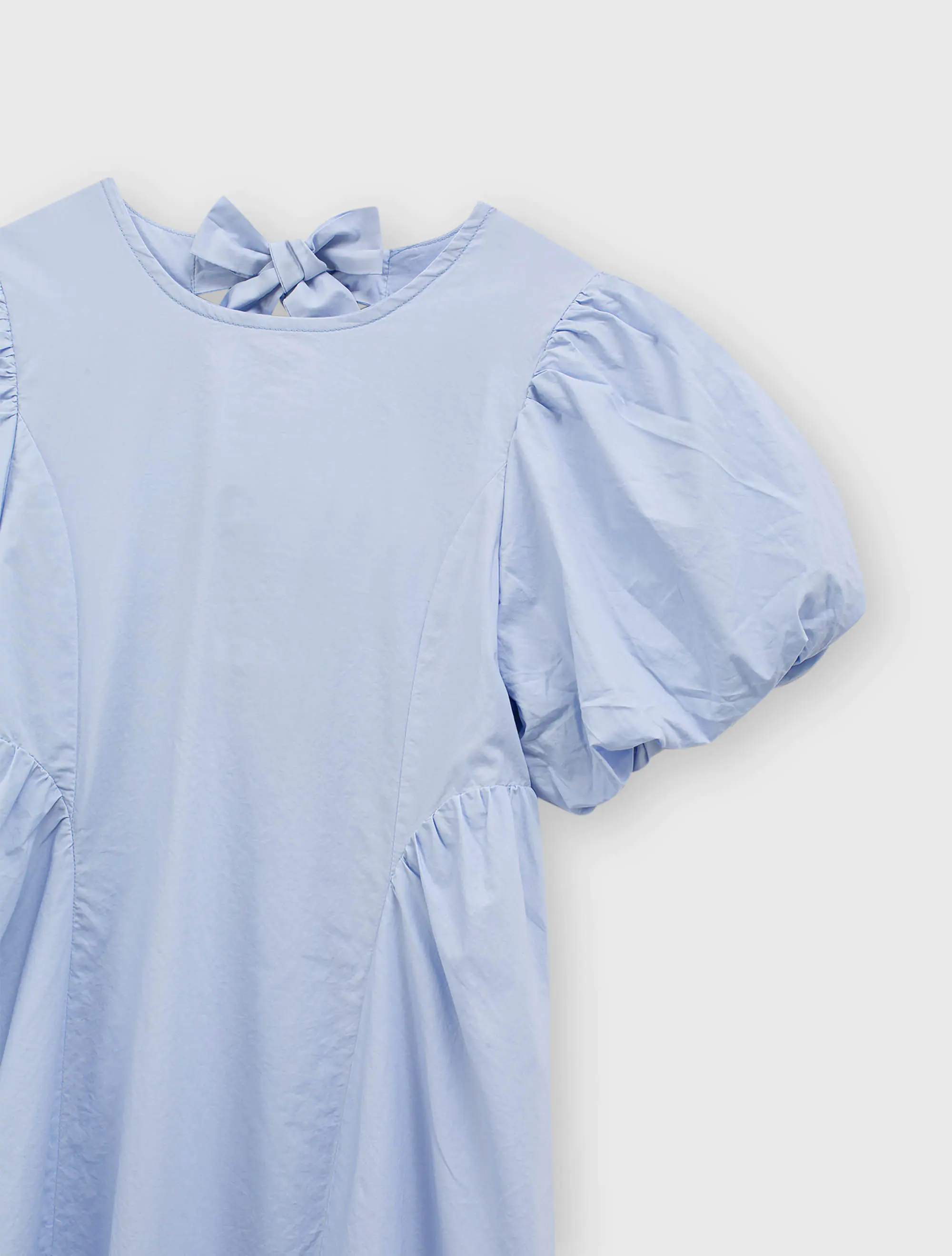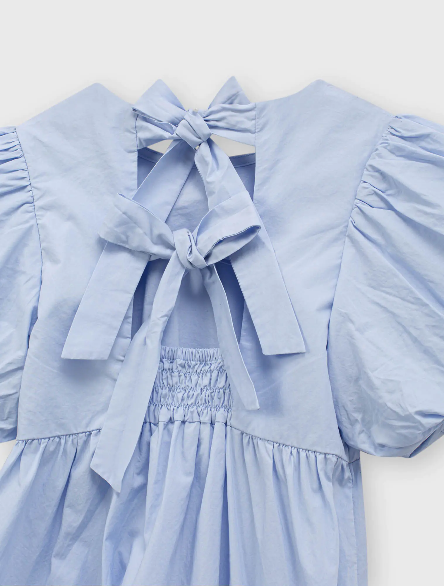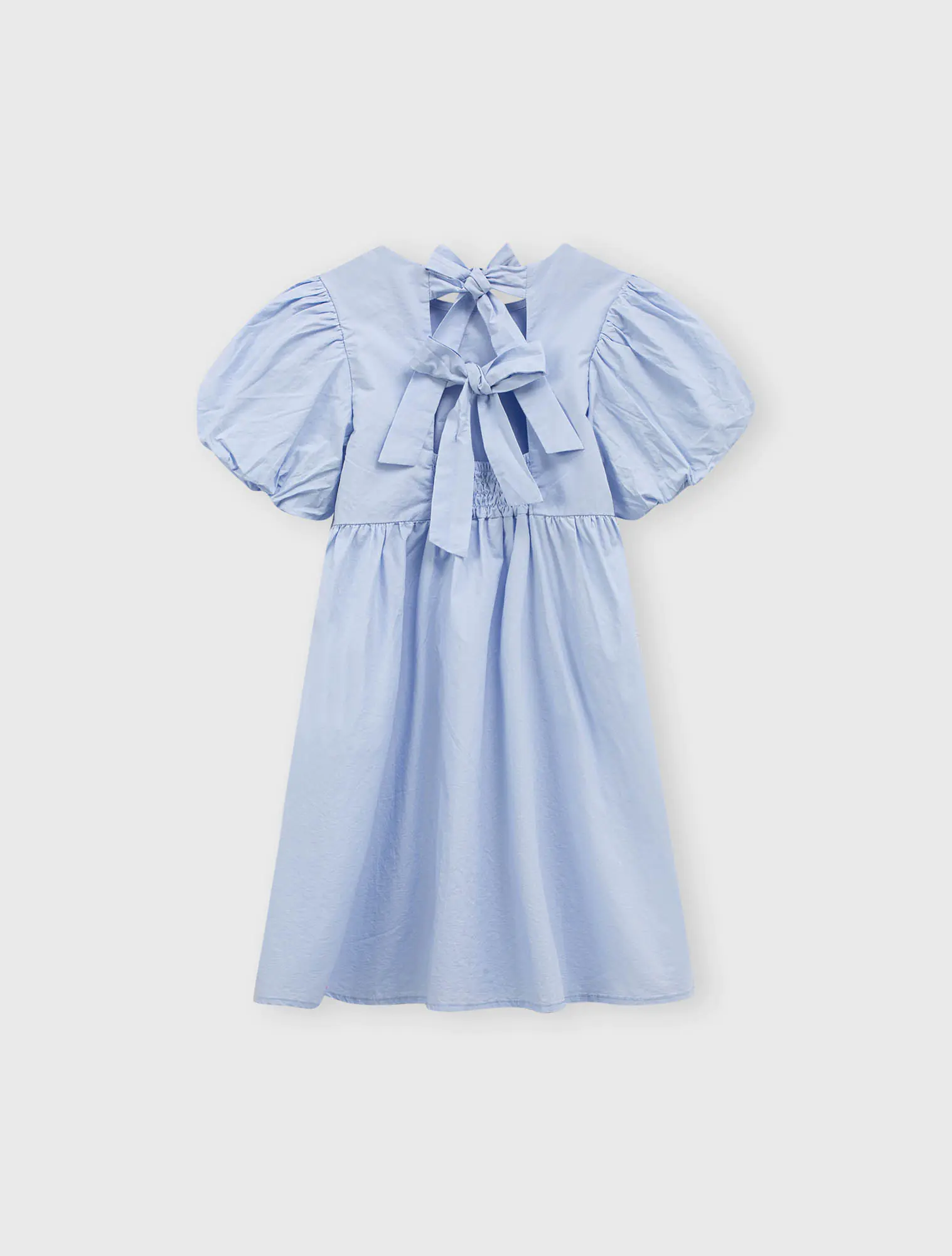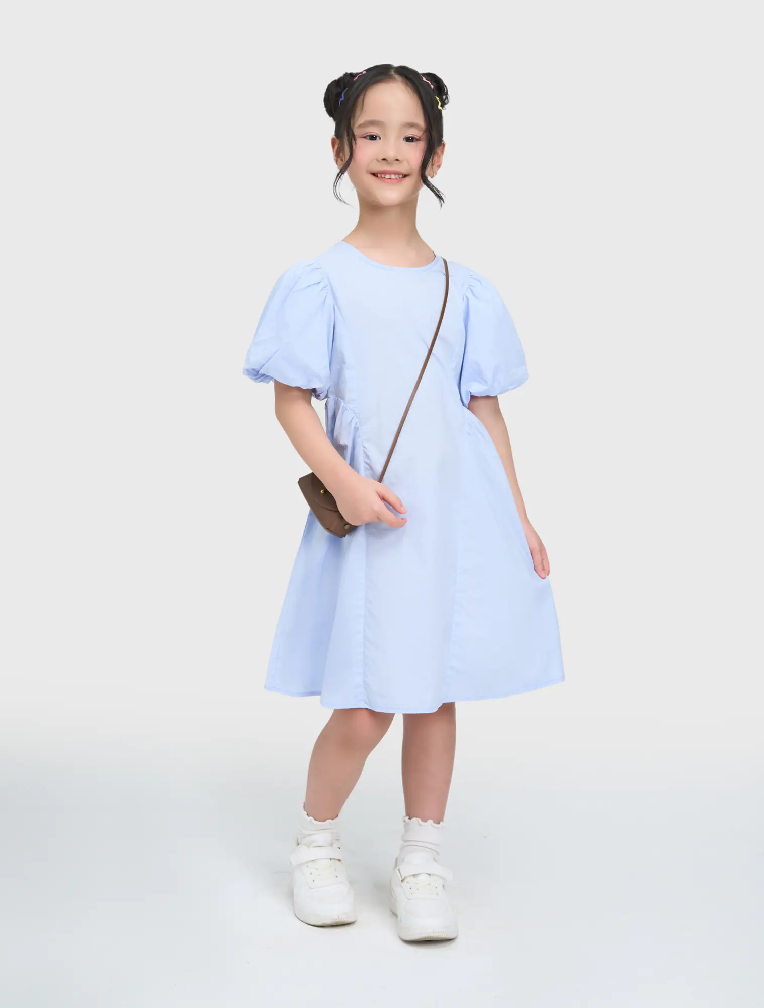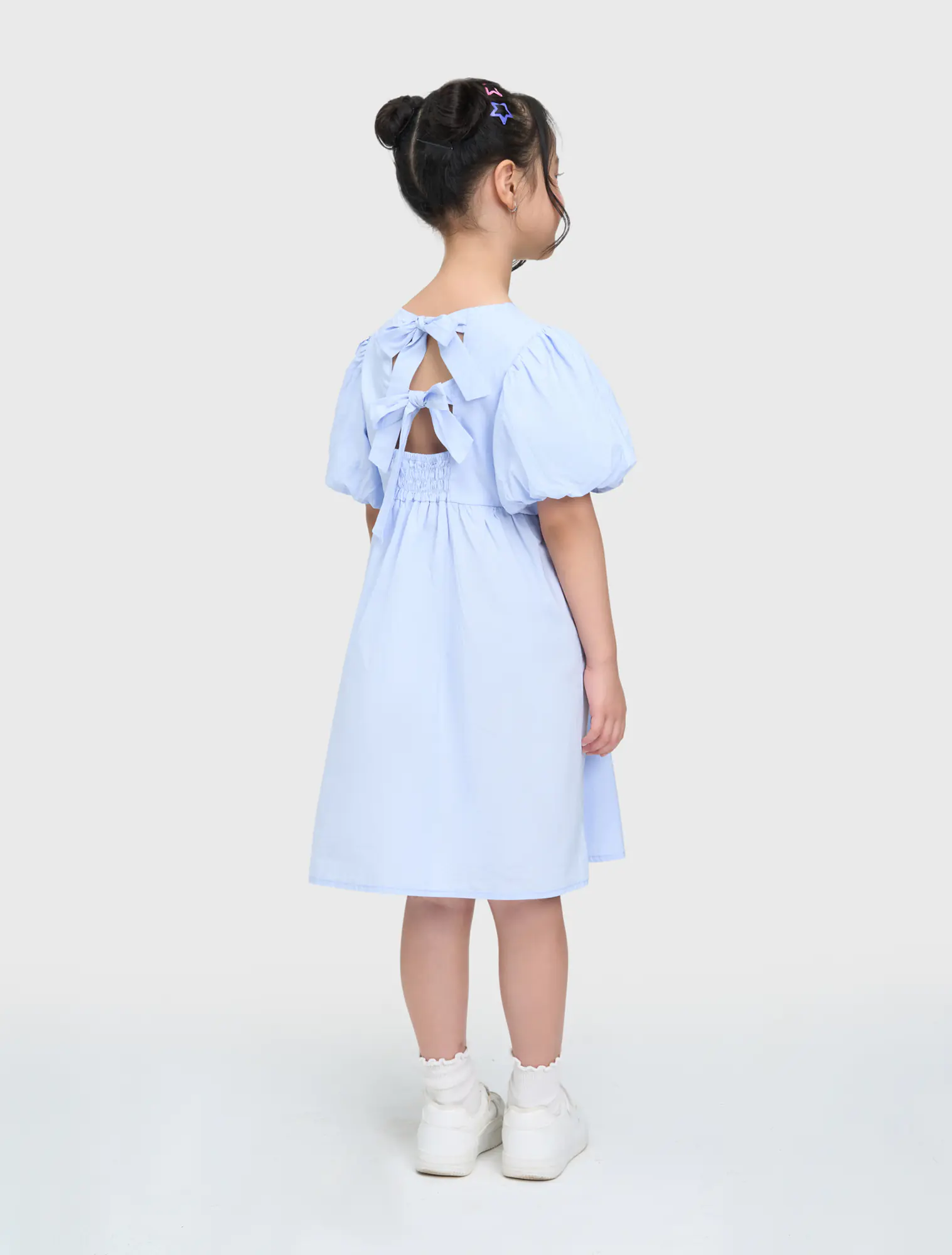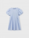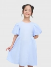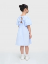 Váy liền bé gái dáng xòe, có nơ buộc phía sau, phong cách tiểu thư đáng yêu. Tay có nhún chun tạo hiểu ứng bồng xinh xắn. Phù hợp với các bé gái thích sự nữ tính.