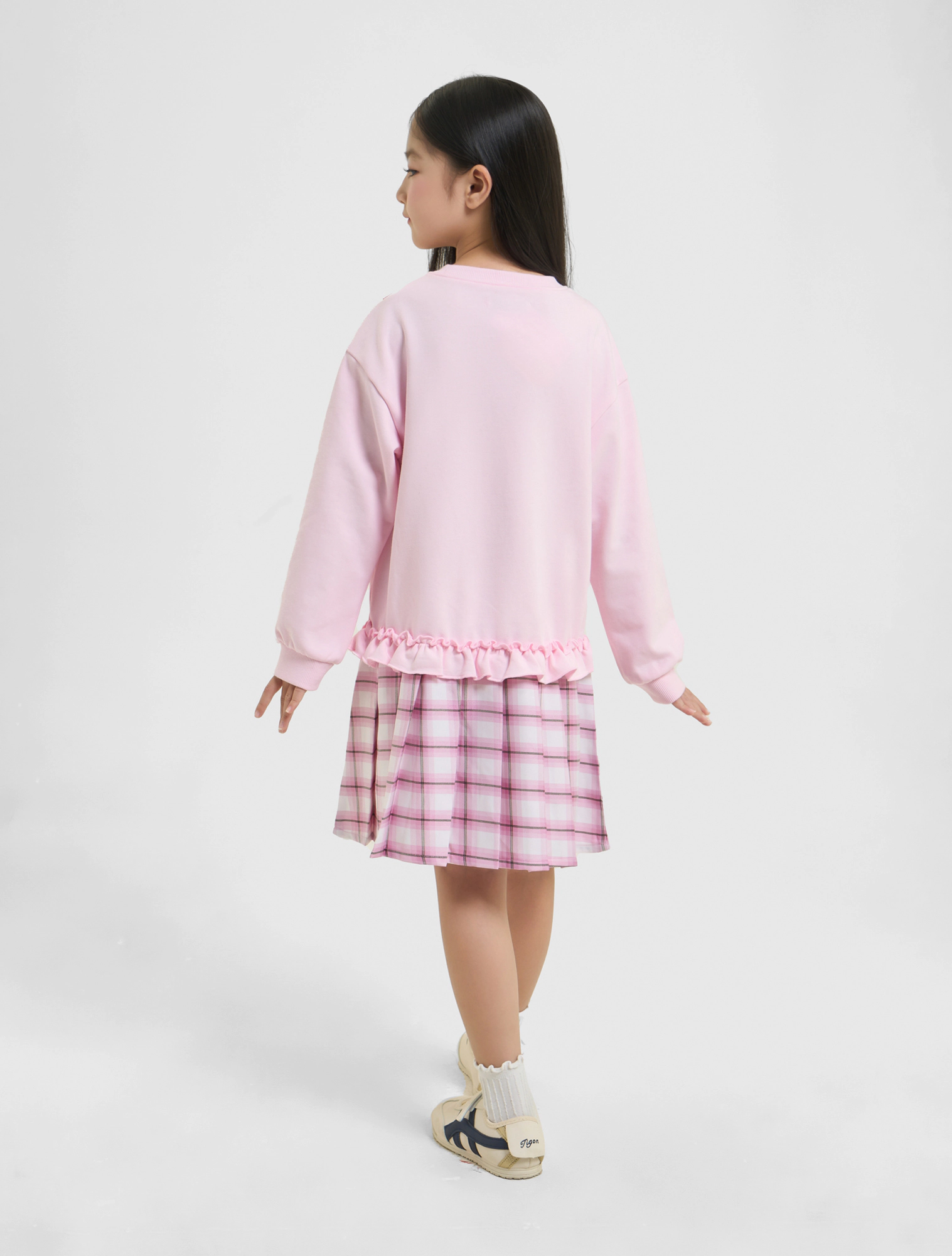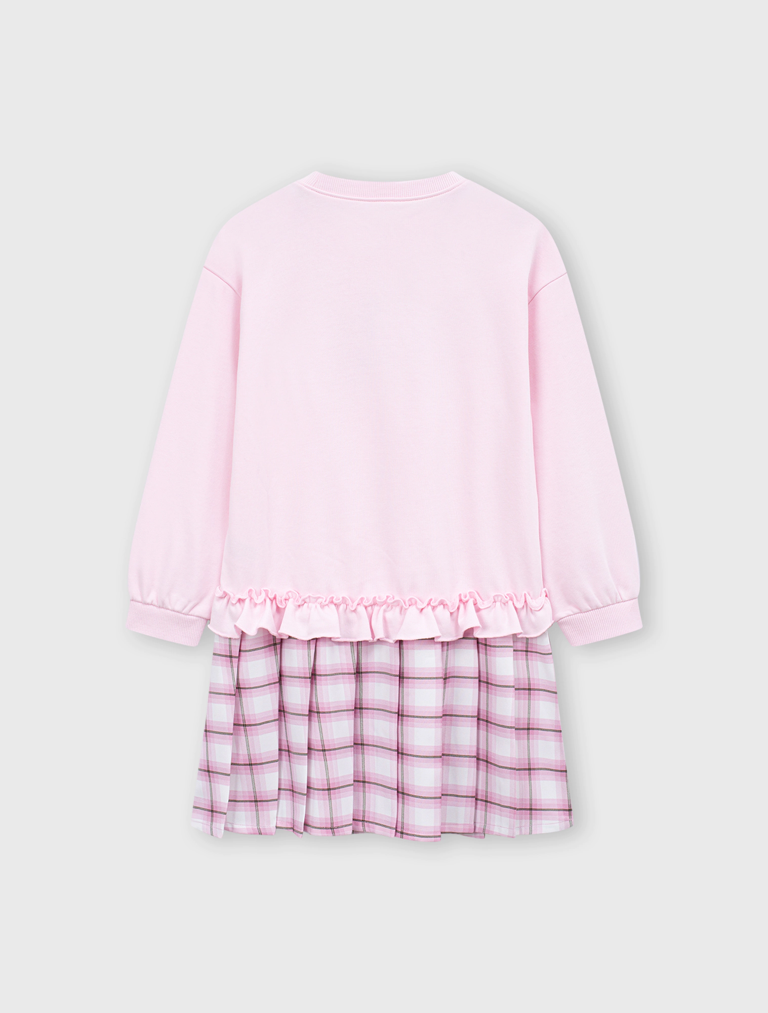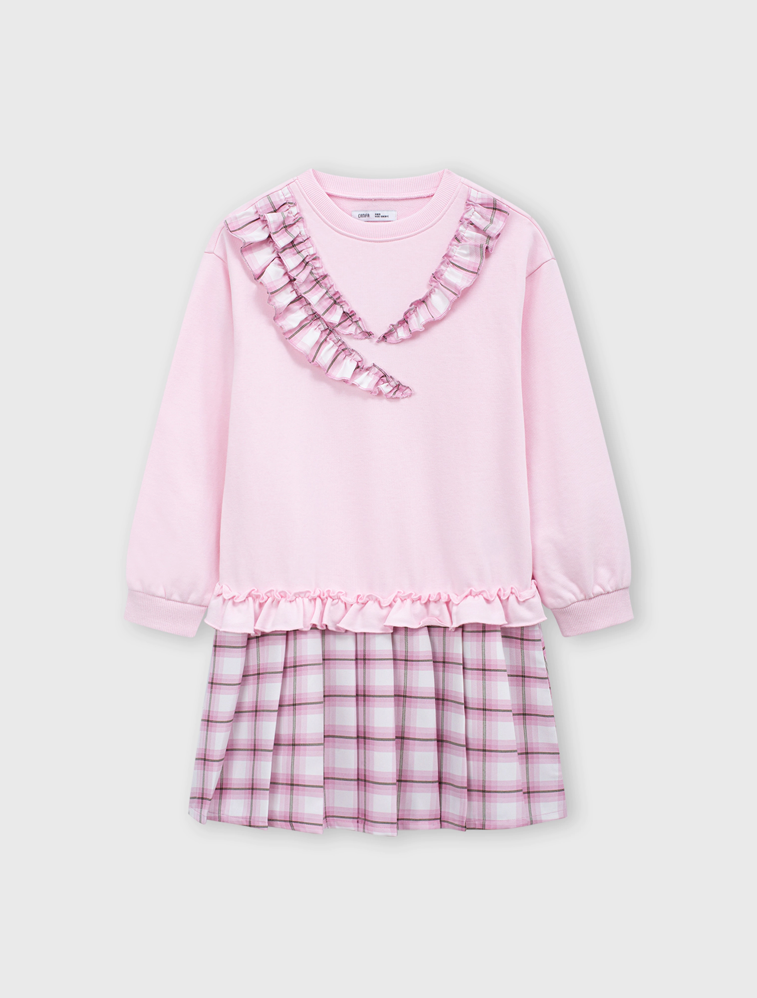 Váy liền bé gái dài tay dáng suông phối vải kẻ tạo sự sự nữ tính với chi tiết bèo, xếp li.