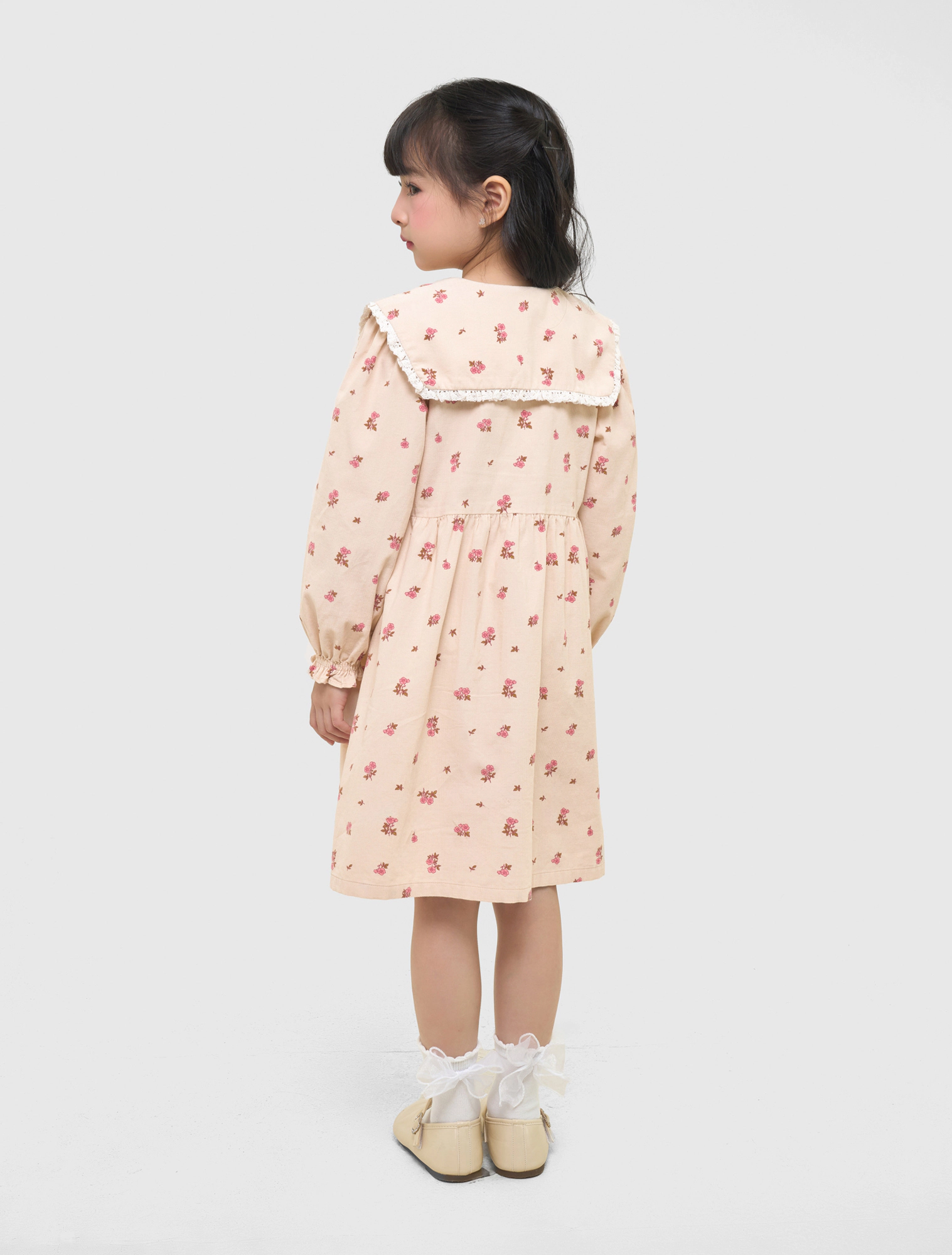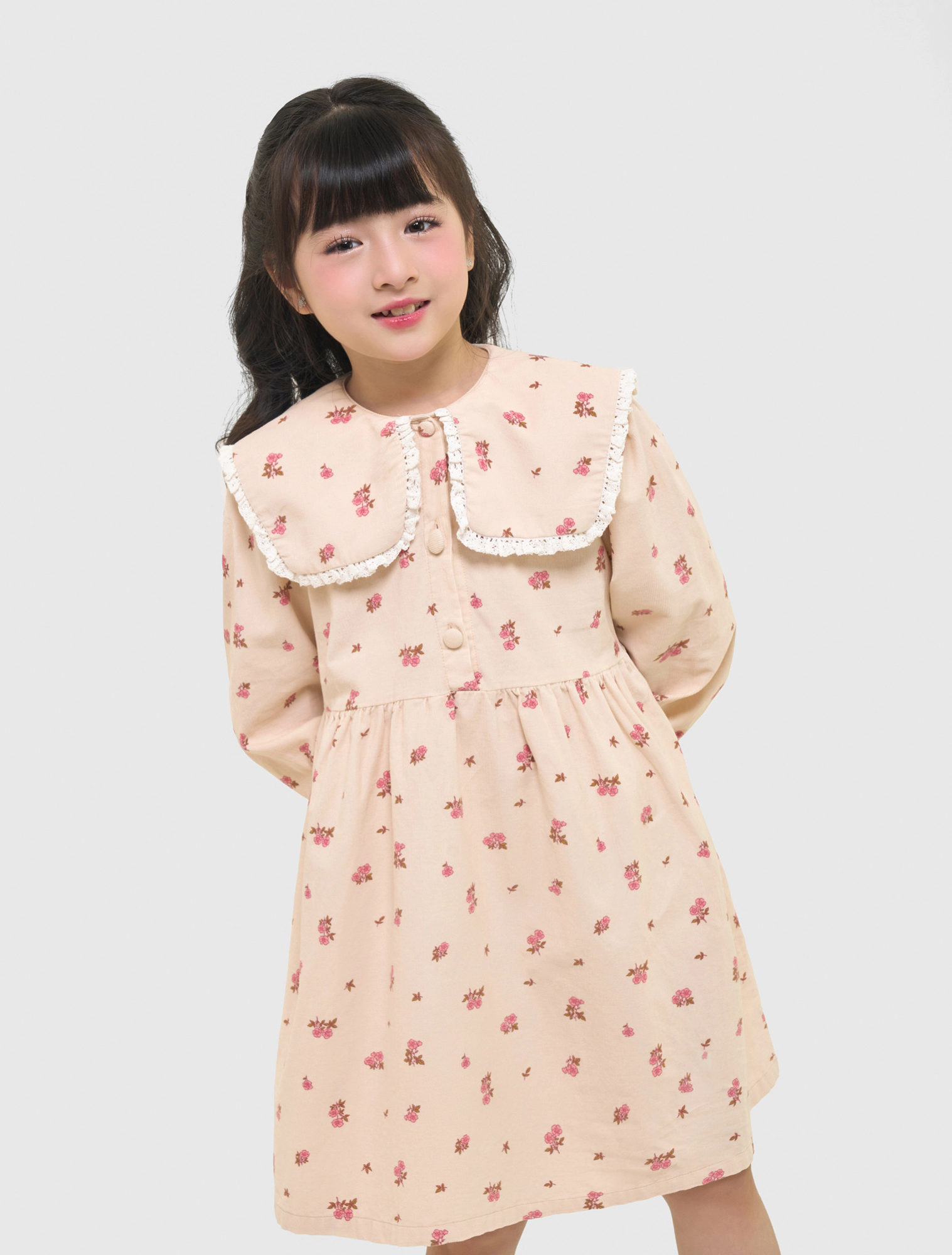 Váy liền bé gái hoạ tiết. Cổ áo to bản tạo sự sự nữ tính với chi tiết bèo ren.