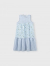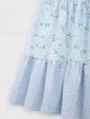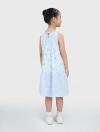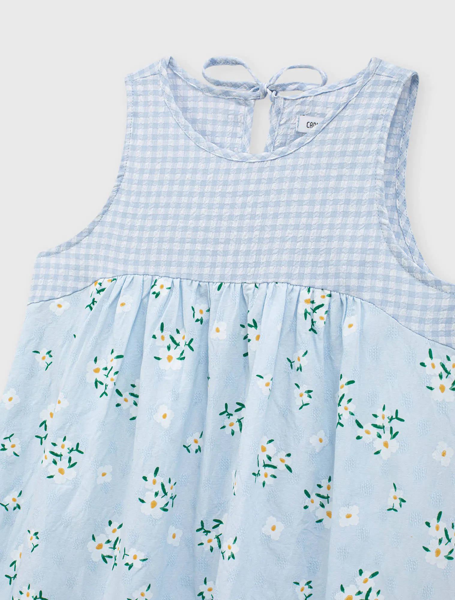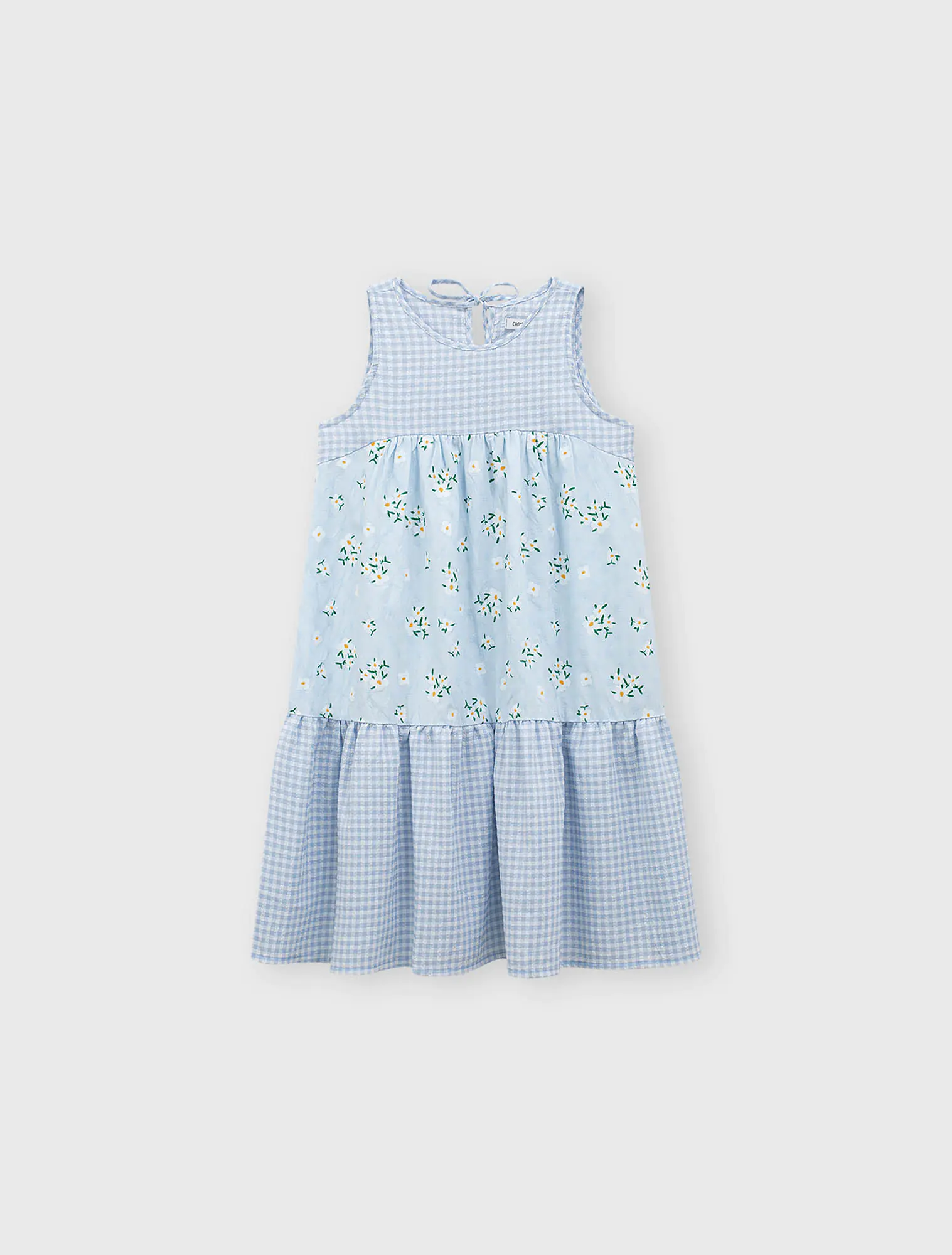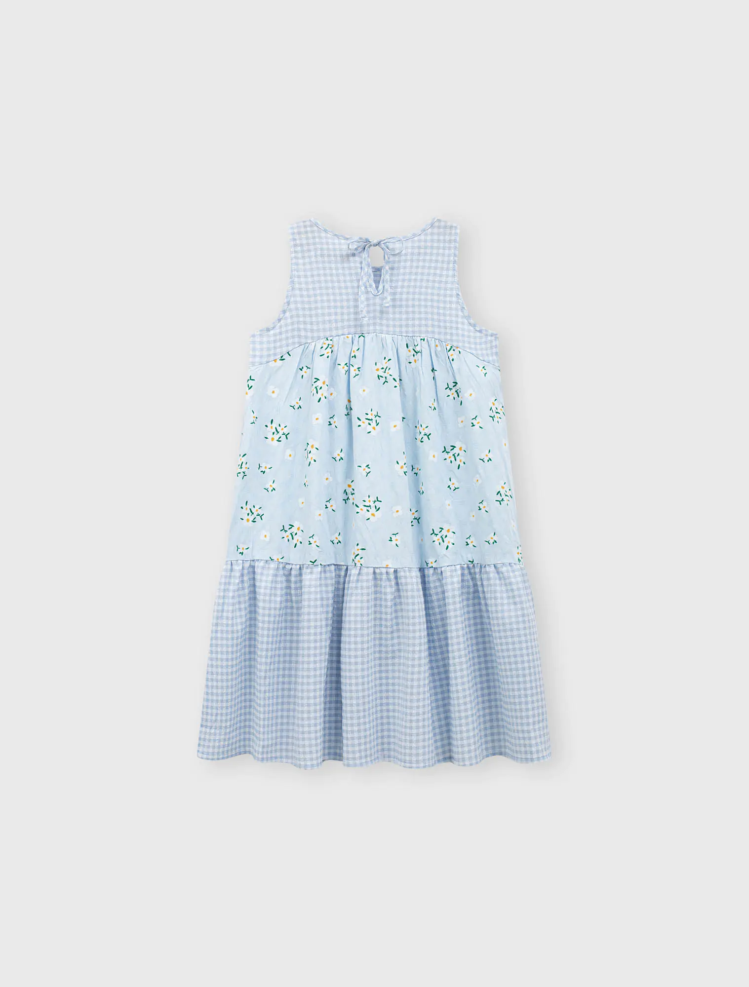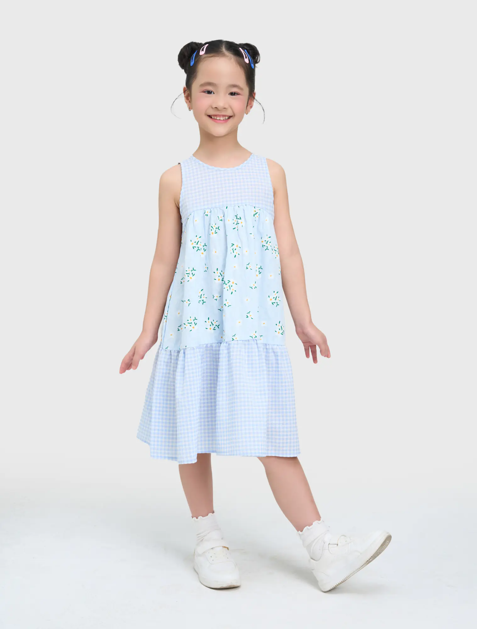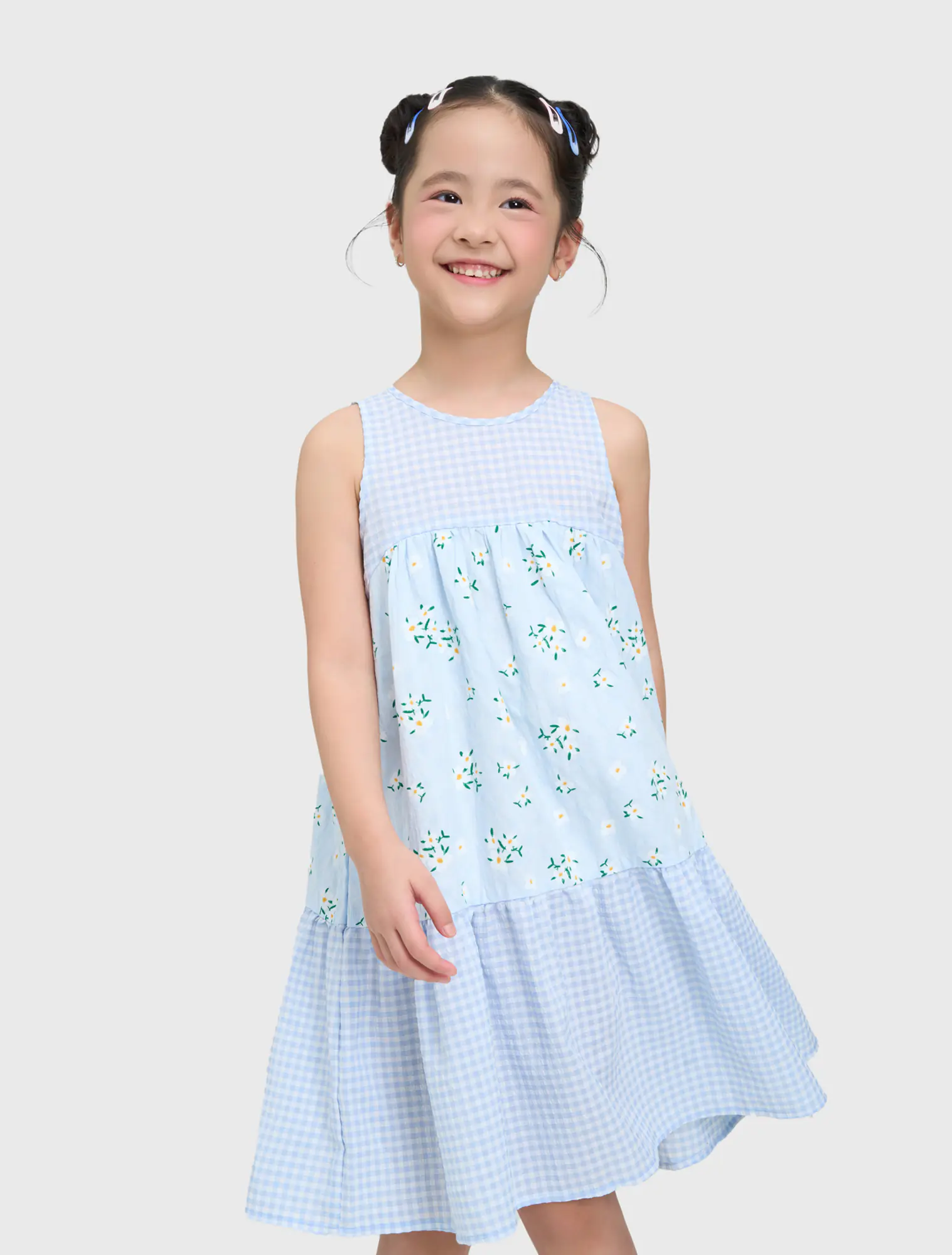 Váy liền bé gái kiểu cổ yếm. Váy dệt thoi có chi tiết bèo và phối vải. Phù hợp với các bé gái thích sự nữ tính.
