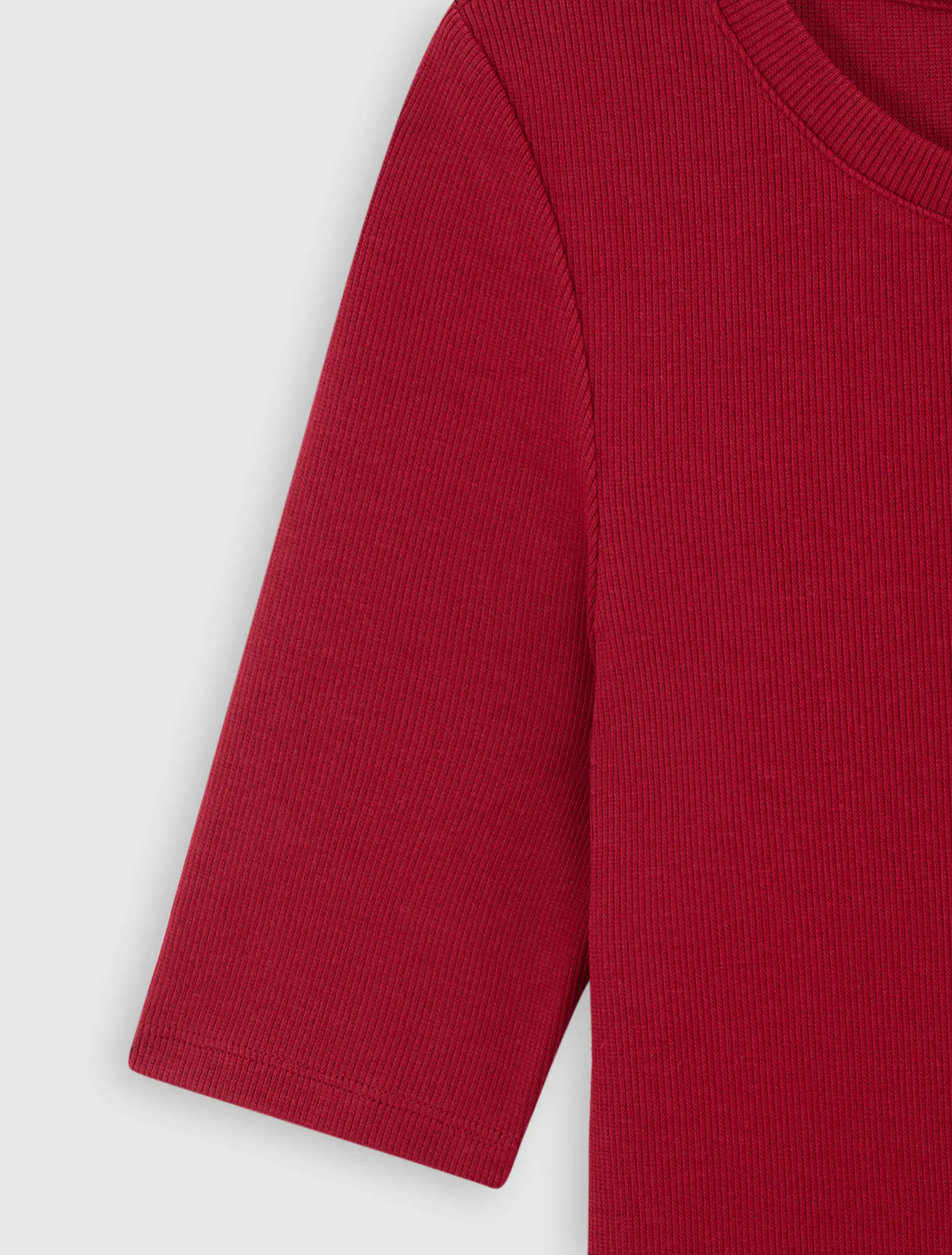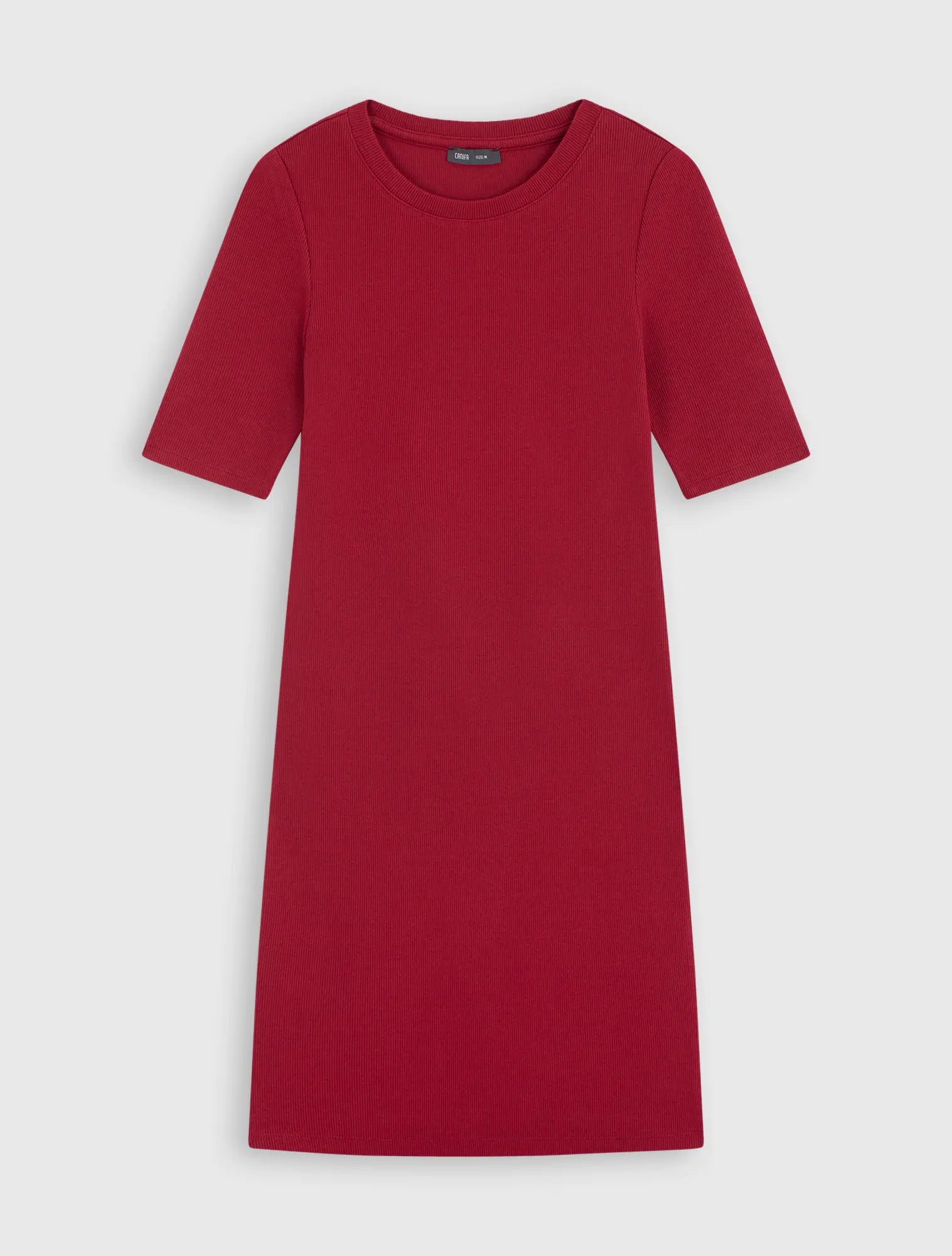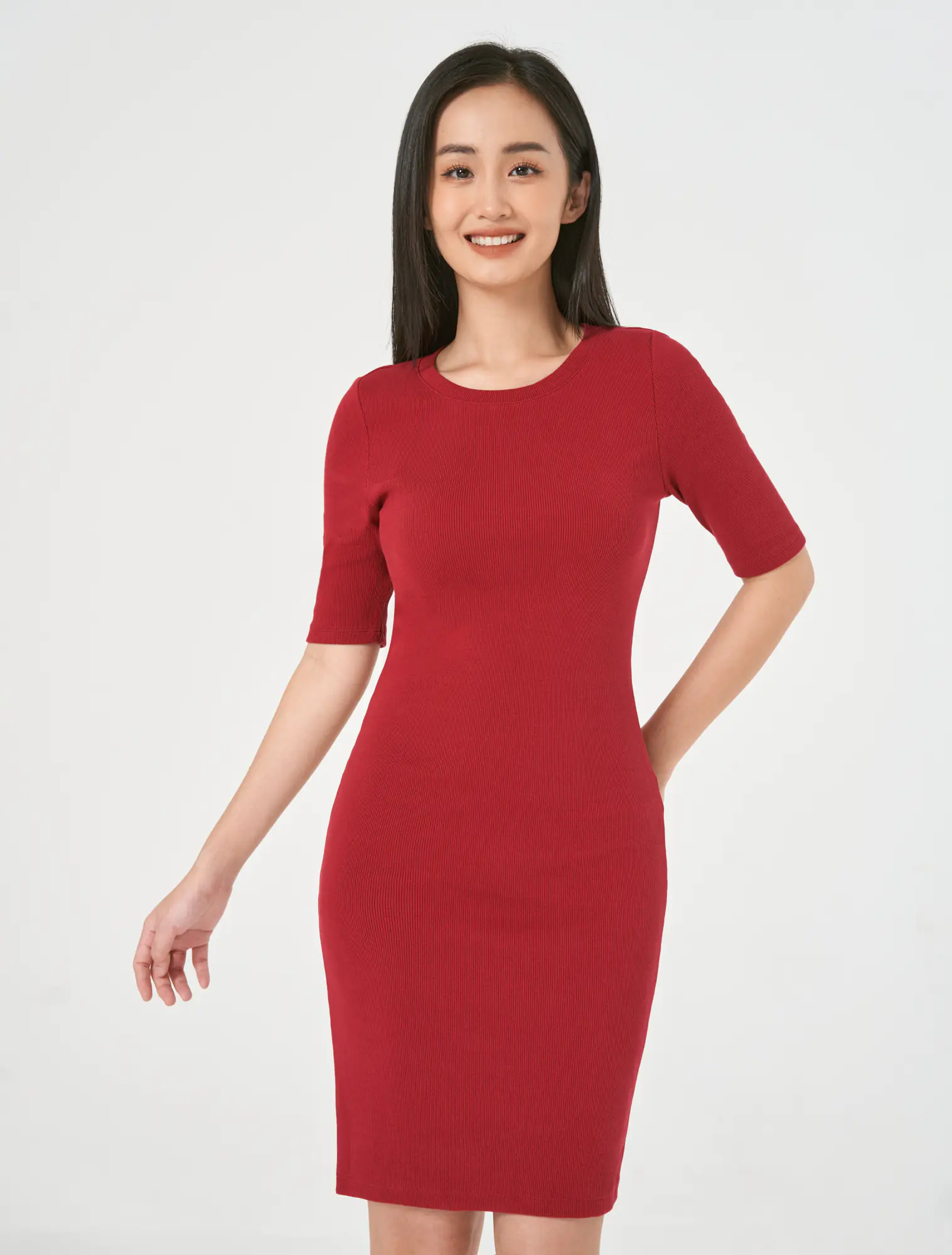 Váy liền chất liệu cotton co giãn, cổ tròn tay cộc, dáng ôm.